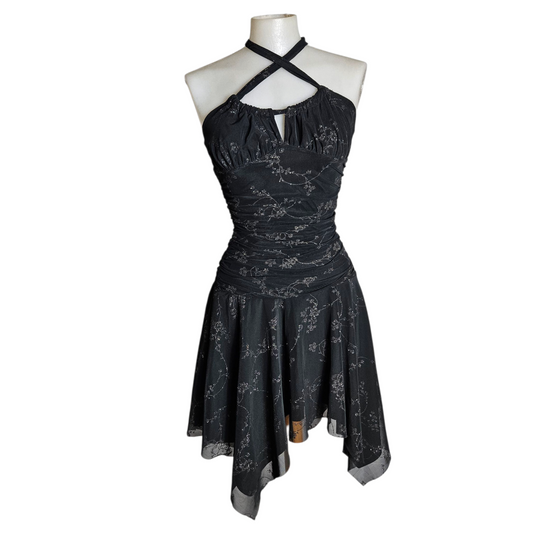 Robe asymétrique motif floral argenté