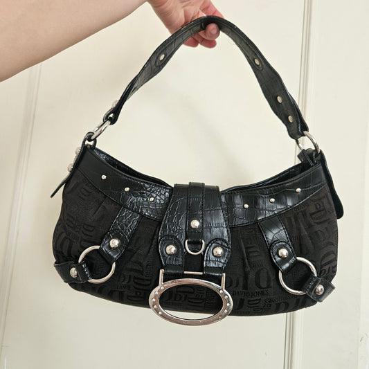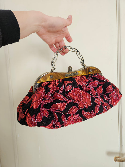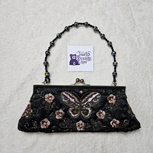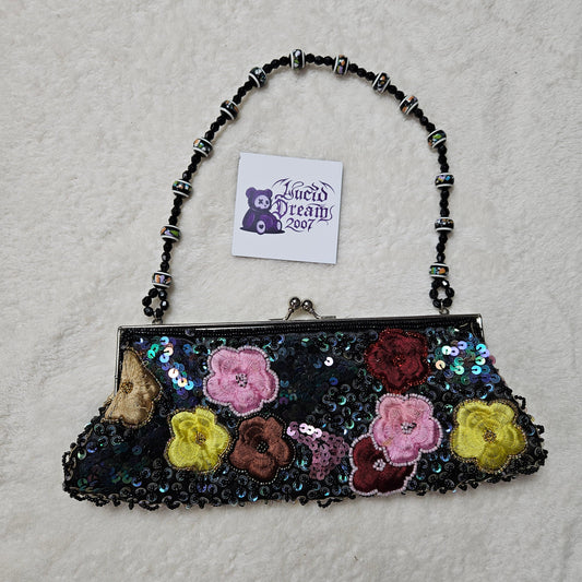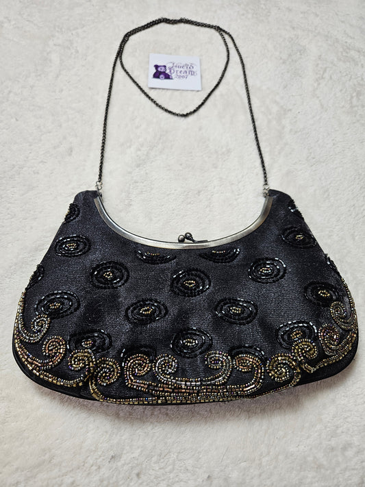 Black satchel embroidered with beads and sequins