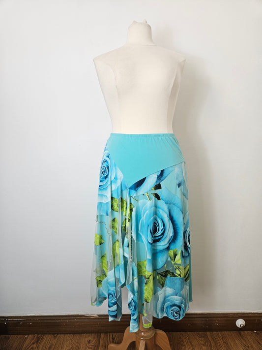 Asymmetrical blue skirt with floral pattern