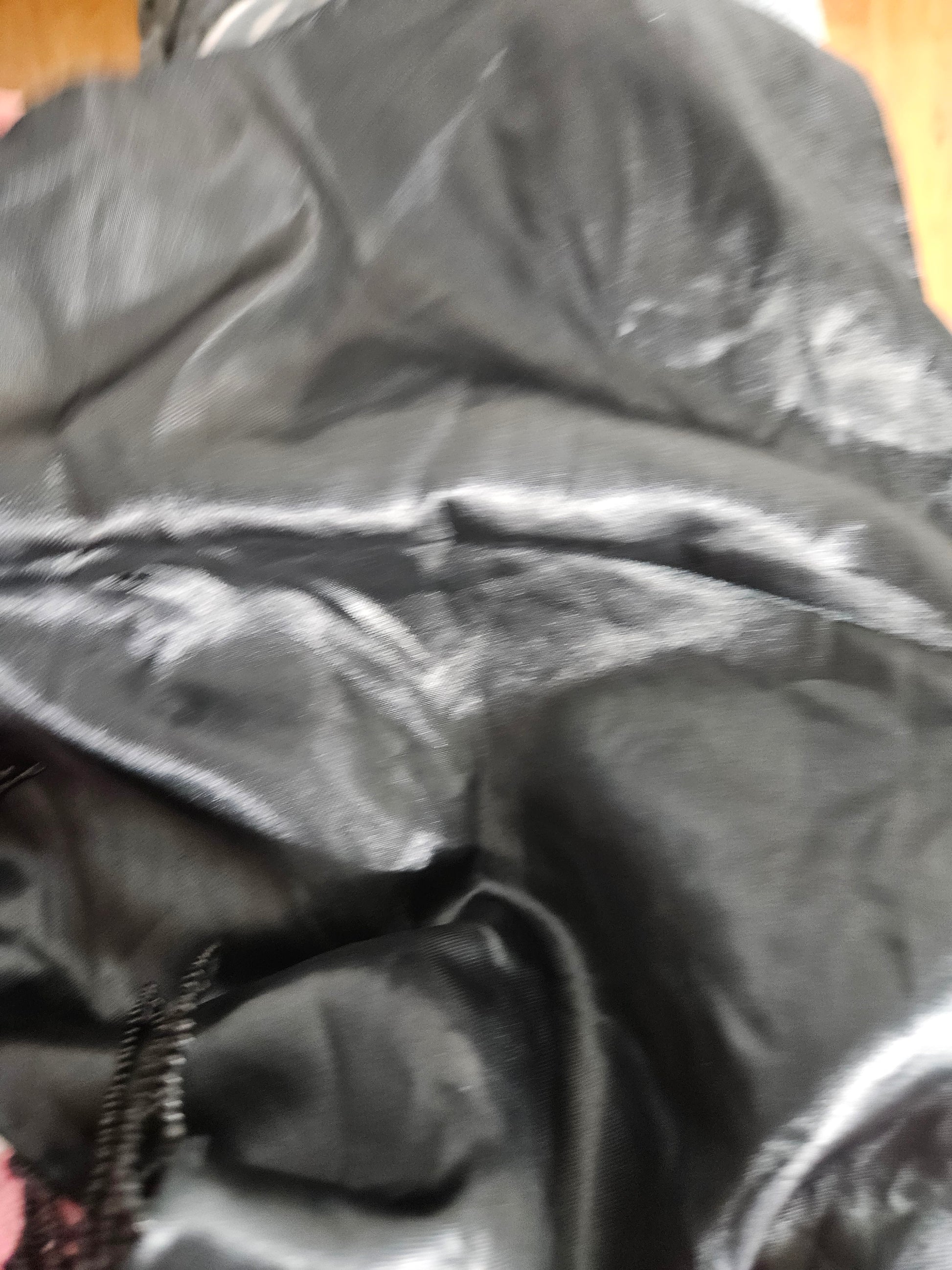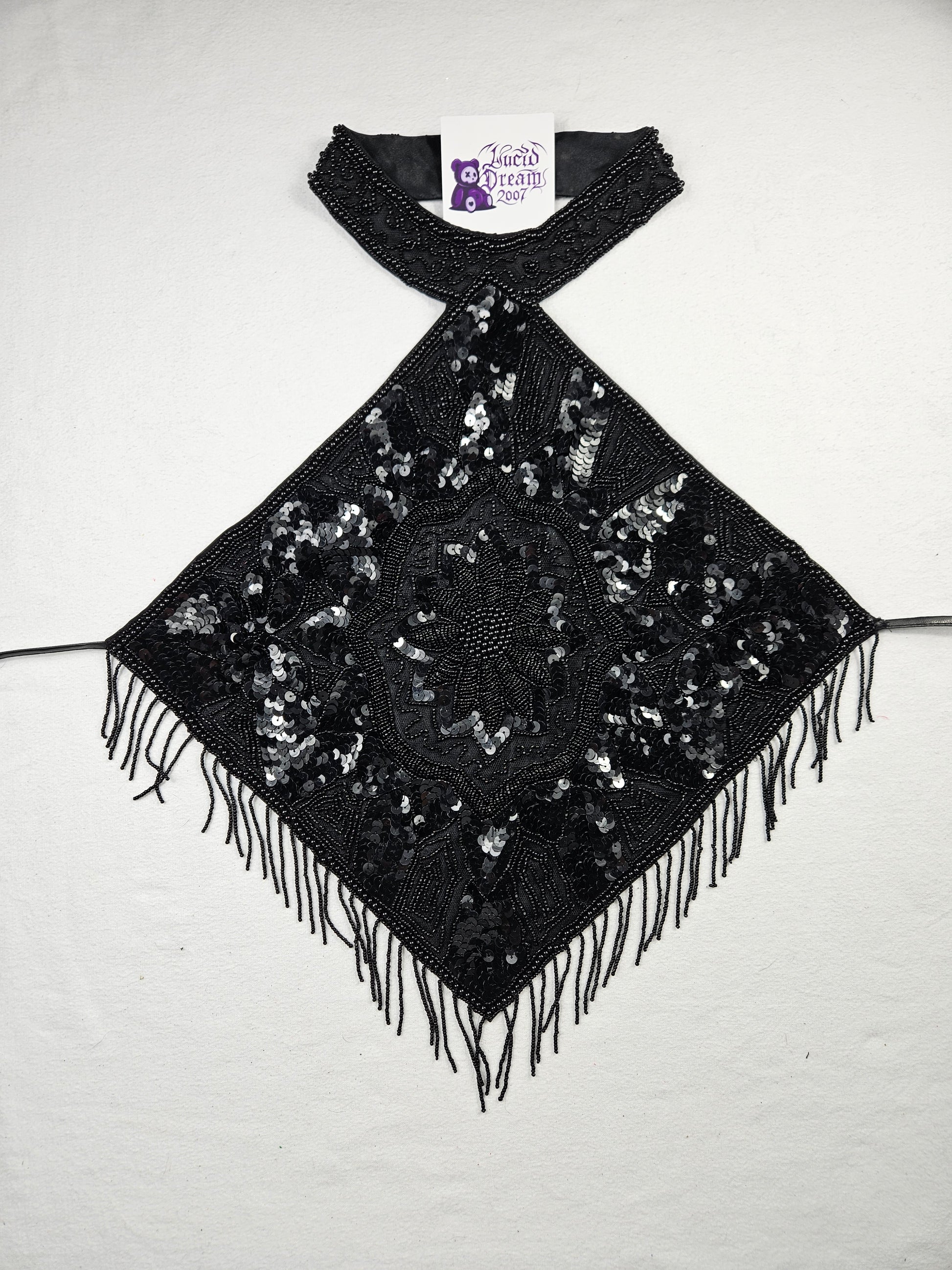 - The cut is structured and diamond-shaped at the front, with beaded fringes at the bottom that add movement.
