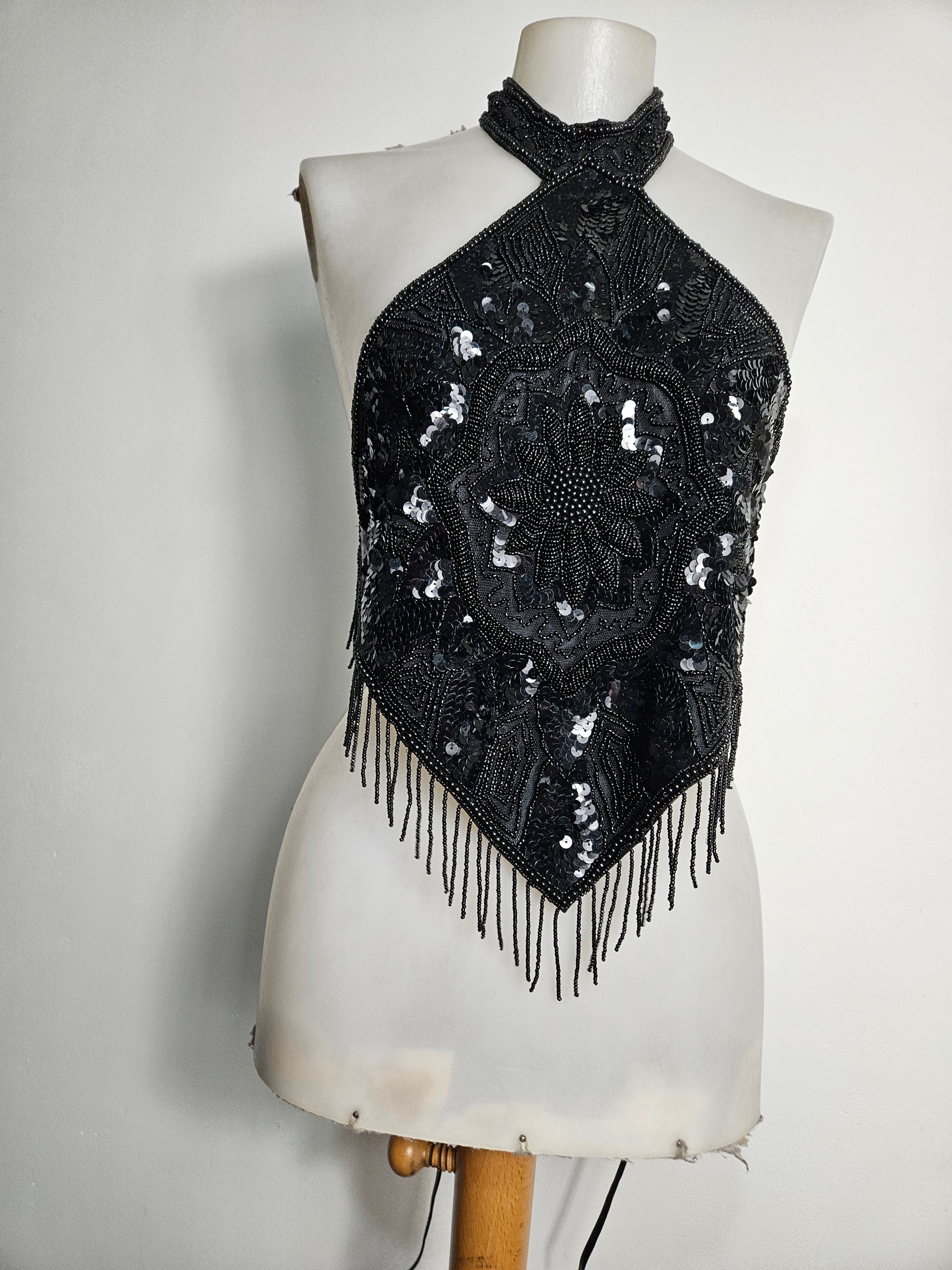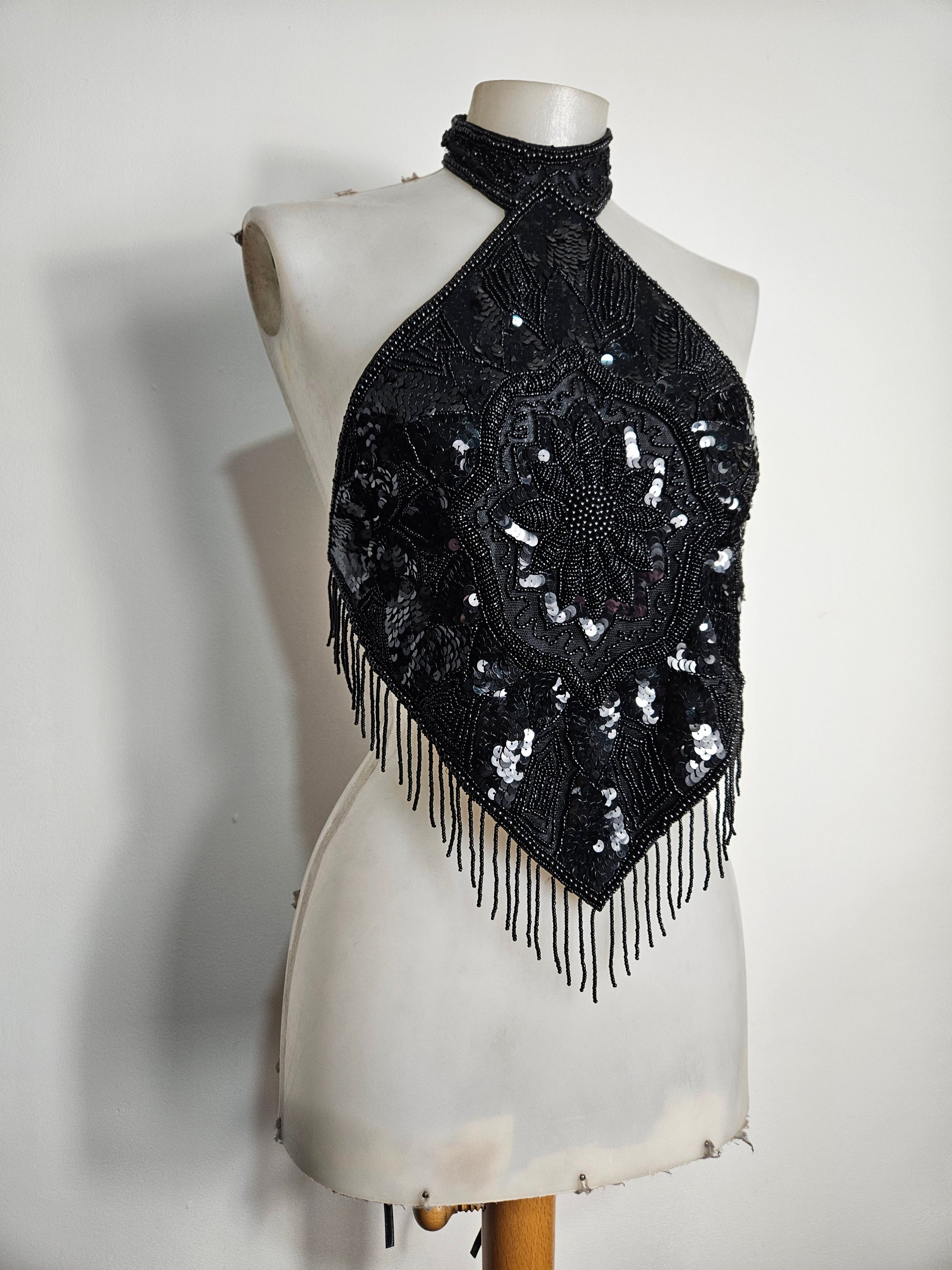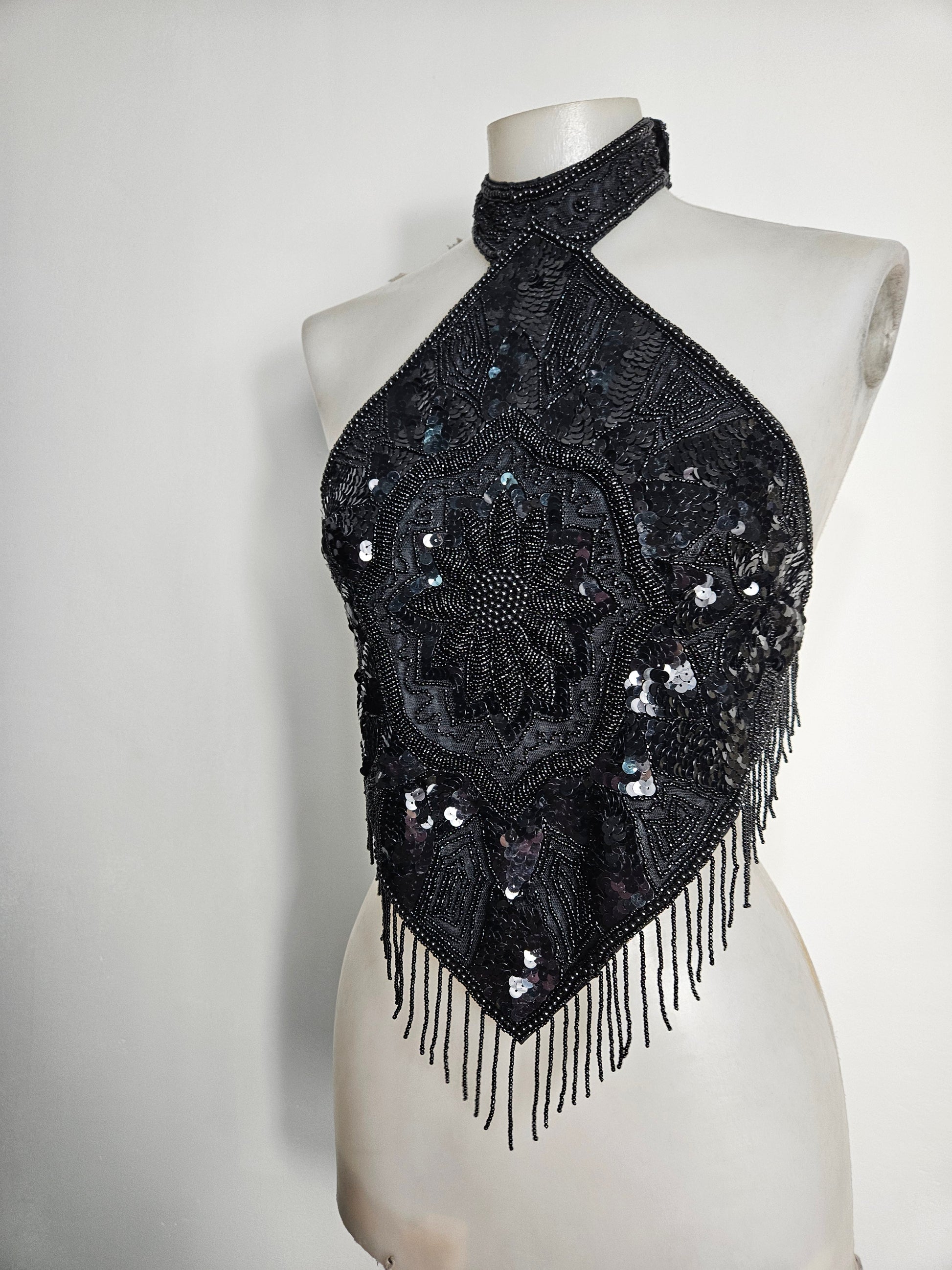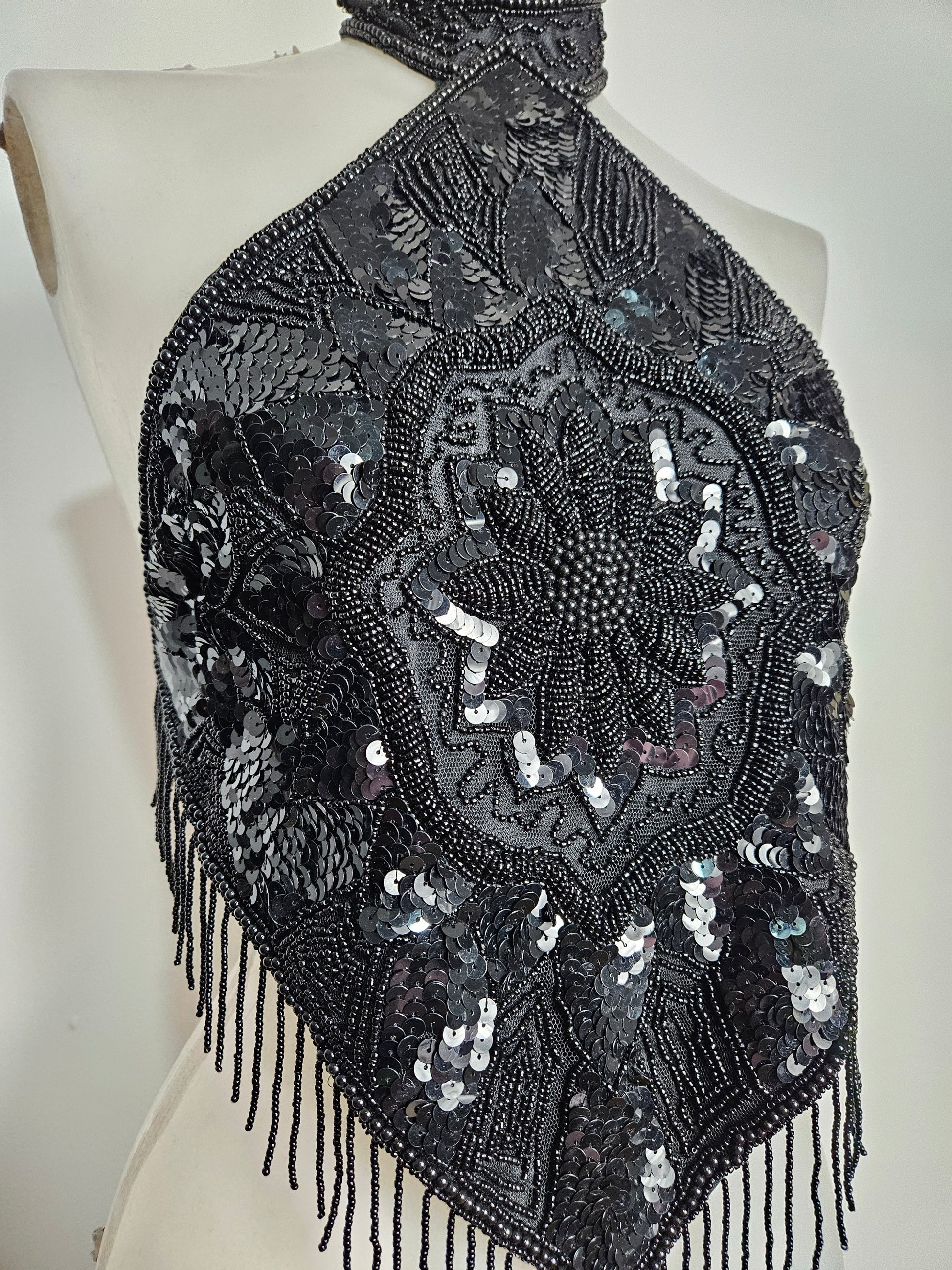 - The piece is entirely embroidered with beads and sequins forming geometric and floral patterns.