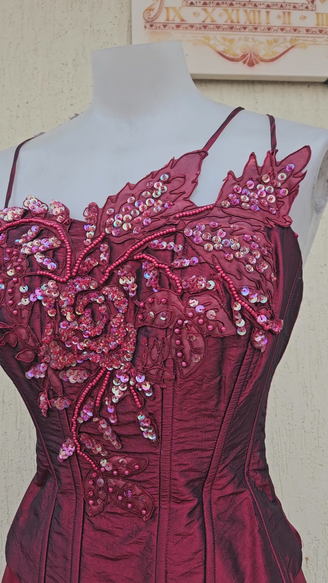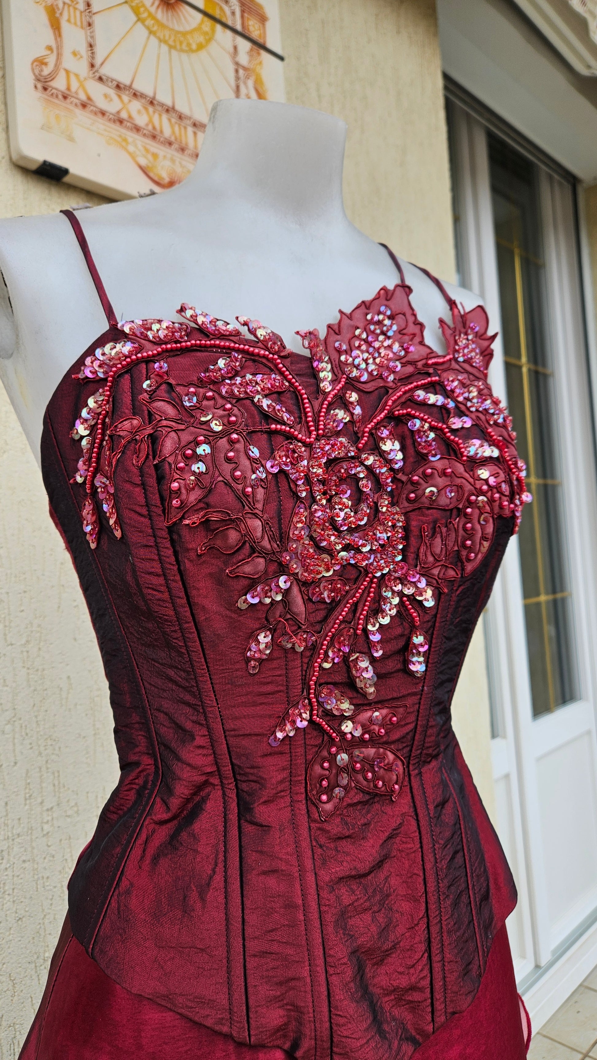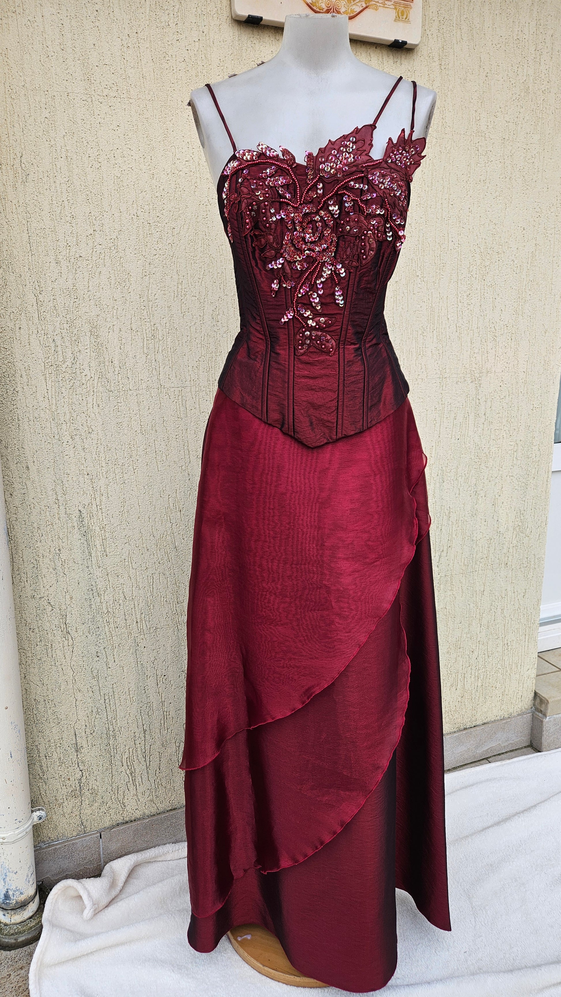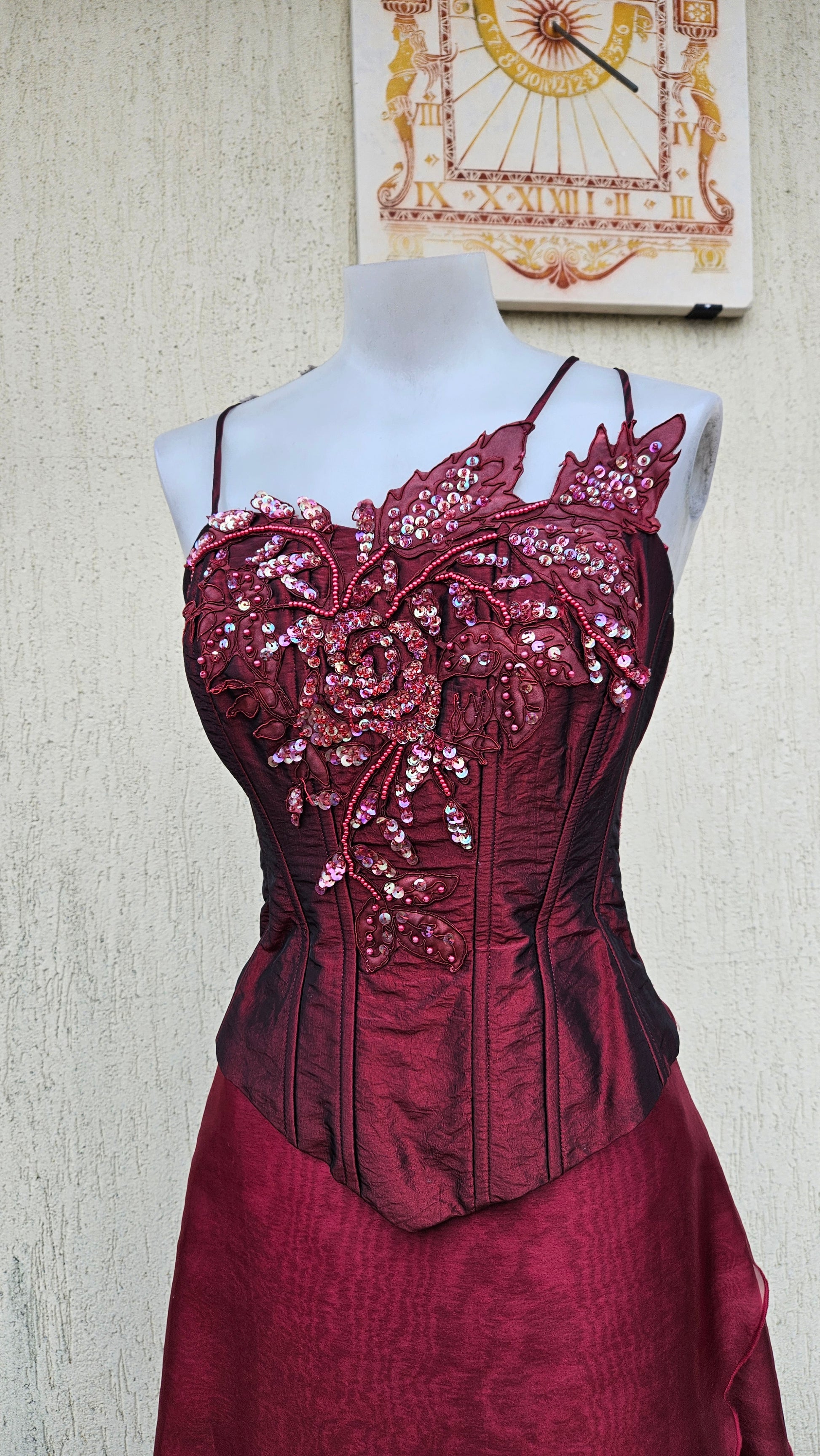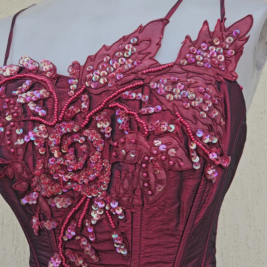 Two-piece set consisting of a corset and a matching long skirt. Burgundy corset with thin straps, fitted and structured cut, with visible vertical boning. Embroidered and beaded embellishments on the bust, floral and decorative motifs in relief.