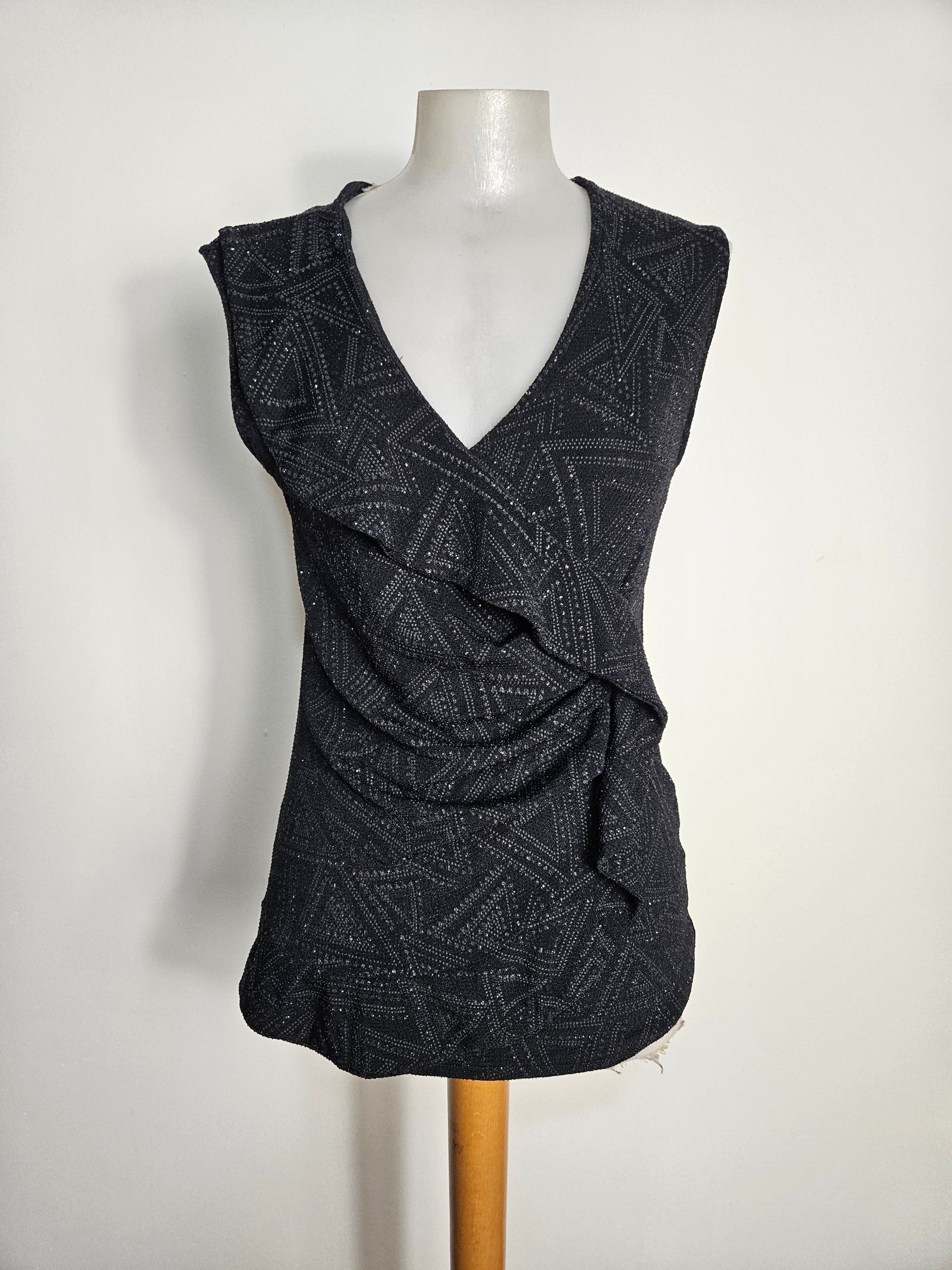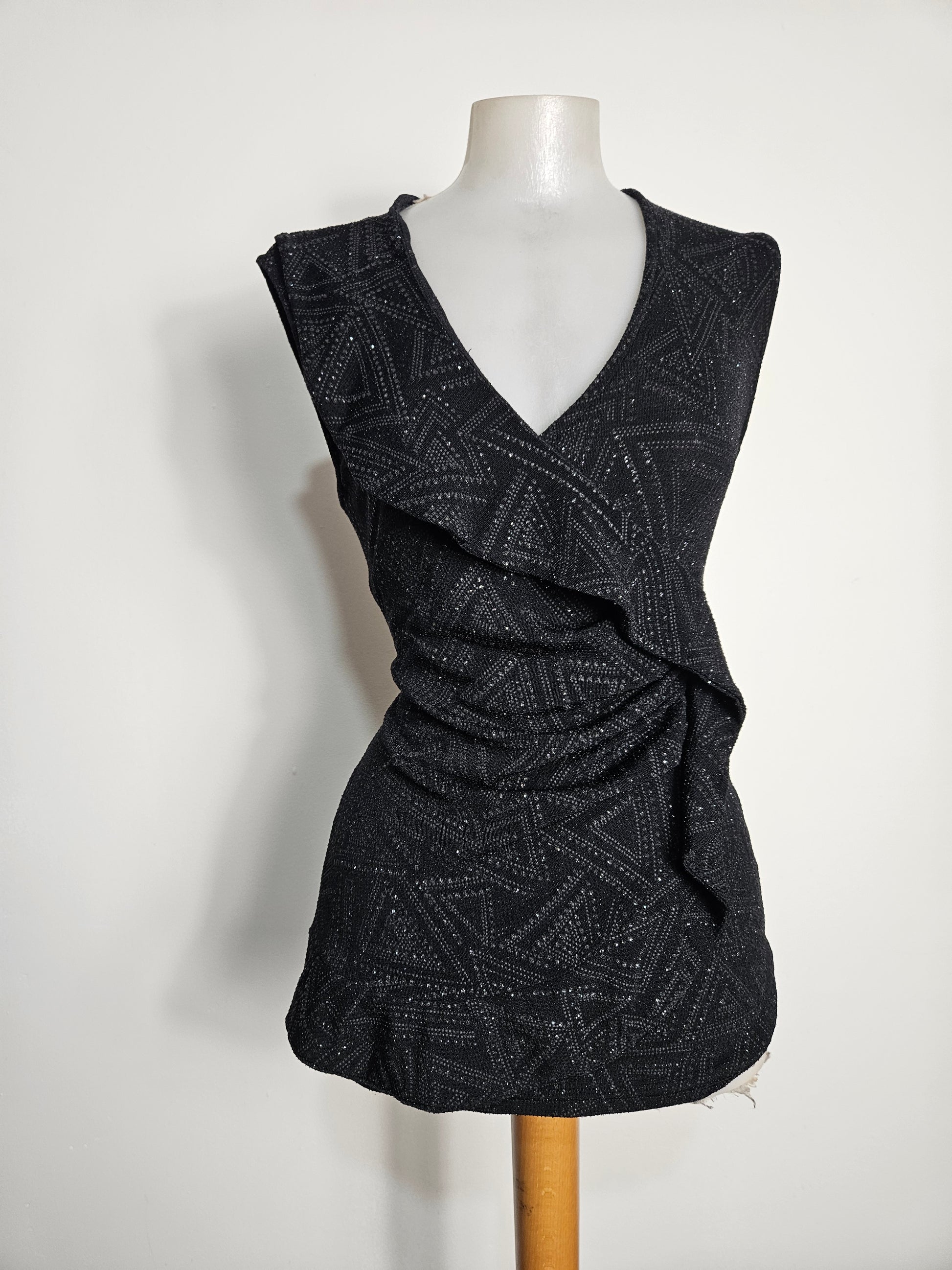 - Black fitted top with abstract silver rhinestone patterns.