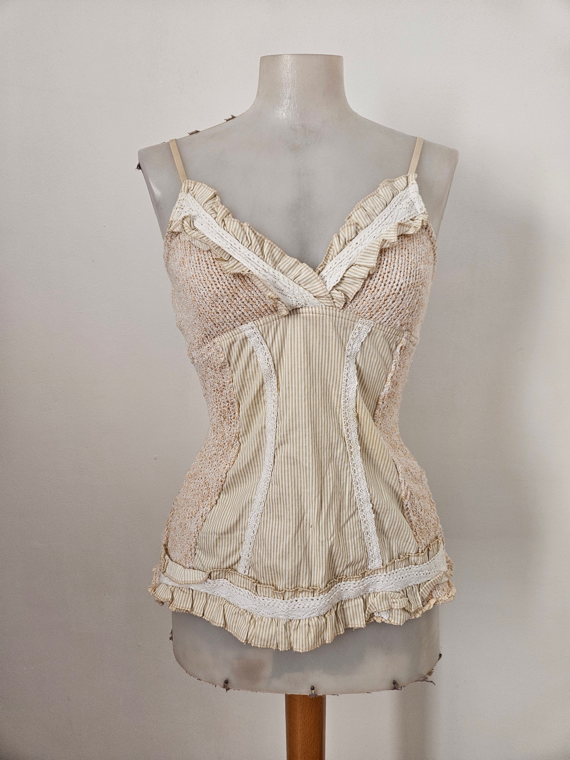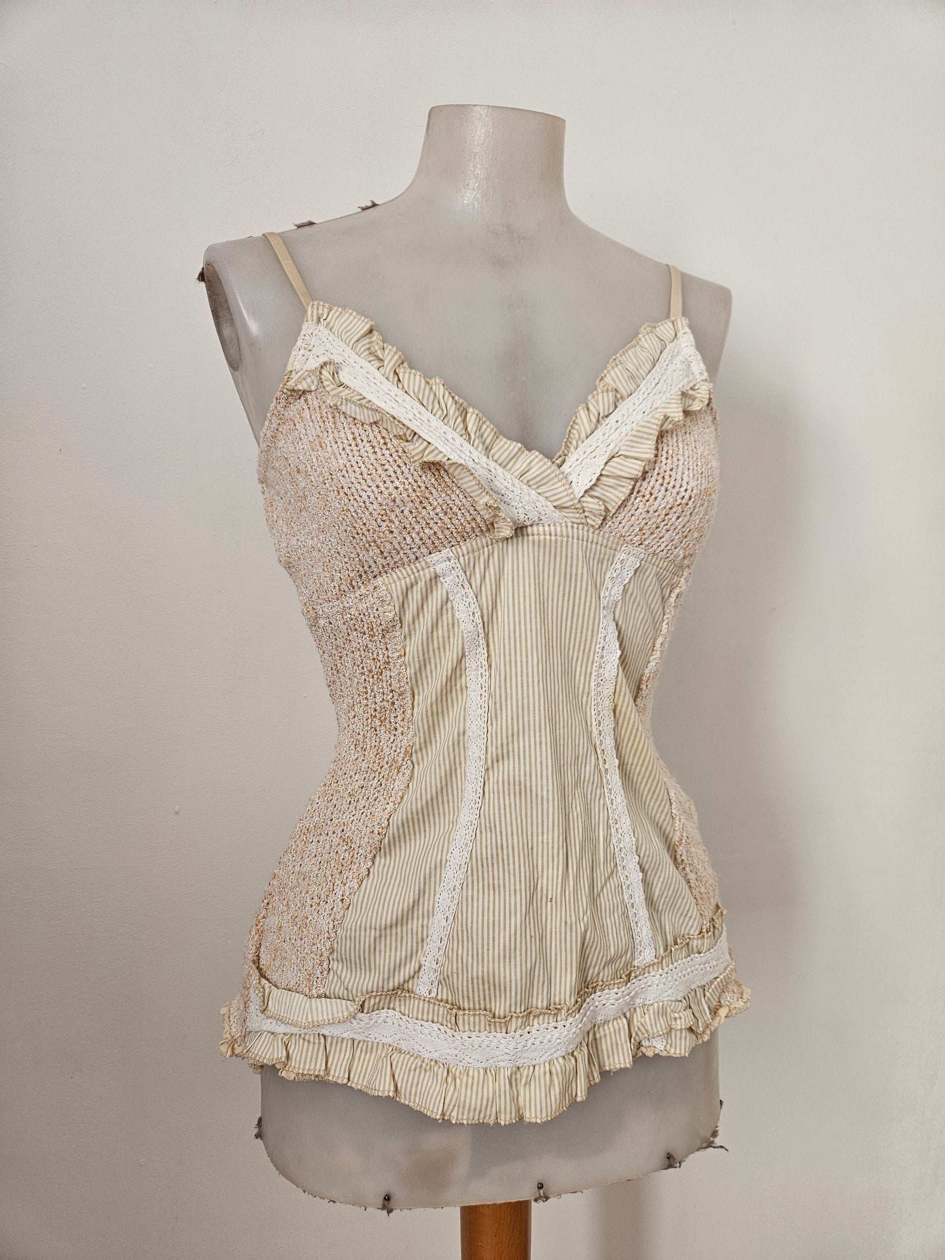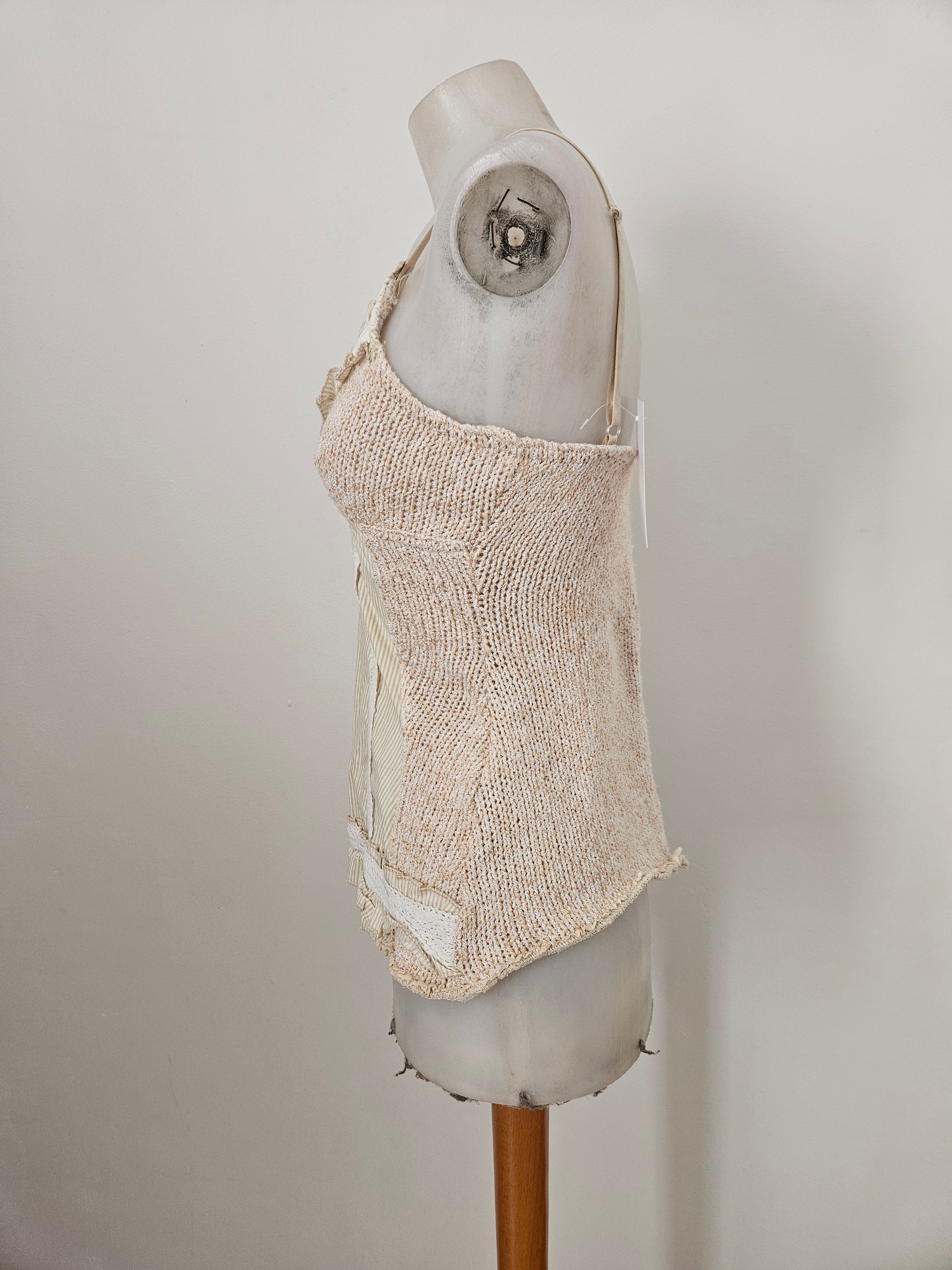 With a thicker beige section on the sides and thinner striped fabric at the chest and stomach.
