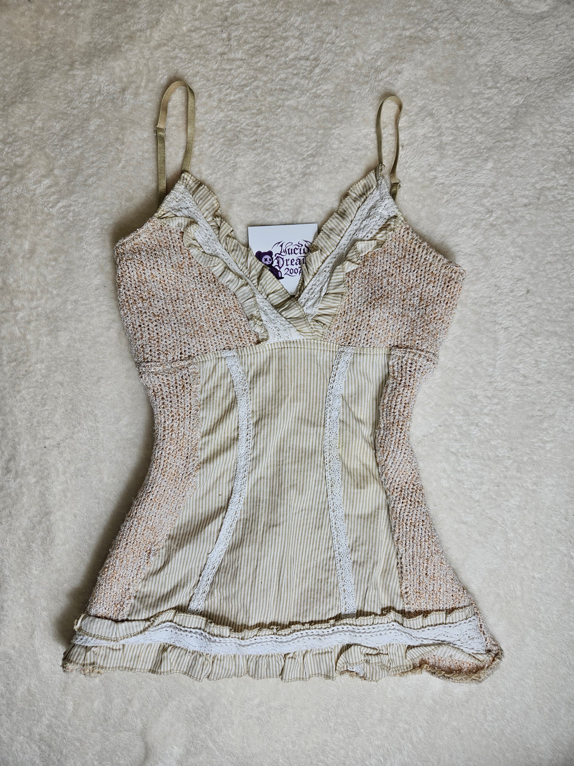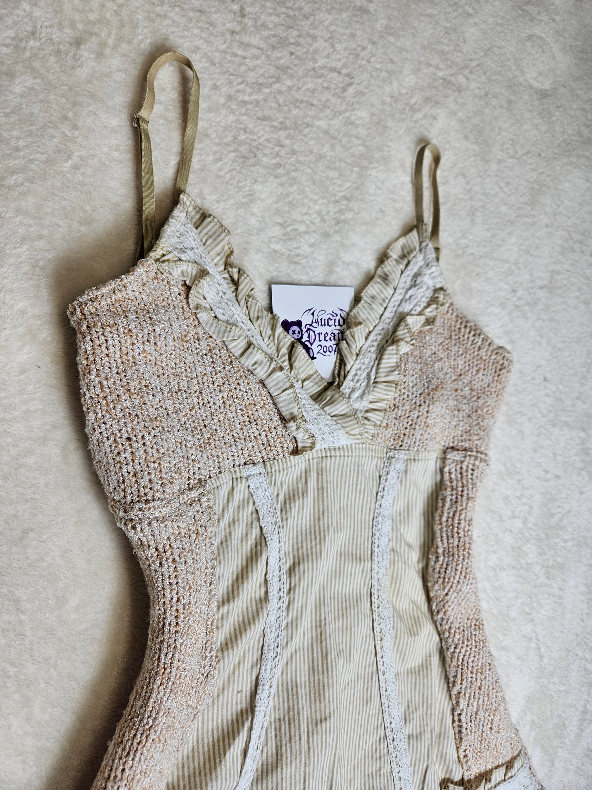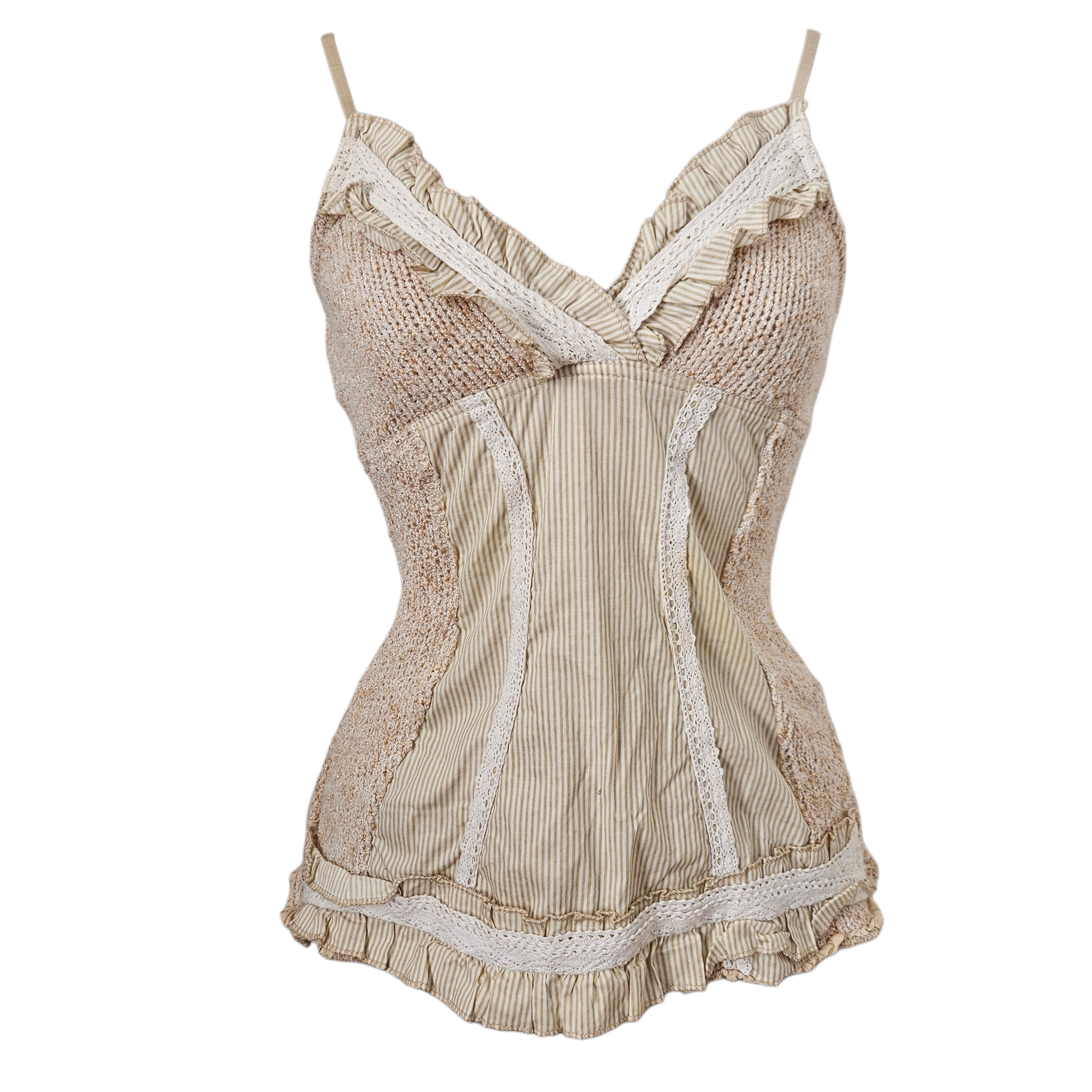 With a thicker beige section on the sides and thinner striped fabric at the chest and stomach.
