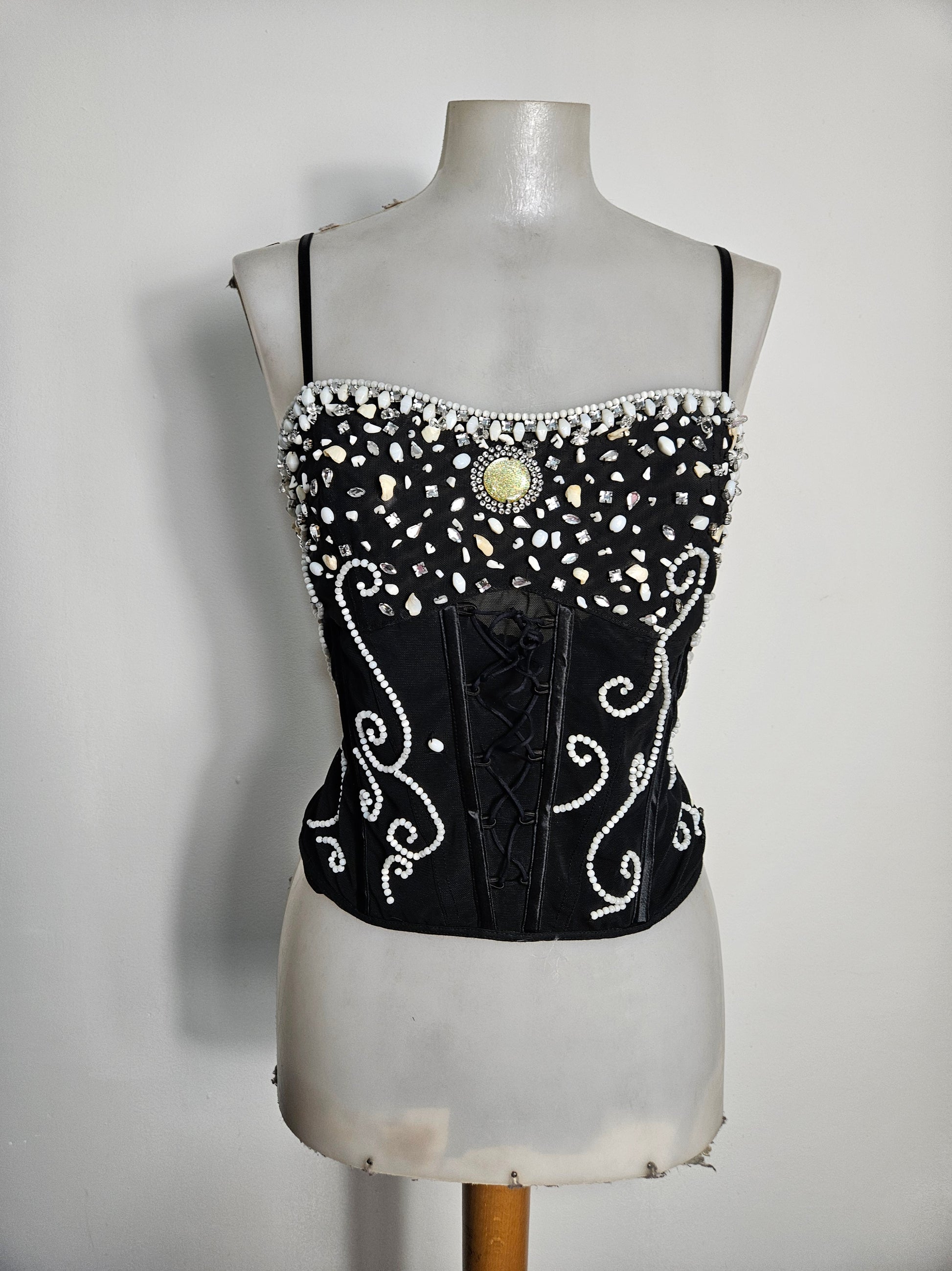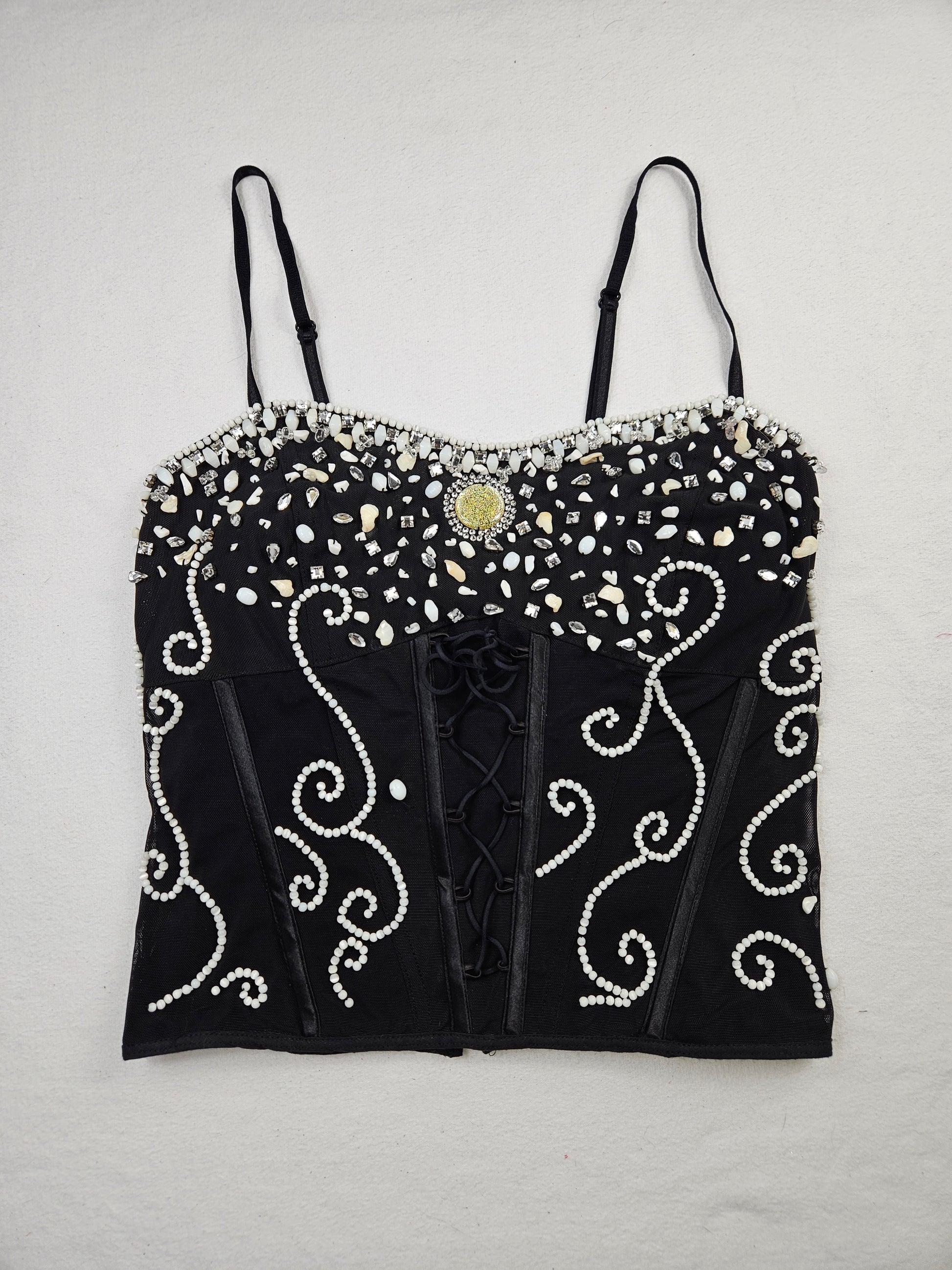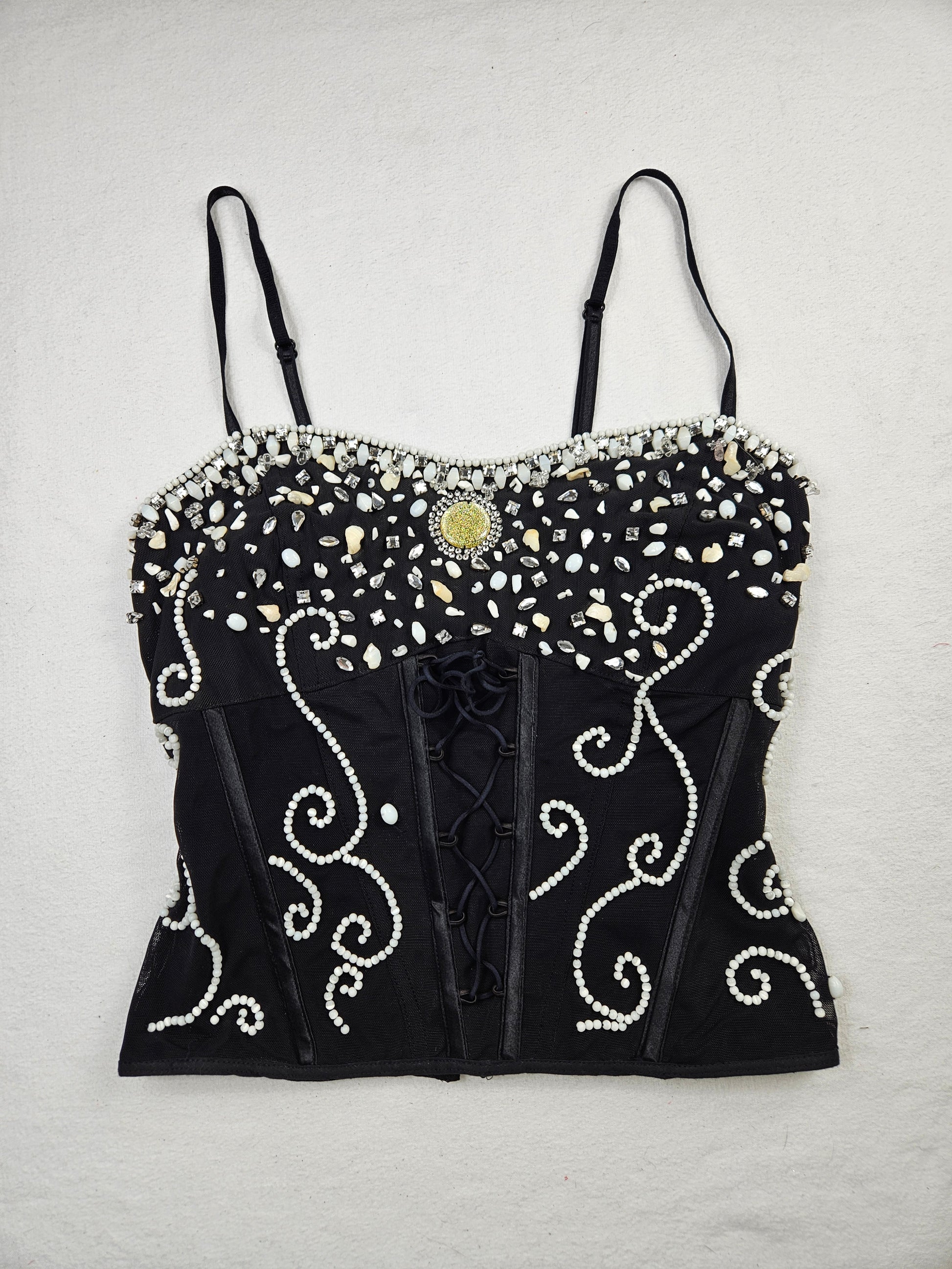 - Vintage black corset entirely adorned with pearls, stones and rhinestones in white tones.