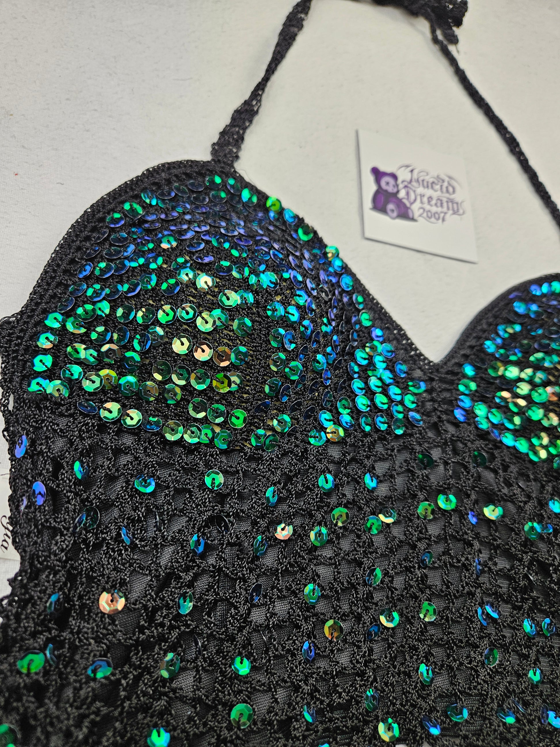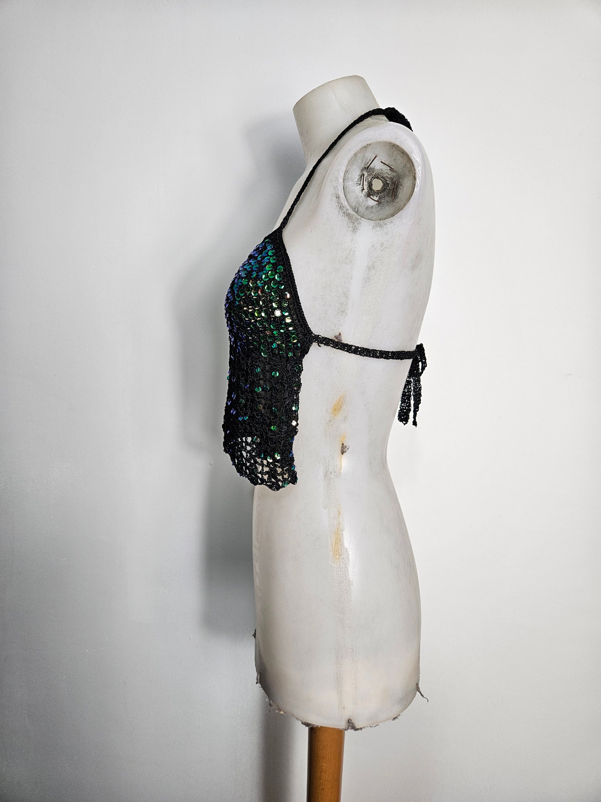 green and black sequined halter top