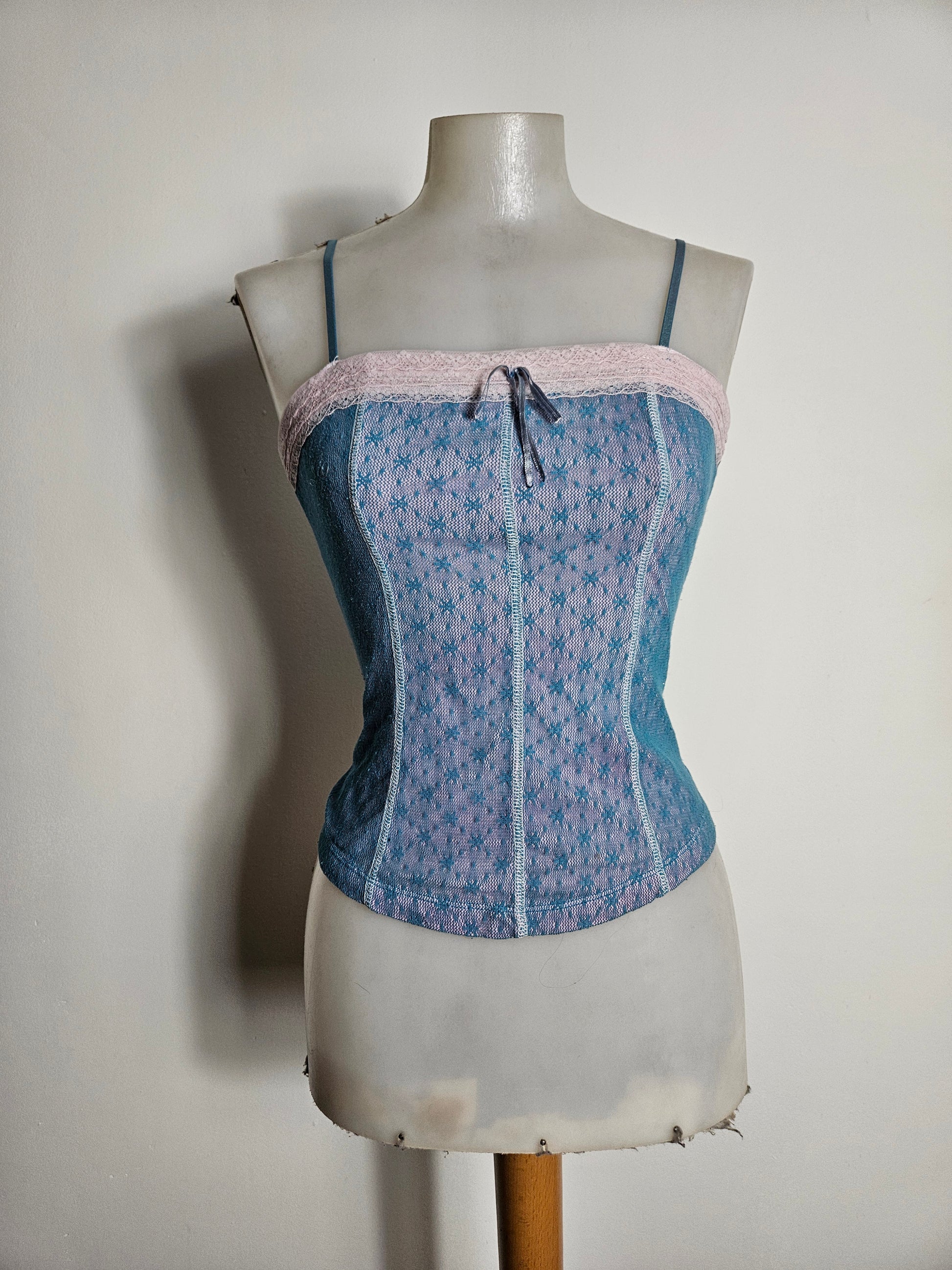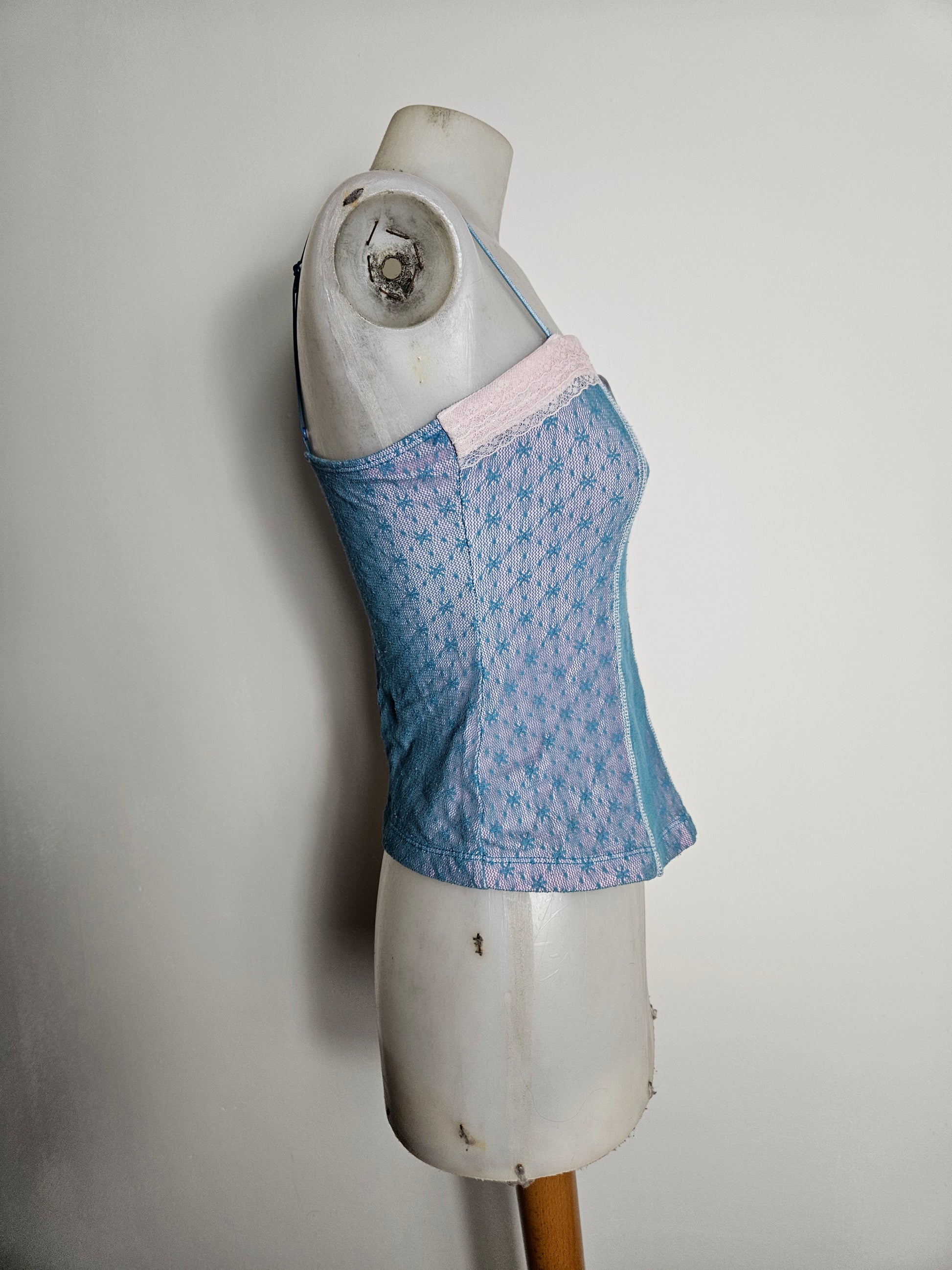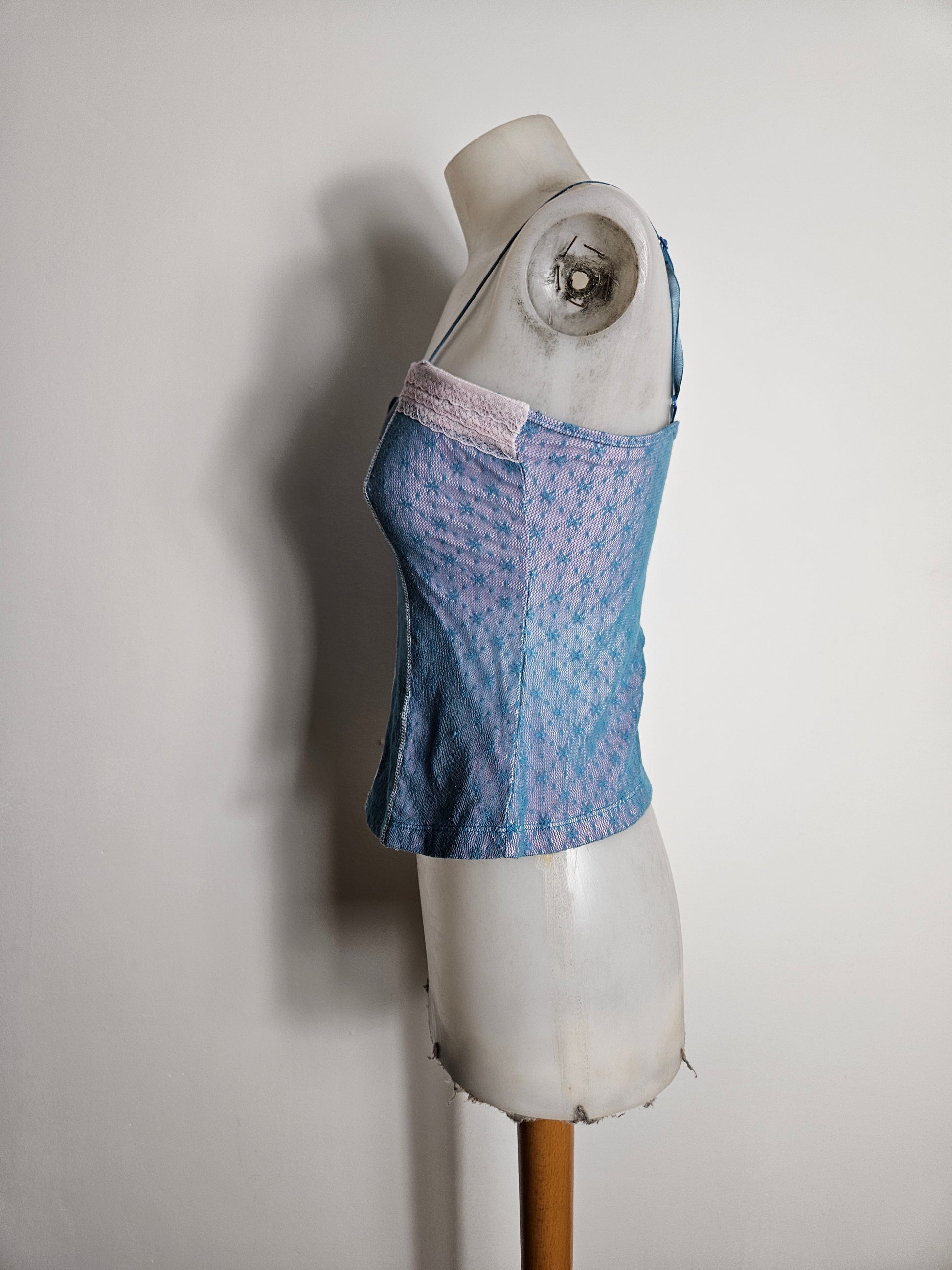 Blue camisole with thin straps and semi-transparent patterned mesh panels.