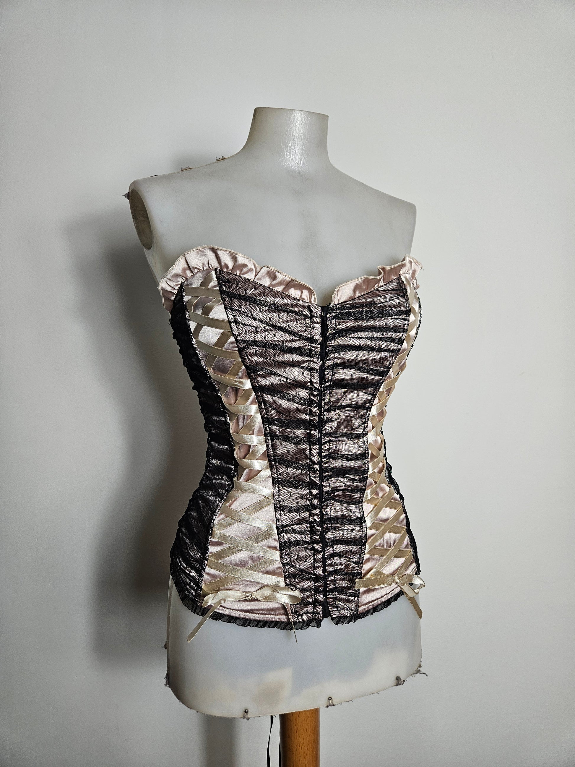 - Powder pink and black satin bustier corset