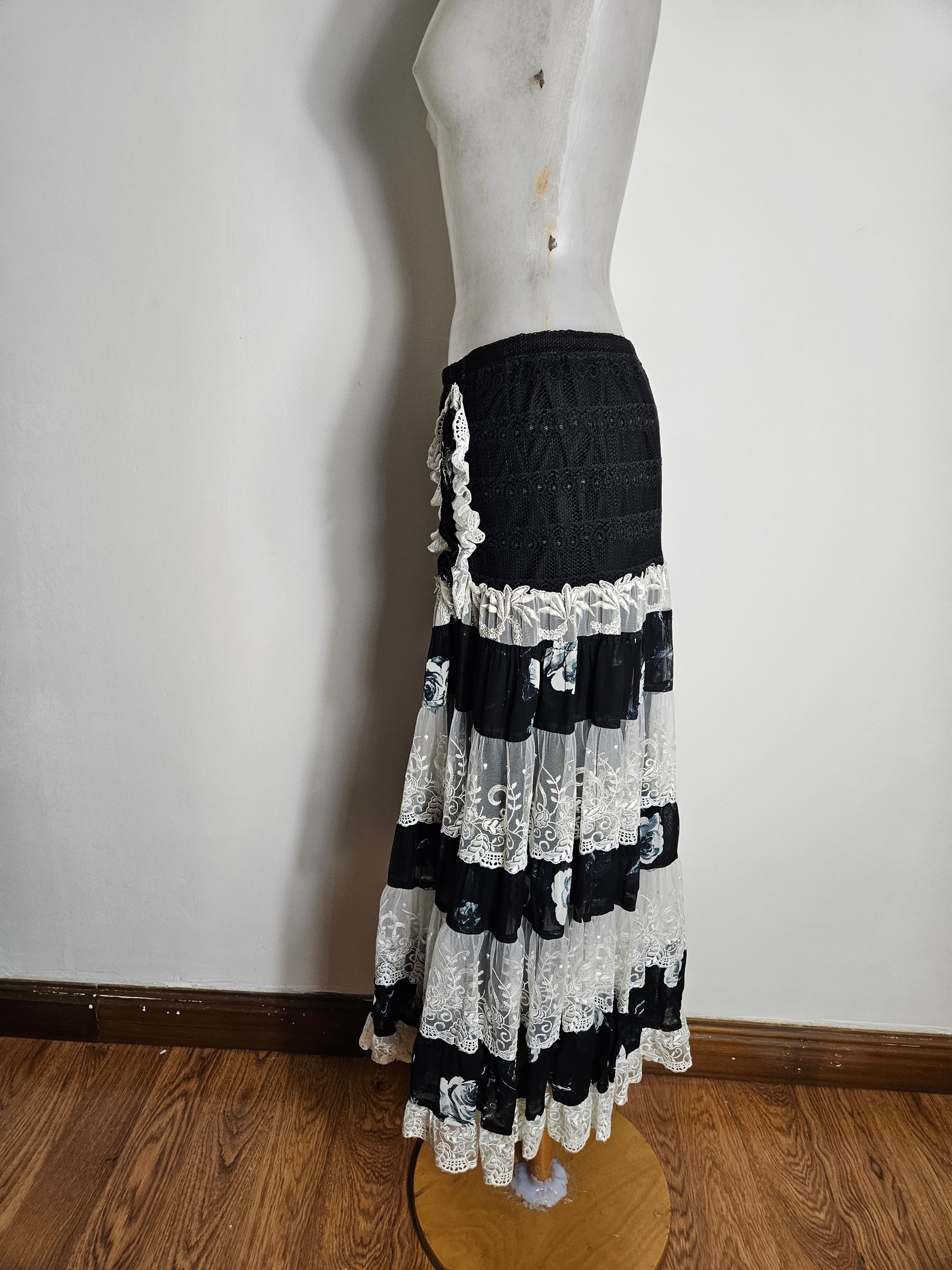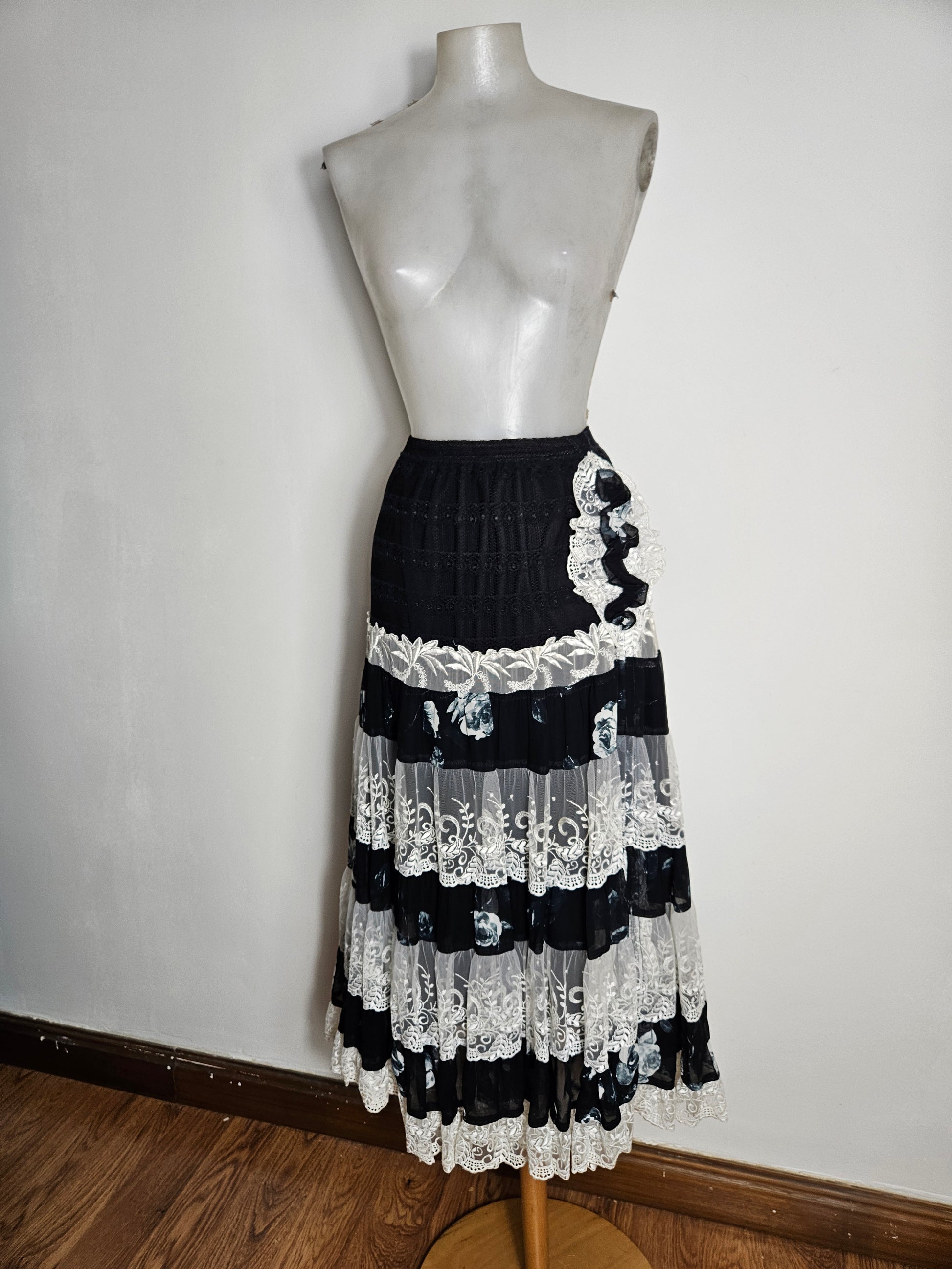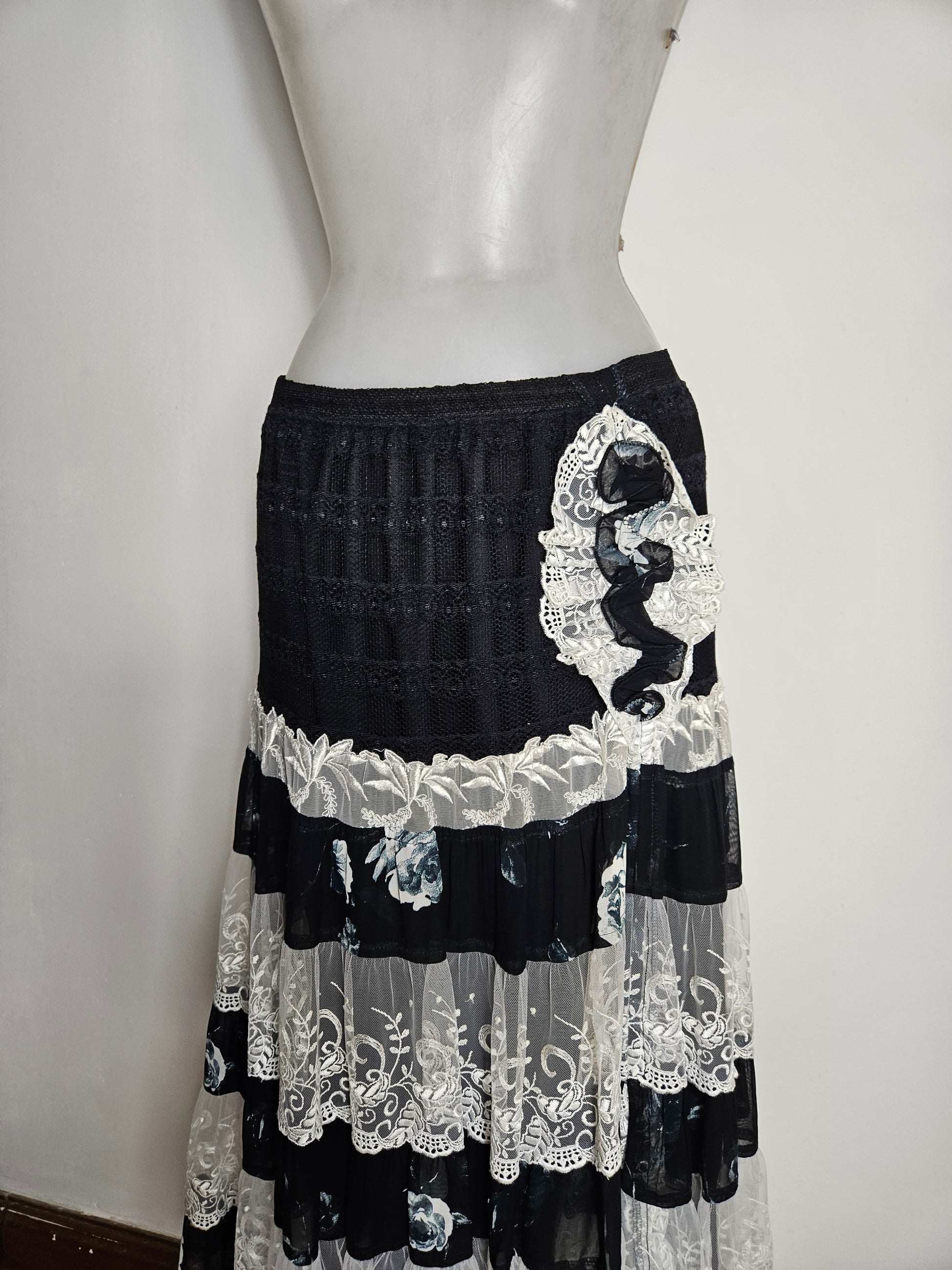 Black midi skirt with a straight waist. The upper section is made of textured black fabric. The hem features several overlapping ruffles alternating between white lace panels and semi-sheer black floral print panels. A decorative appliqué of white lace and black ribbon adorns the hip. A-line cut, mid-calf length.