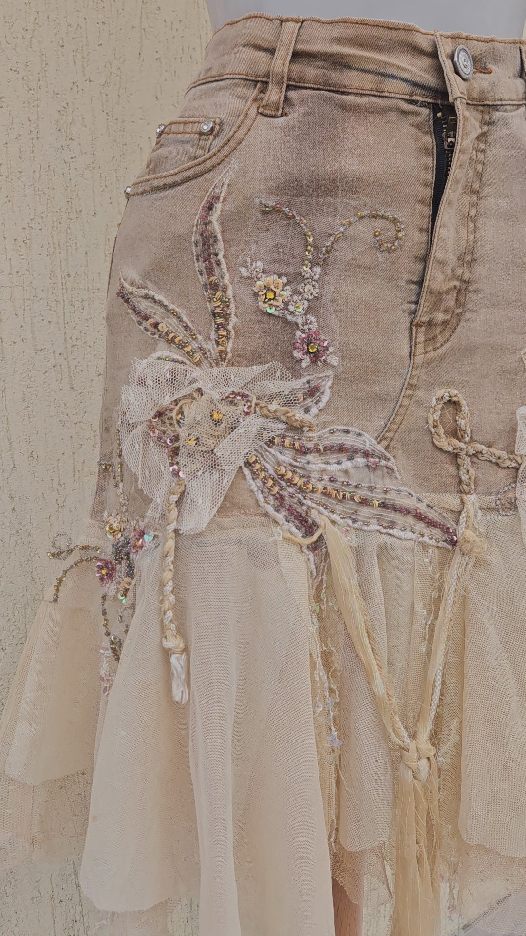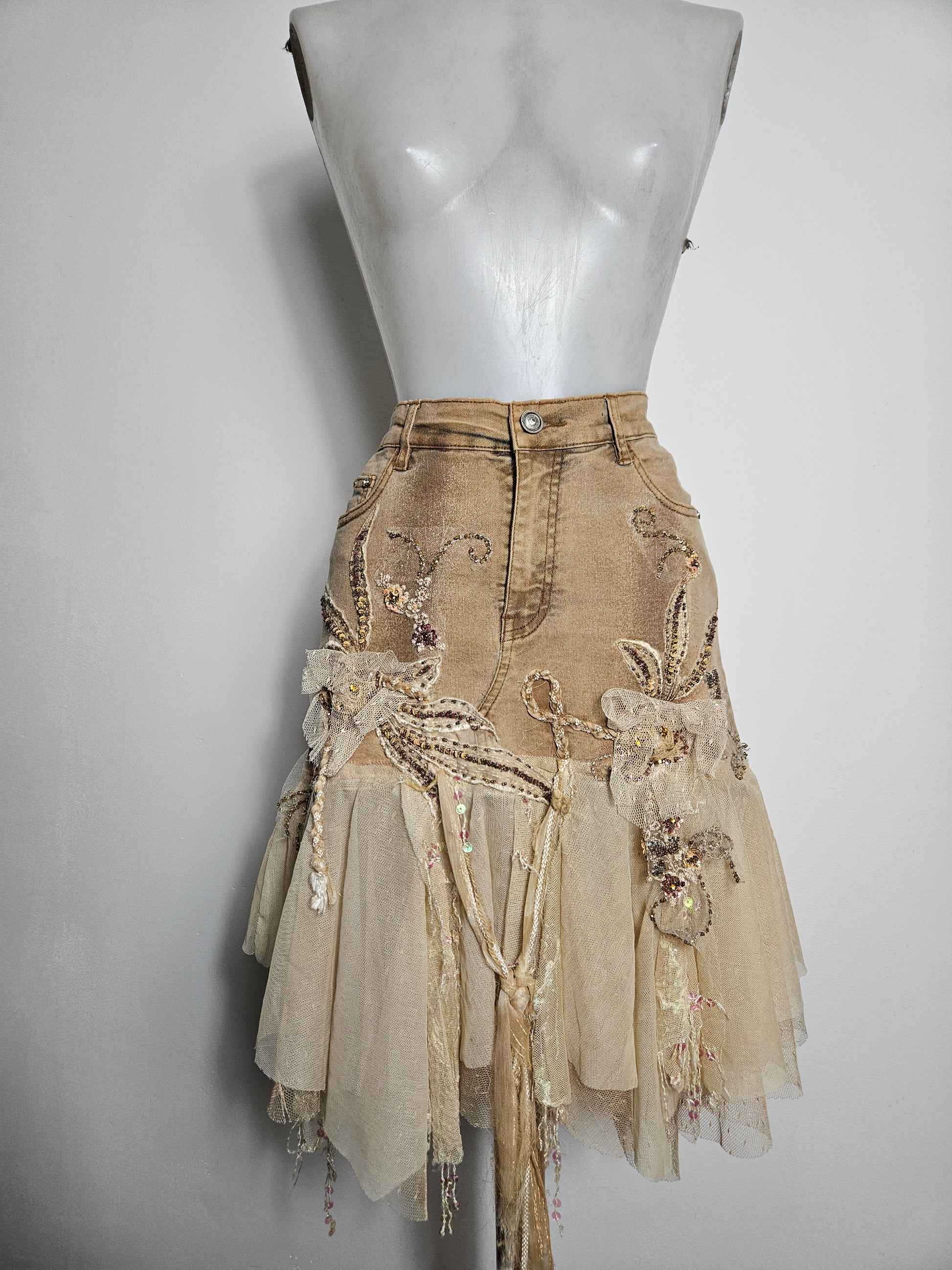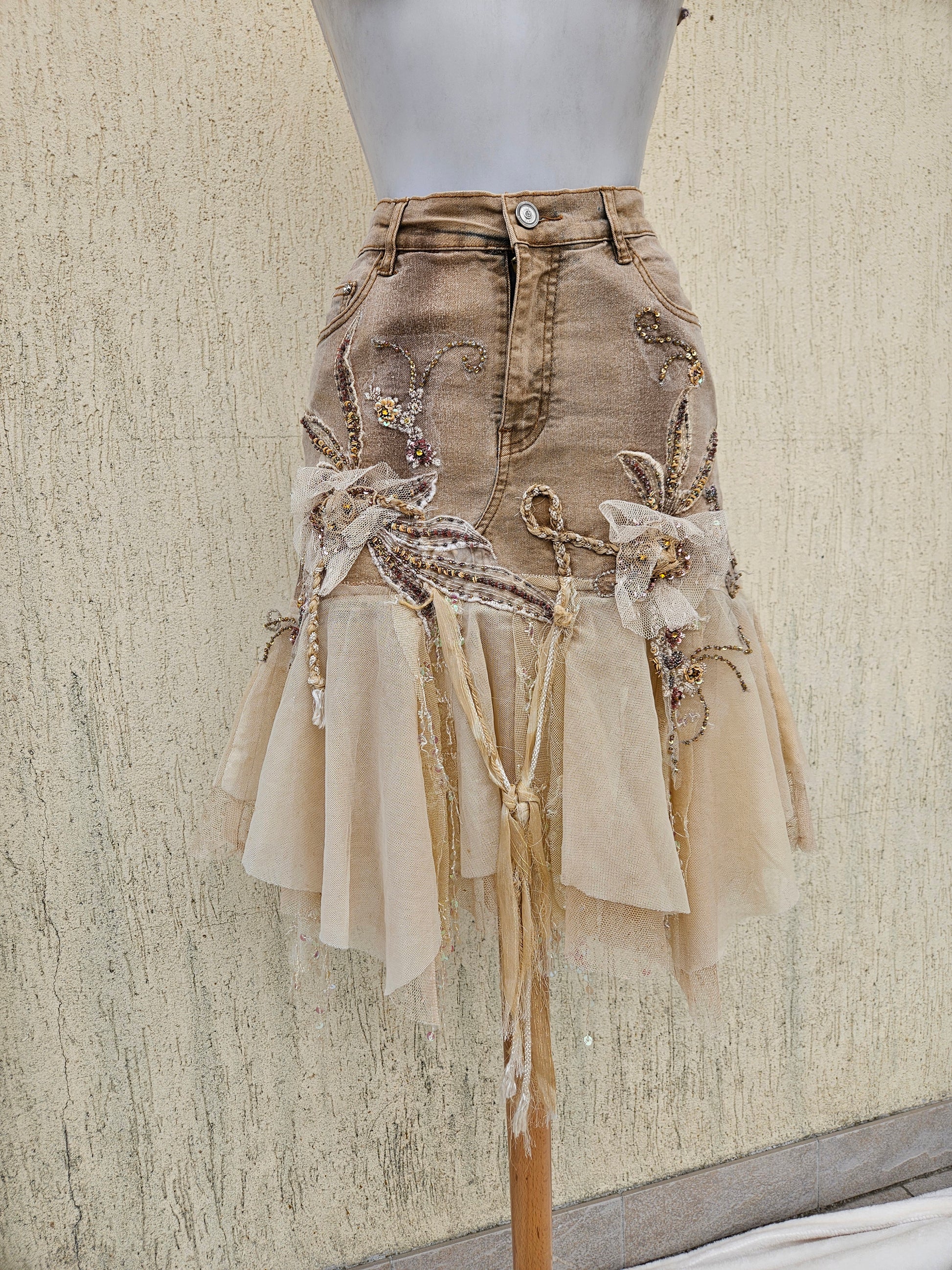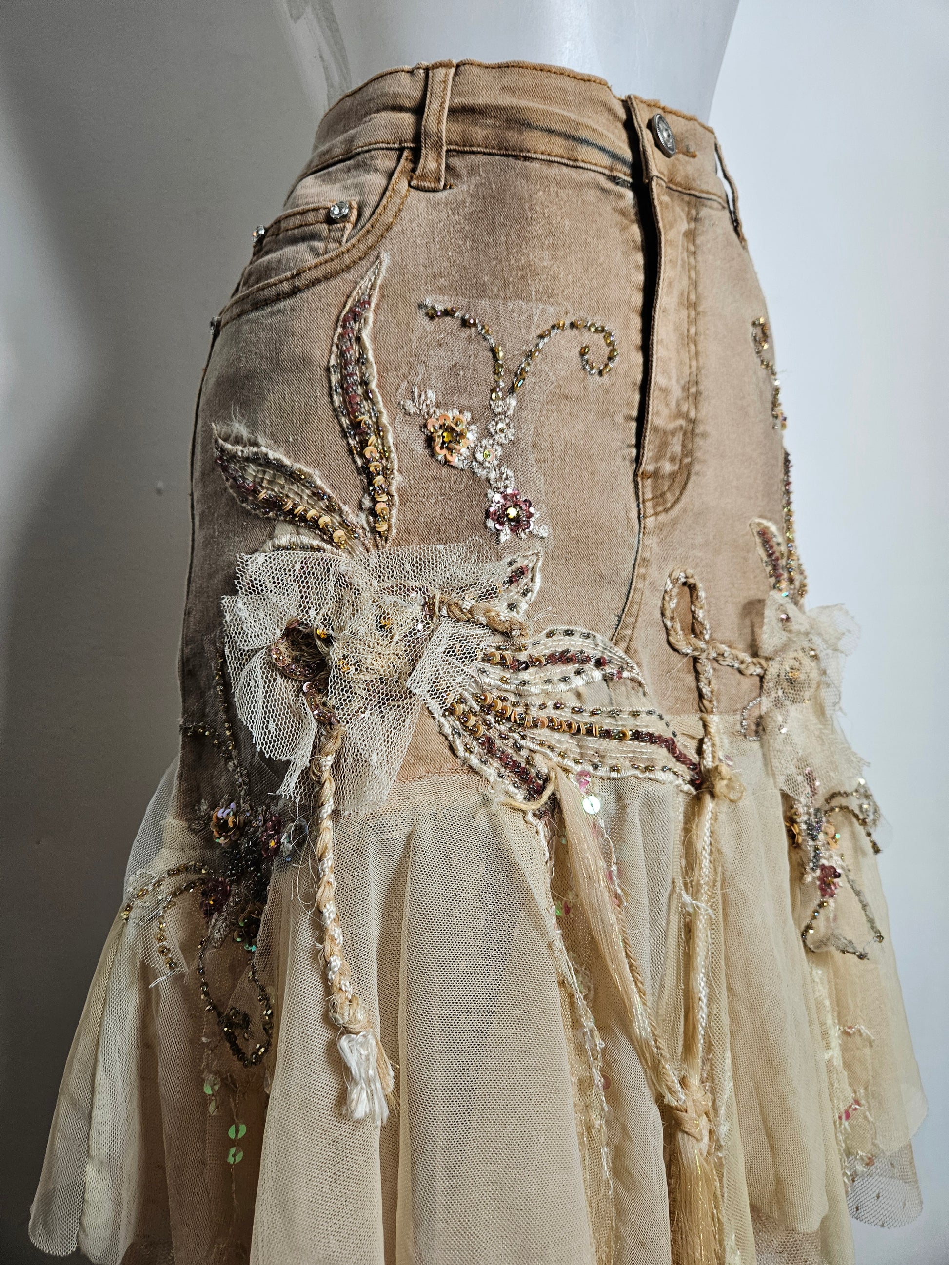 The skirt is richly decorated with floral embroidery, beads, sequins and appliquéd fabric flowers.