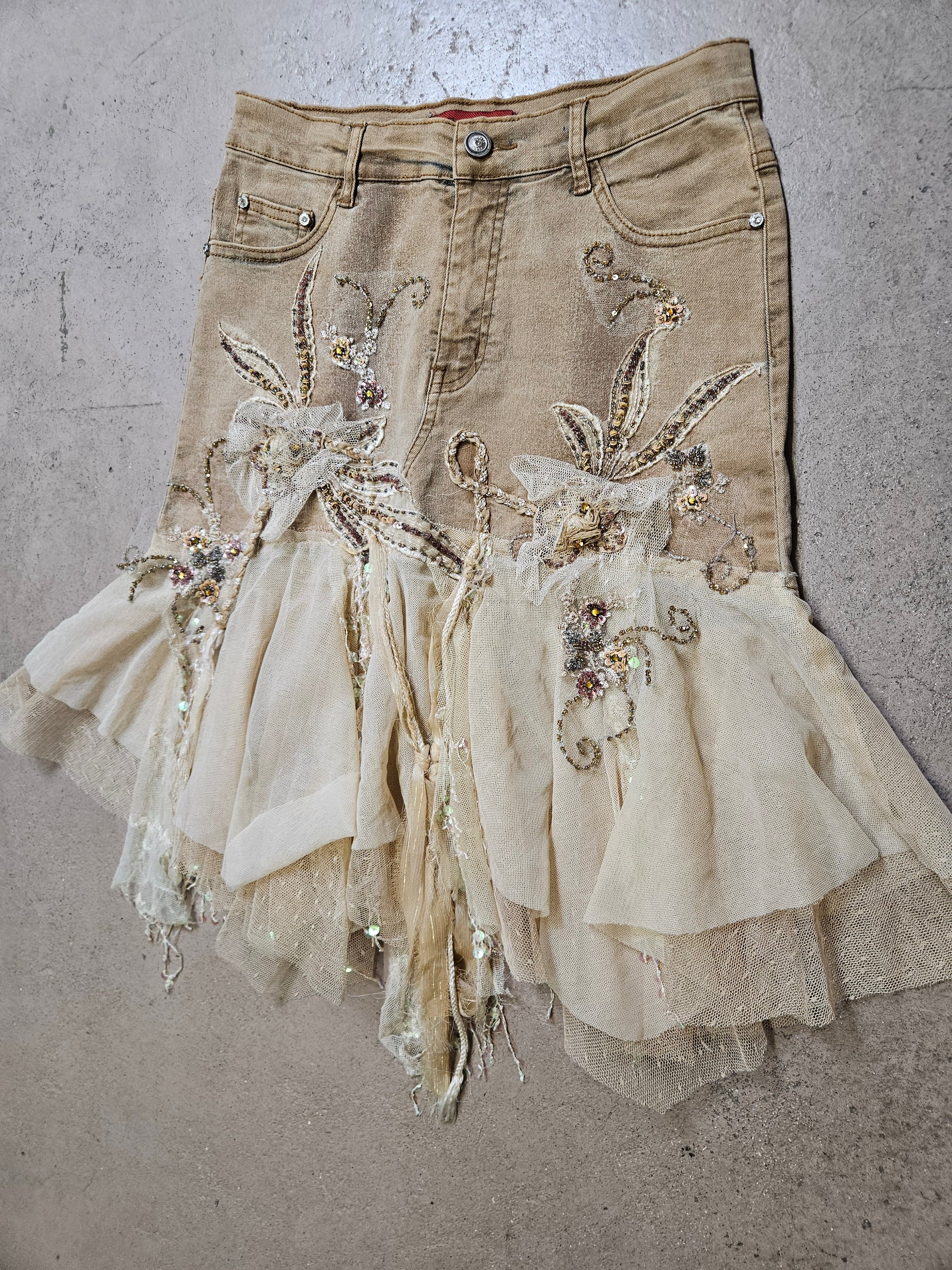 The bottom of the skirt ends with a wide, asymmetrical flounce made up of several layers of tulle and light mesh in cream and nude tones, creating a vaporous effect.