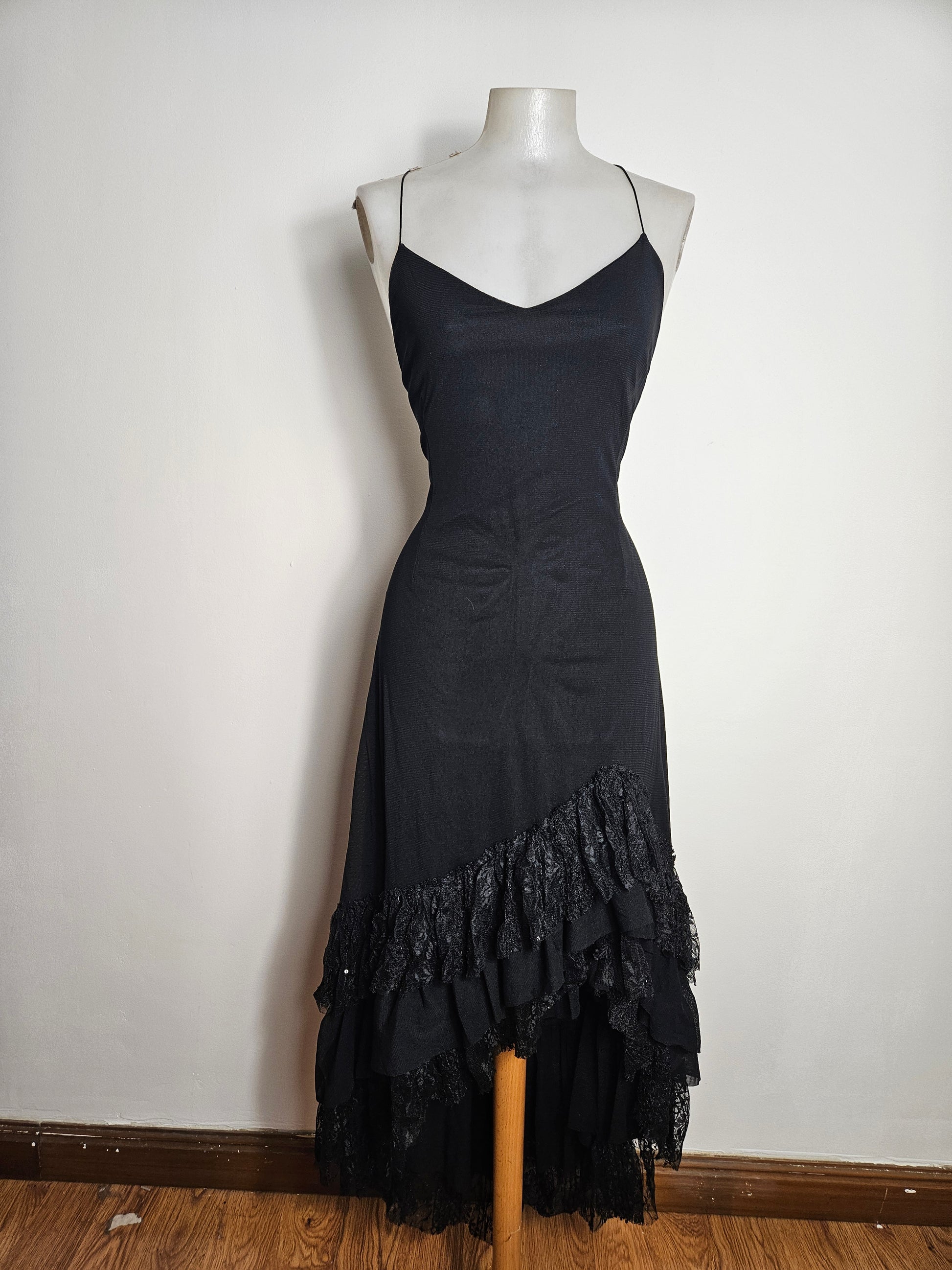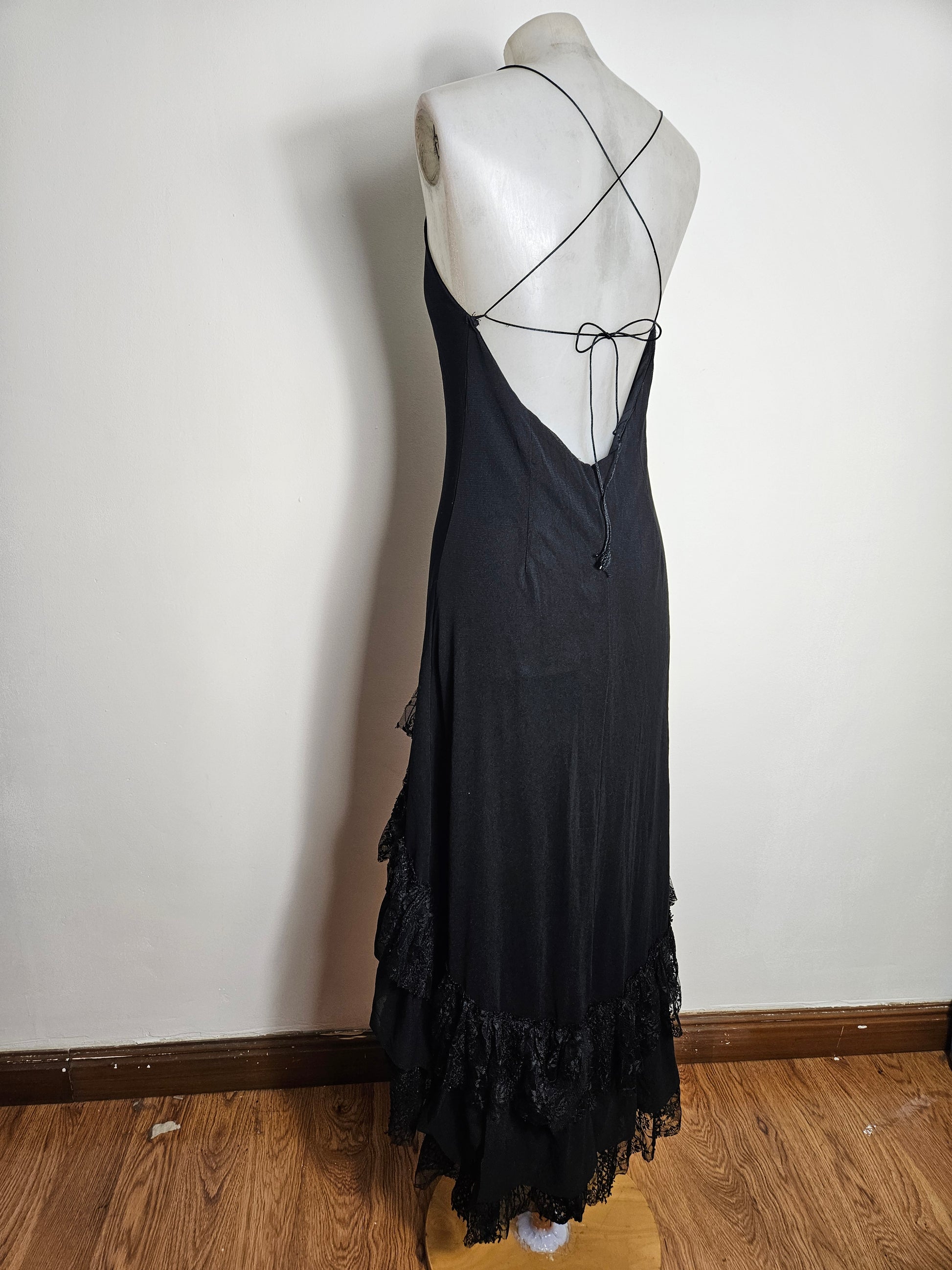 Long black slip dress with a flowing, body-hugging cut. Adjustable spaghetti straps and a V-neck at the front. Open back with criss-cross ties. Asymmetrical skirt adorned with ruffles and lace panels at the hem. Tie closure at the back.