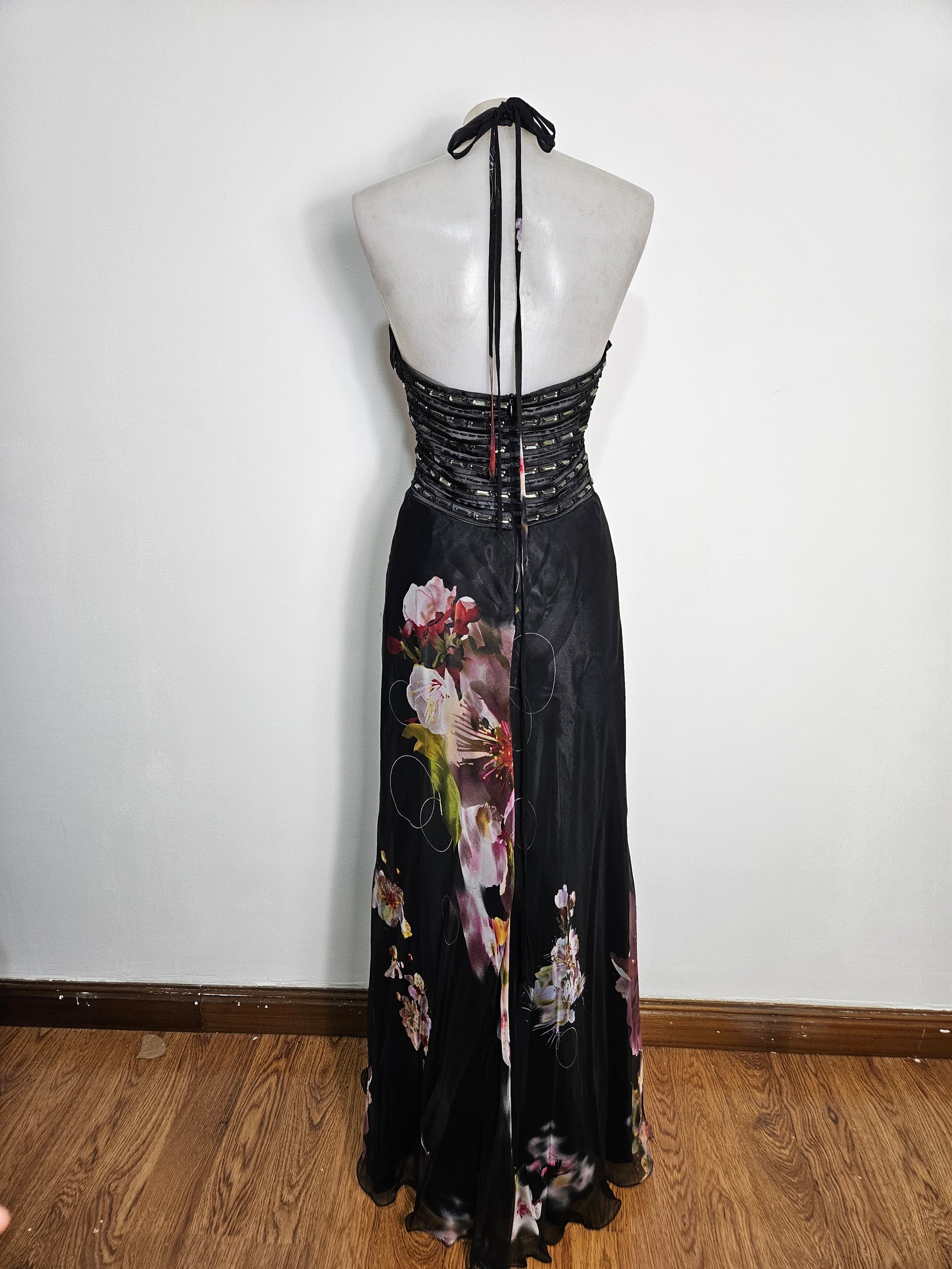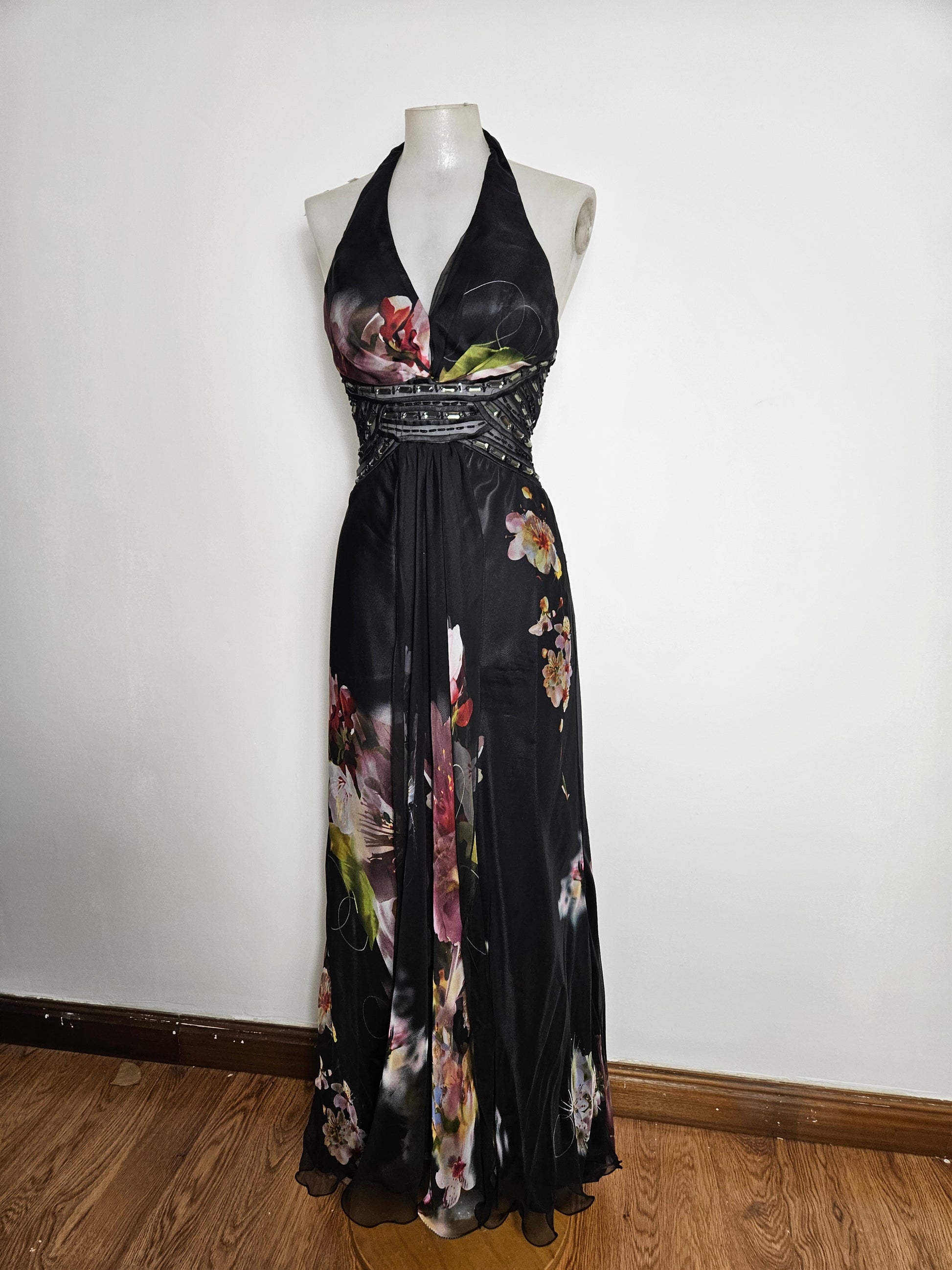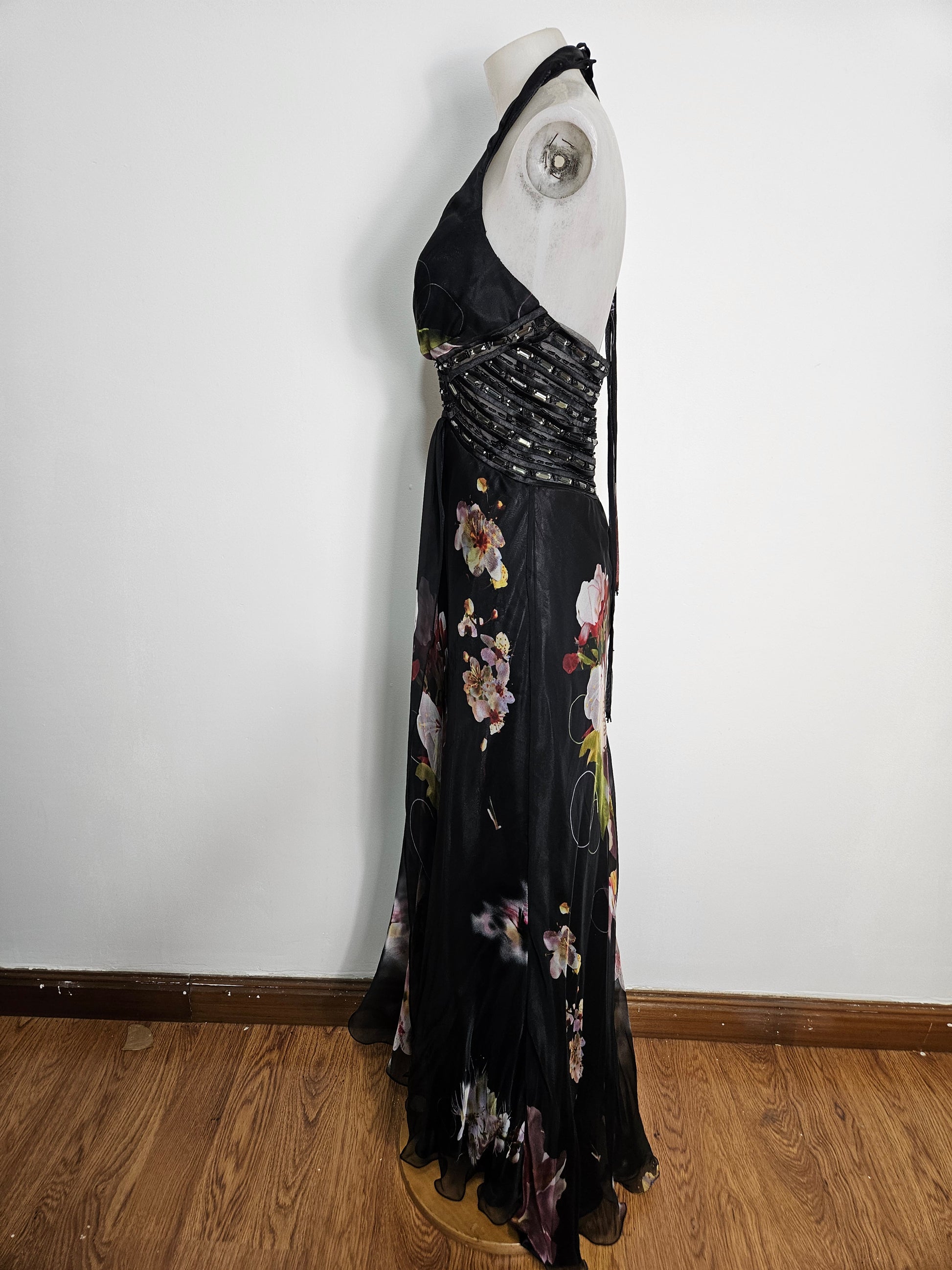 - The fabric is fluid and slightly transparent, with a soft-toned floral print spread across the entire dress.