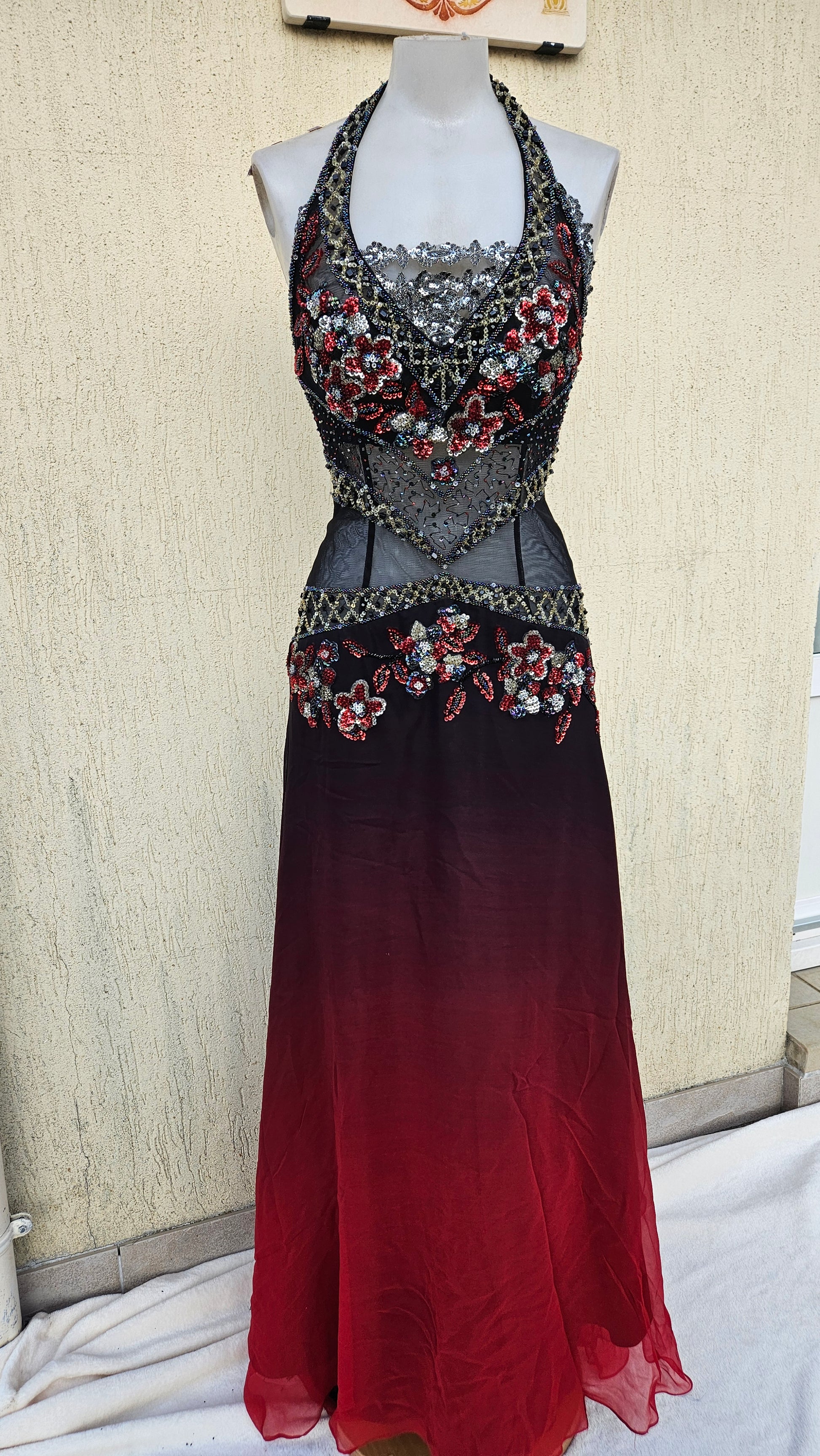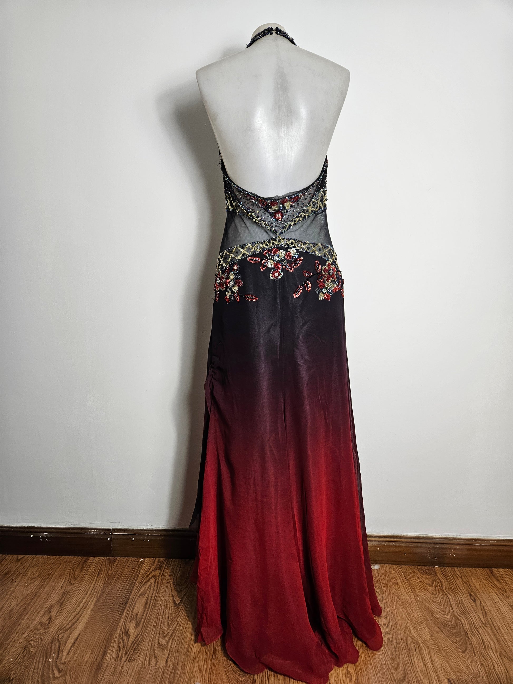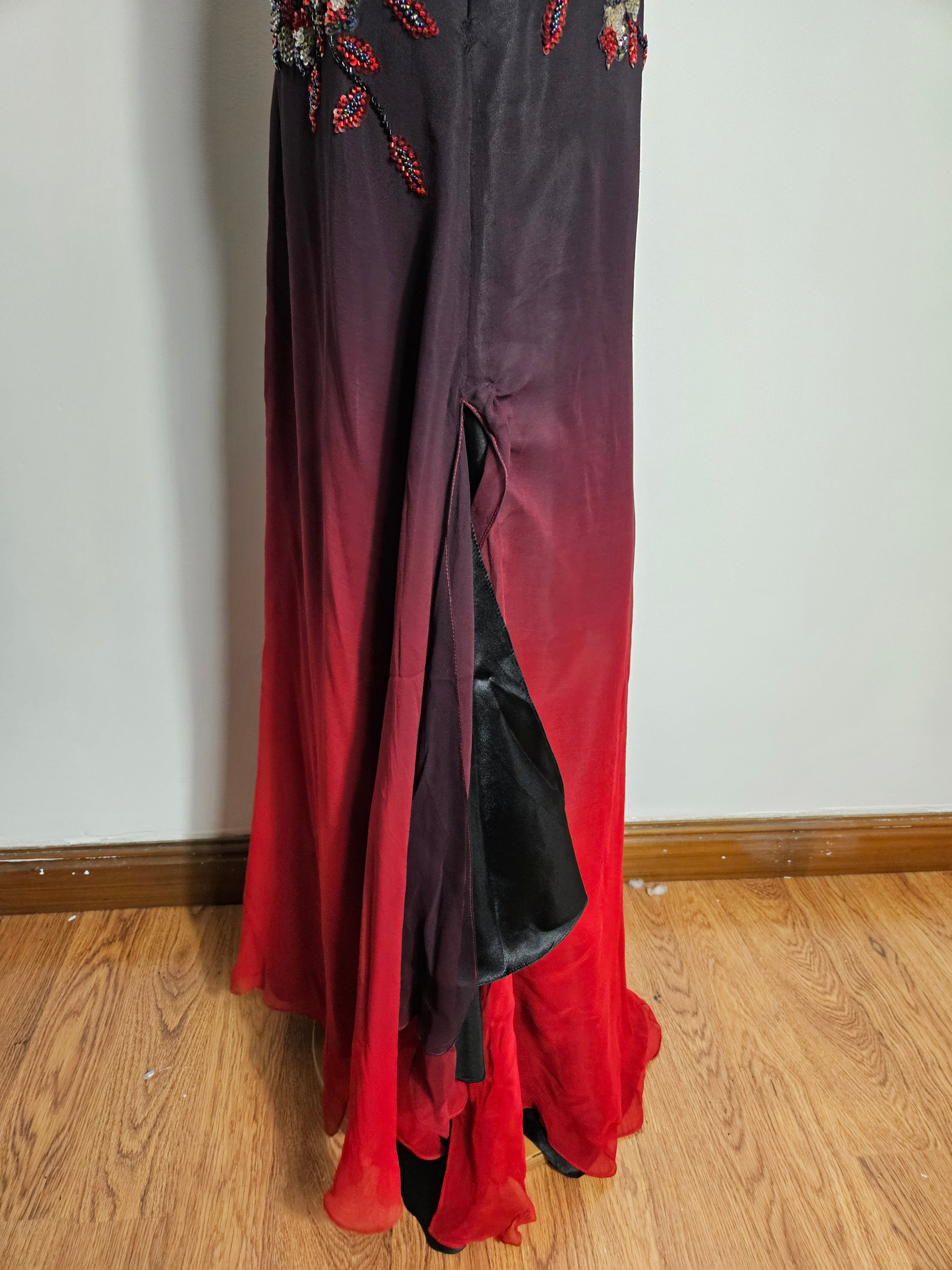 Floral decorations embroidered with beads and sequins adorn the bodice and hips. The skirt features a color gradient from black to burgundy. It fastens with two hooks at the nape of the neck.