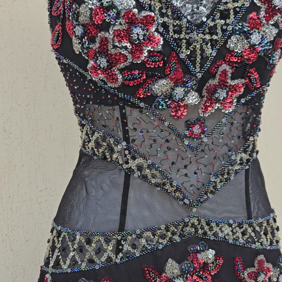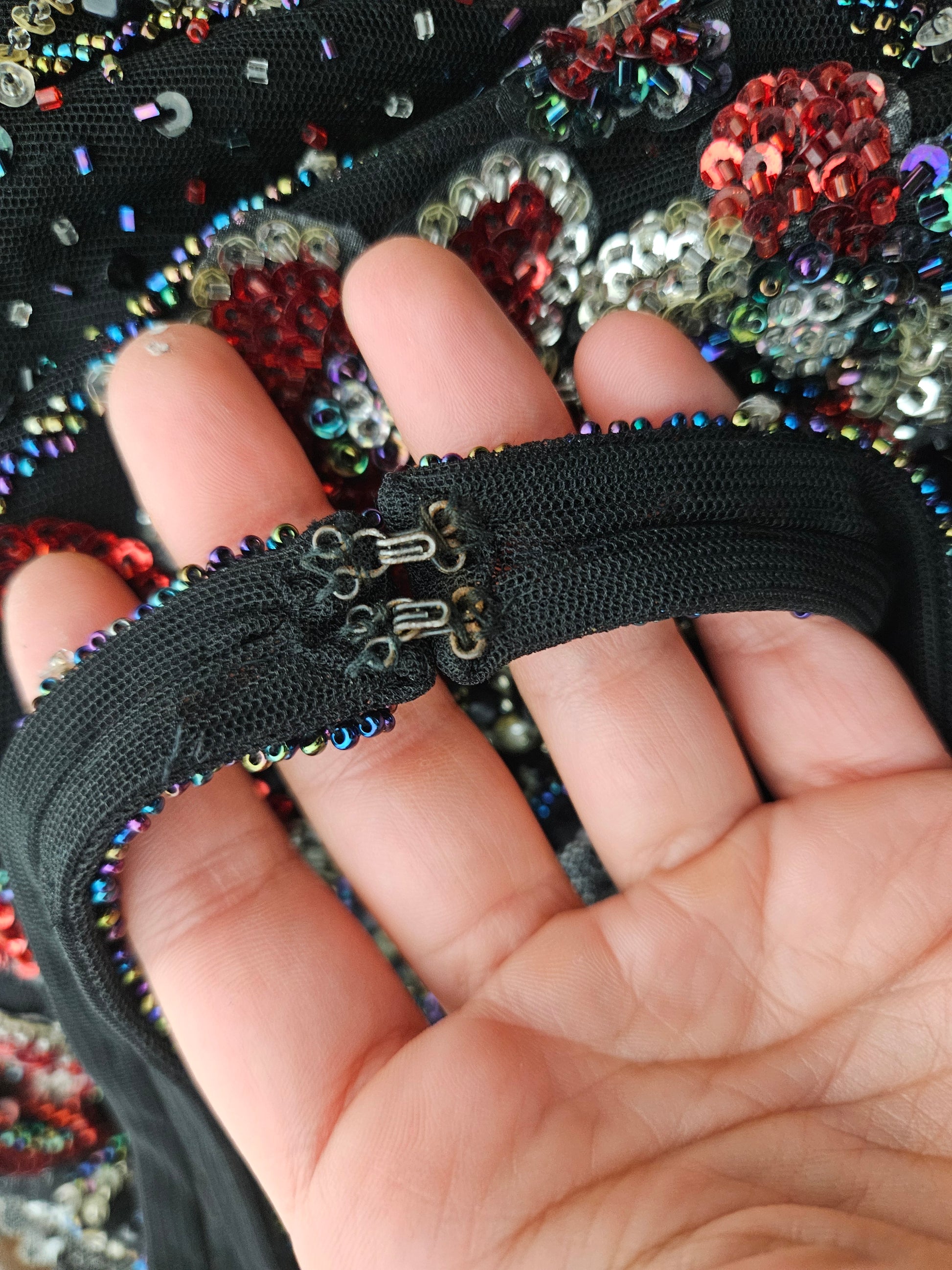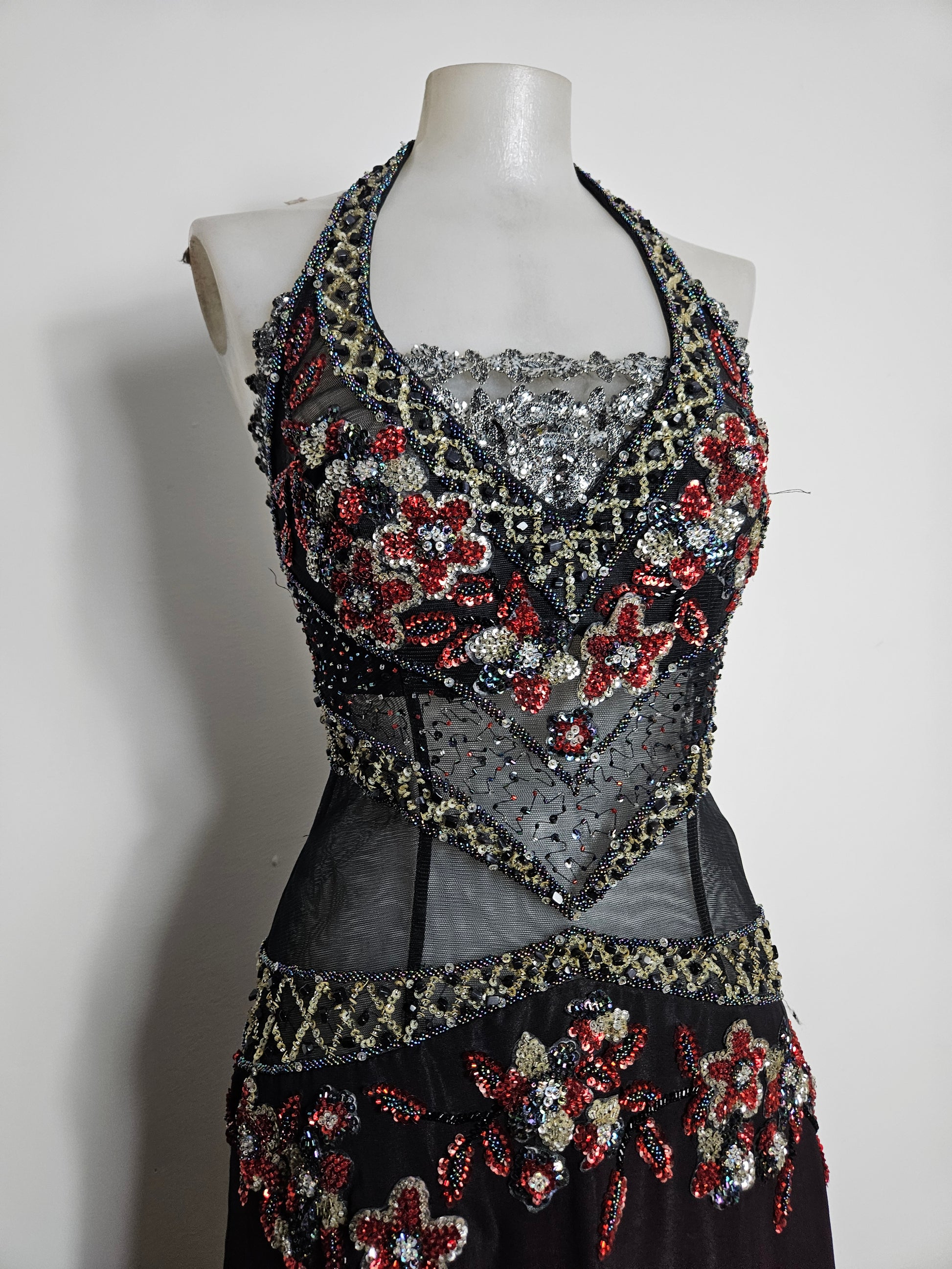Floral decorations embroidered with beads and sequins adorn the bodice and hips. The skirt features a color gradient from black to burgundy. It fastens with two hooks at the nape of the neck.