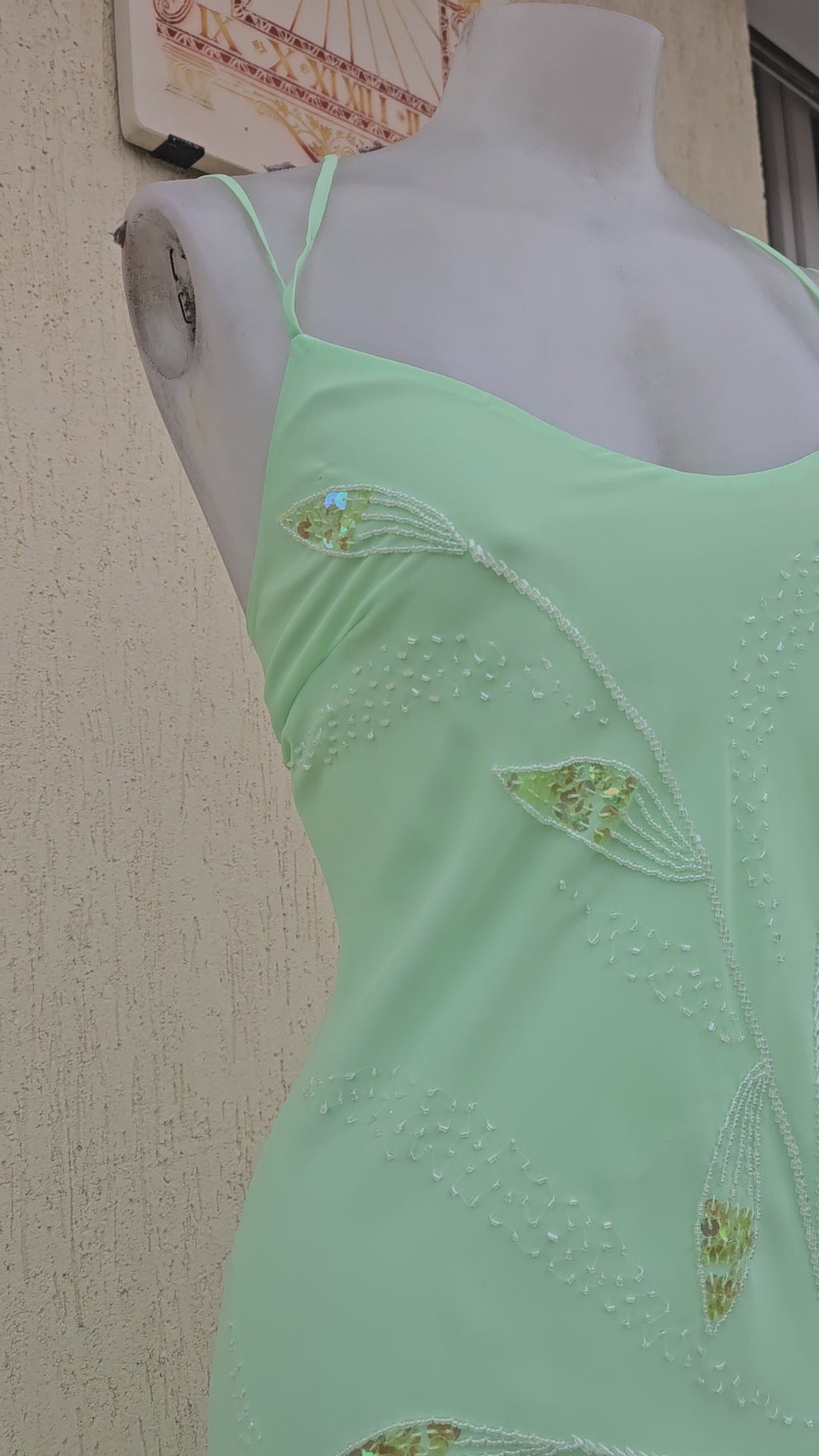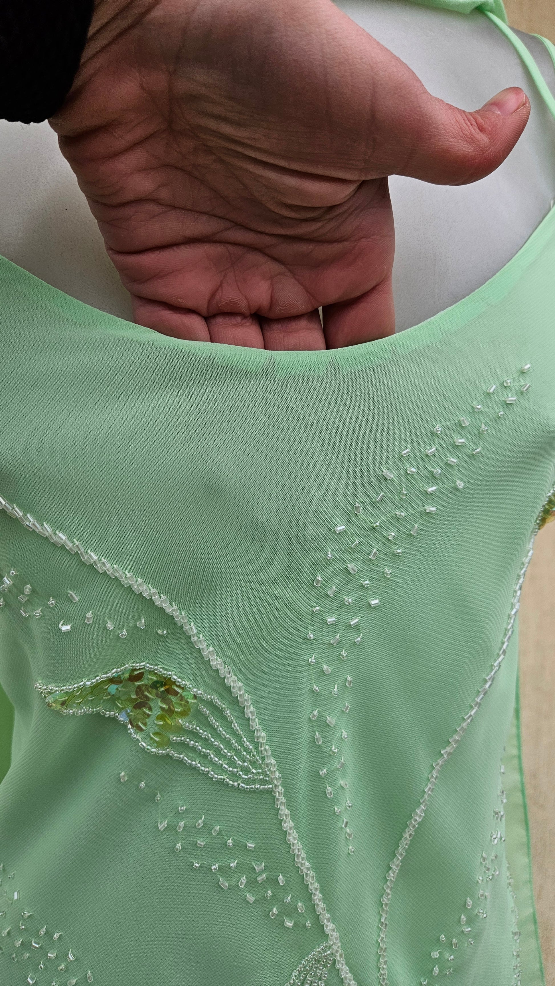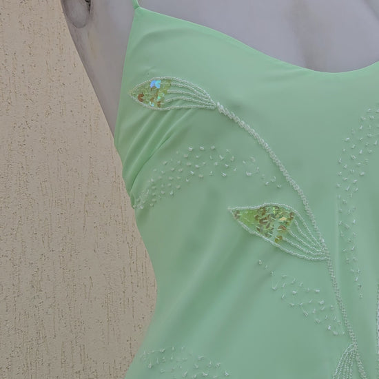 Mint green vintage maxi dress with thin straps. Fitted at the bust and flowing at the bottom. V-neck. Open back with adjustable criss-cross lacing. Lightweight, semi-sheer fabric with overlays. Embroidered sequin and bead embellishments forming botanical motifs throughout. Asymmetrical hem.