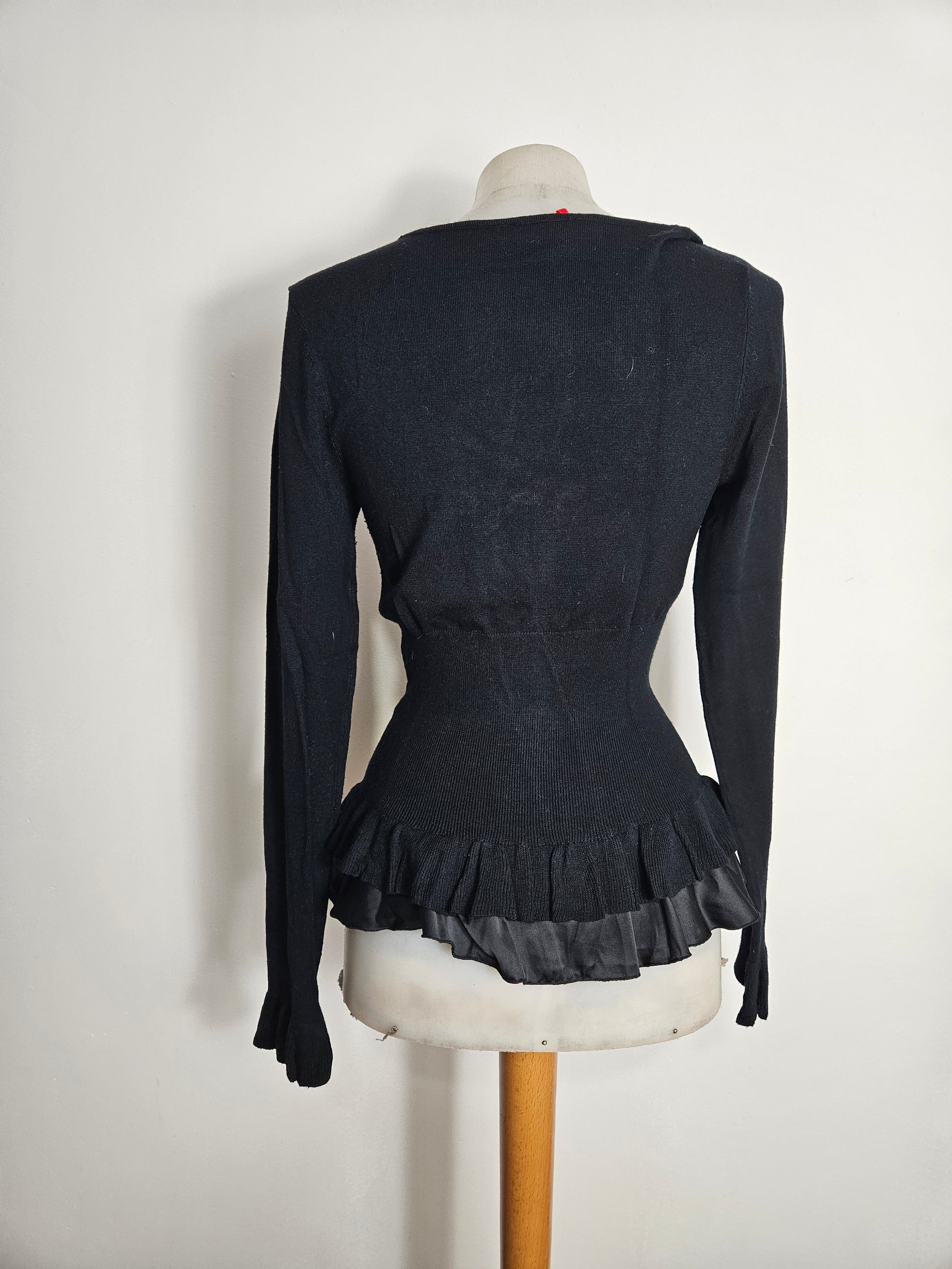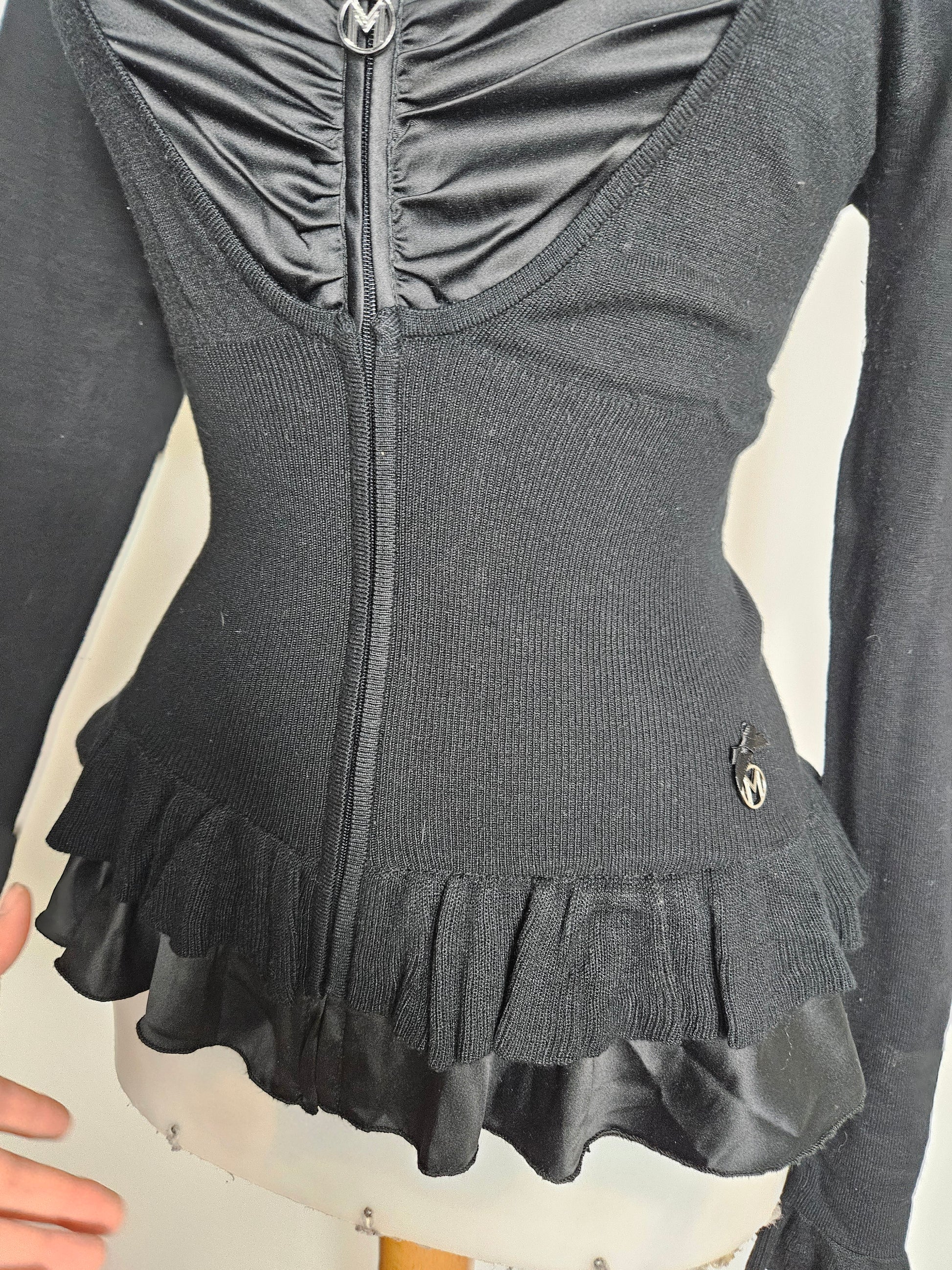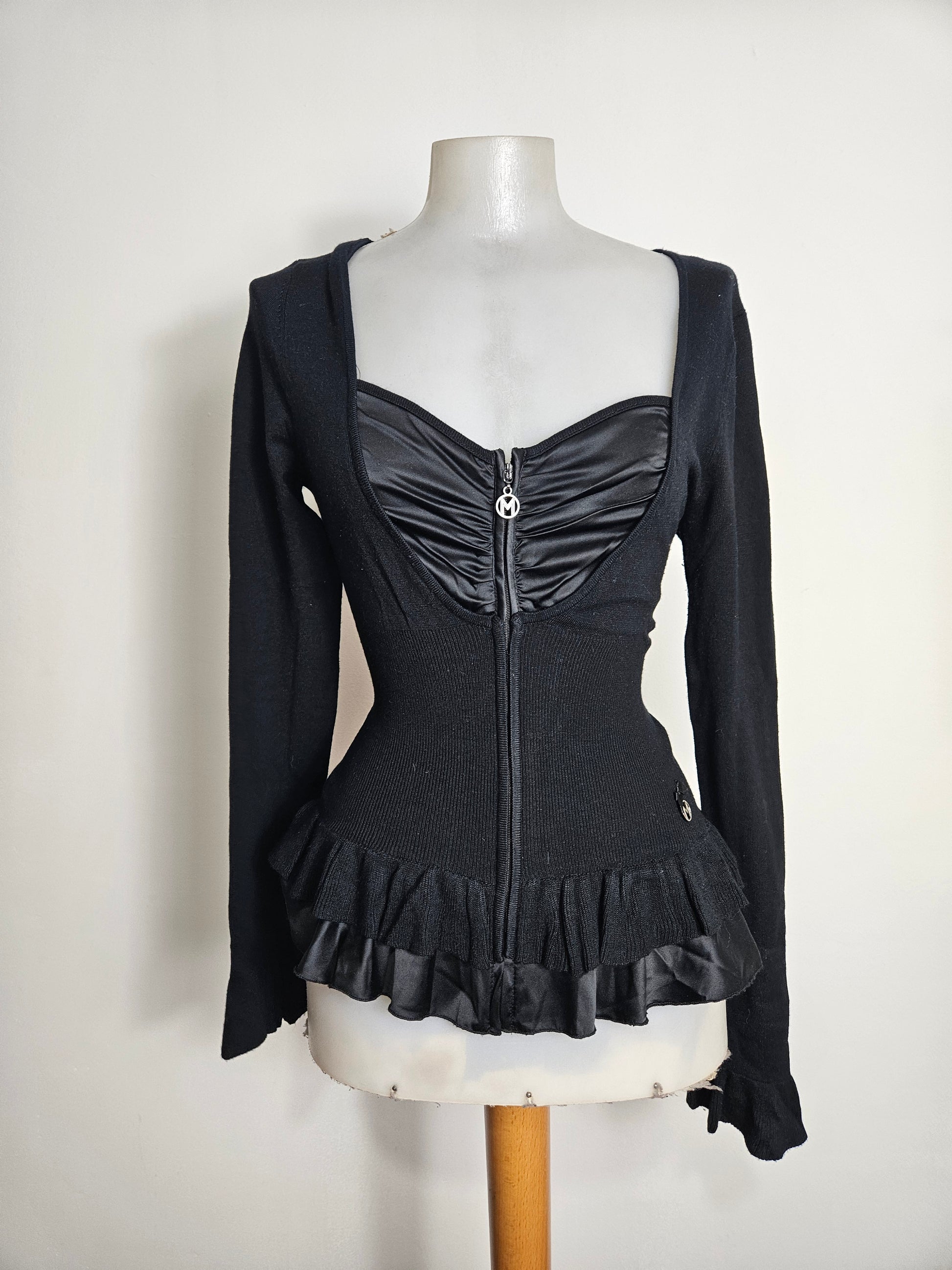 Black long-sleeved top with a front zip opening. Sweetheart neckline with a gathered satin panel at the chest. Fitted waist with a fitted knit detail and slightly flared hem with a satin-trimmed flounce. Fitted cut.