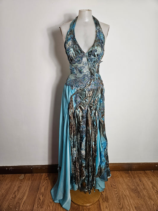Vestido largo azul bordado con espalda abierta