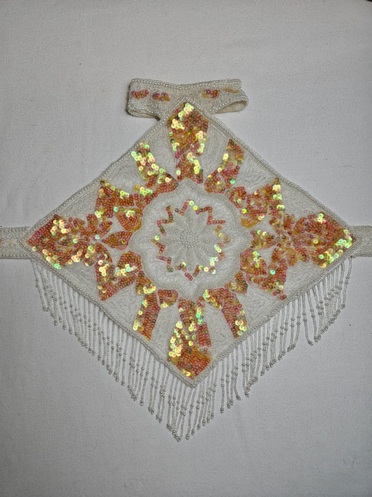 Espalda abierta bordada en blanco y dorado.