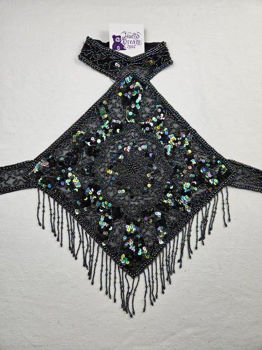 Vestido negro sin espalda con reflejos multicolores
