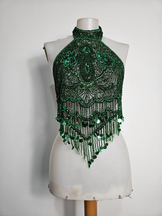 Espalda abierta bordada con lentejuelas verdes y negras.
