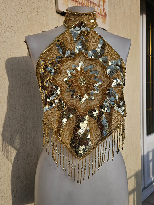 Espalda abierta bordada con lentejuelas doradas y plateadas.