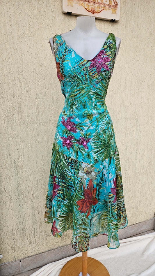 Robe florale brodée tons bleus et verts