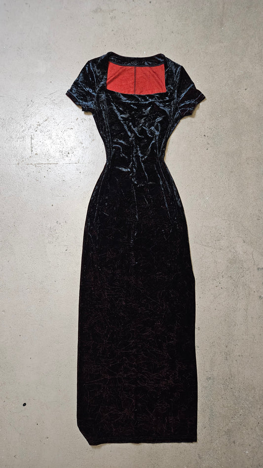 Robe en velours froissé noire à reflets rouges
