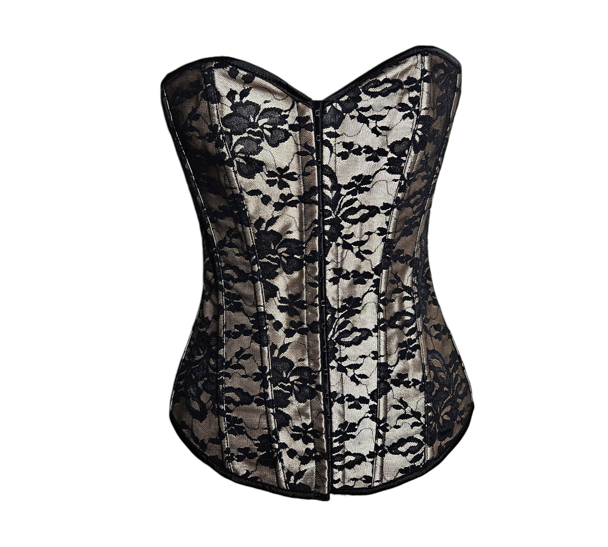 Corset bustier structuré avec armatures verticales. Modèle en tissu beige recouvert de dentelle noire à motif floral. Finition noire au niveau des bords. Fermeture par laçage au dos avec œillets métalliques.