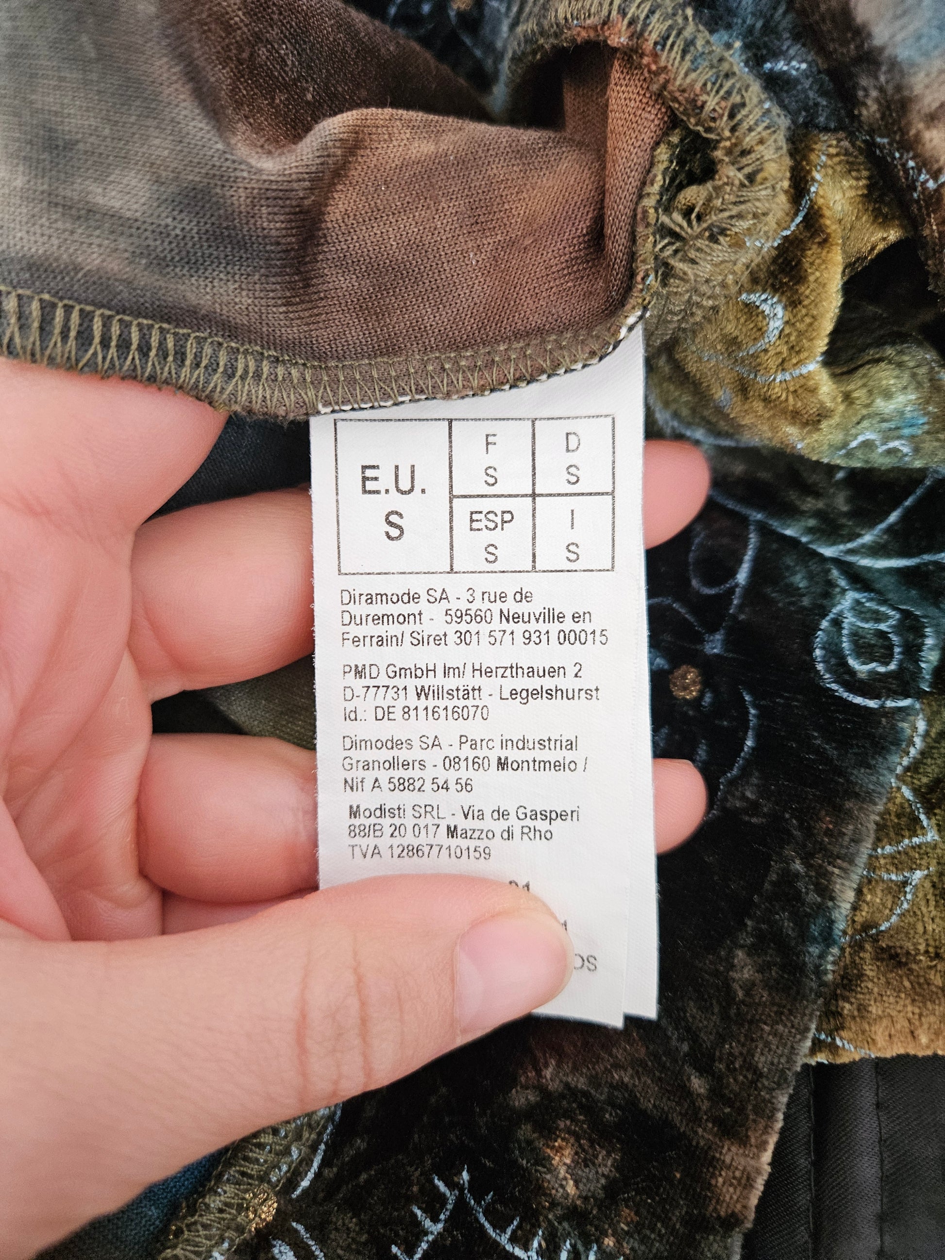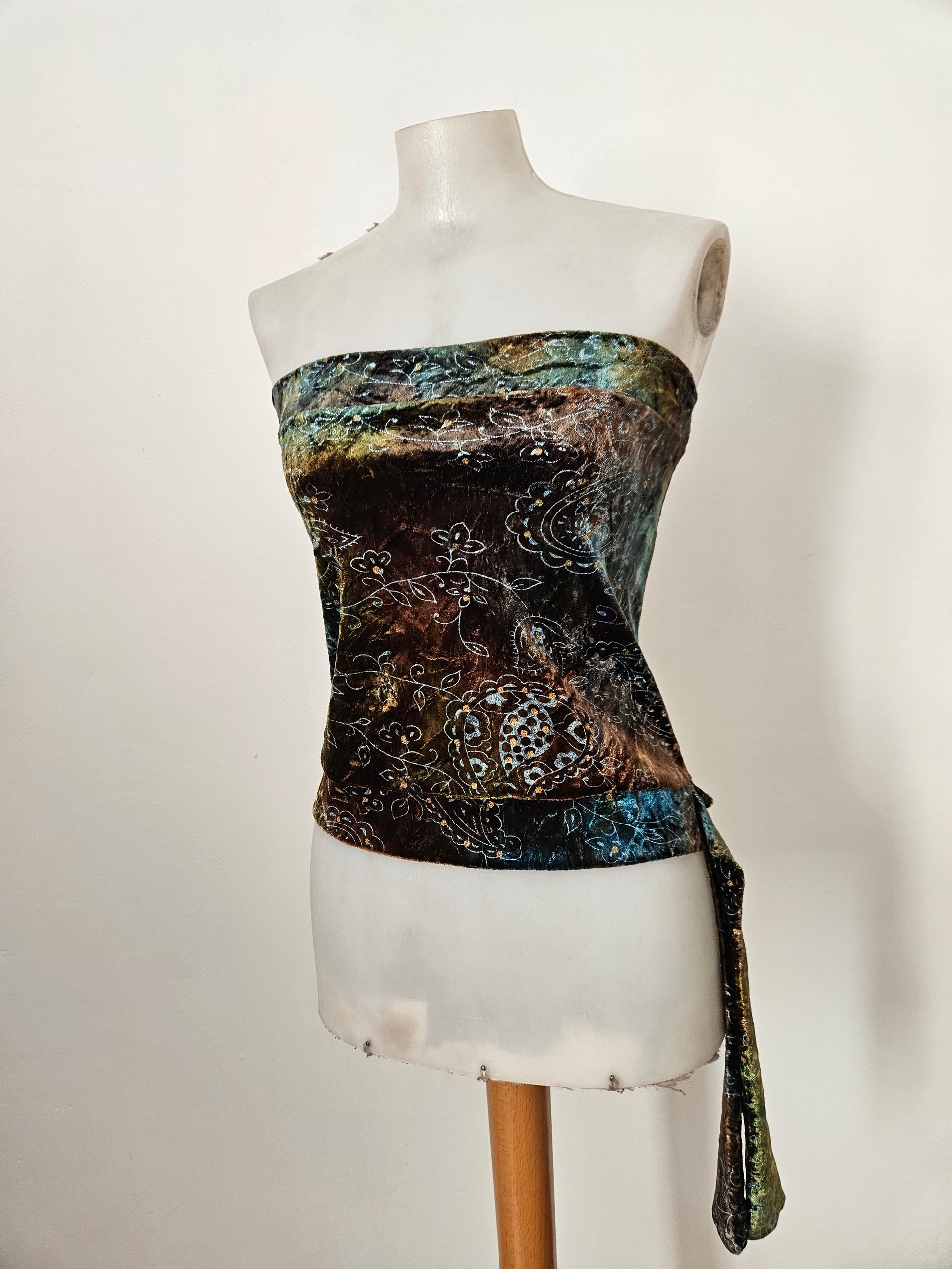 Top bustier sans manches. Coupe ajustée. Matière à l’aspect velours avec motifs imprimés. Finition droite au niveau de l’encolure. Présence d’un lien latéral à nouer permettant l’ajustement. Modèle extensible.