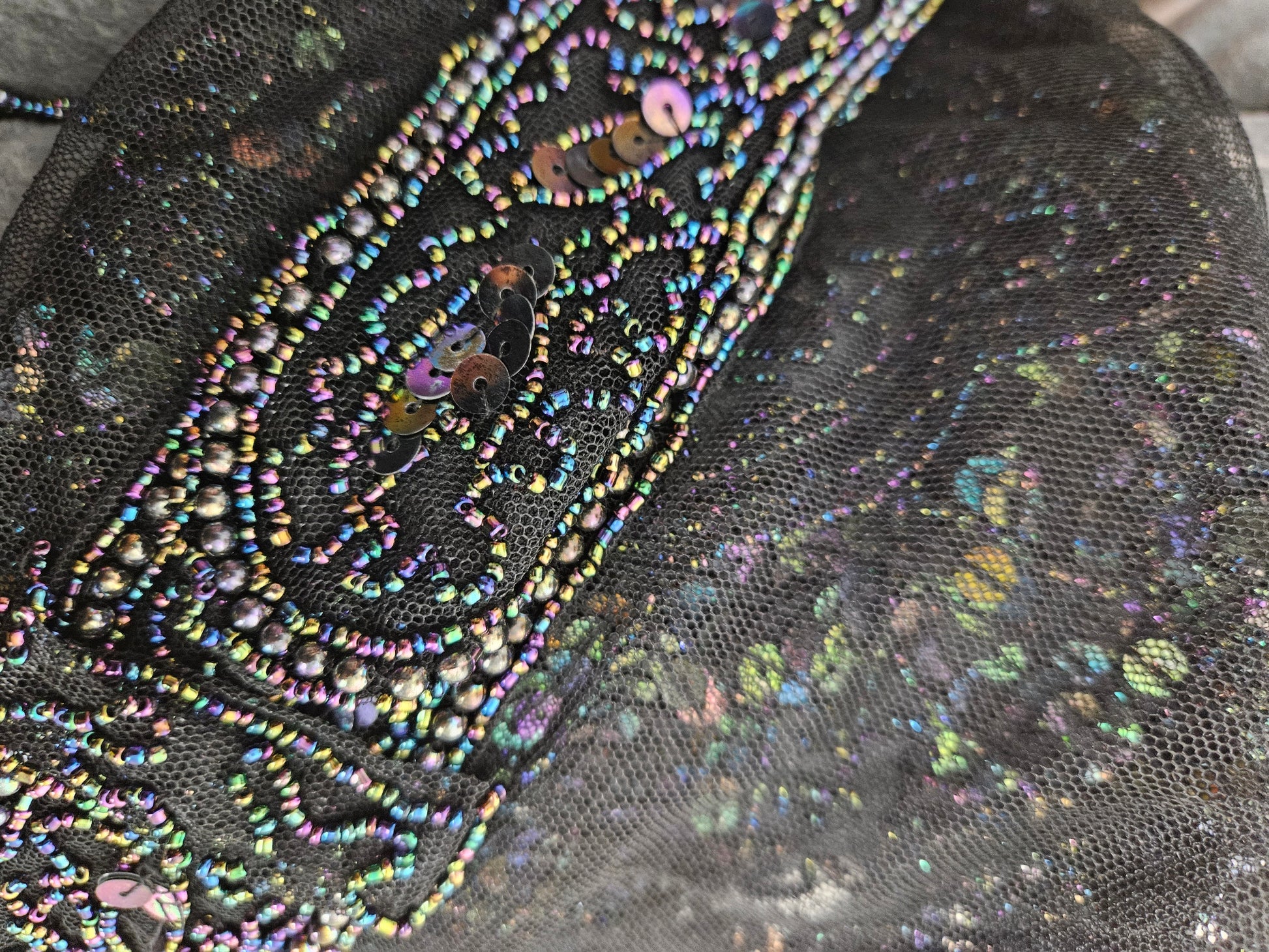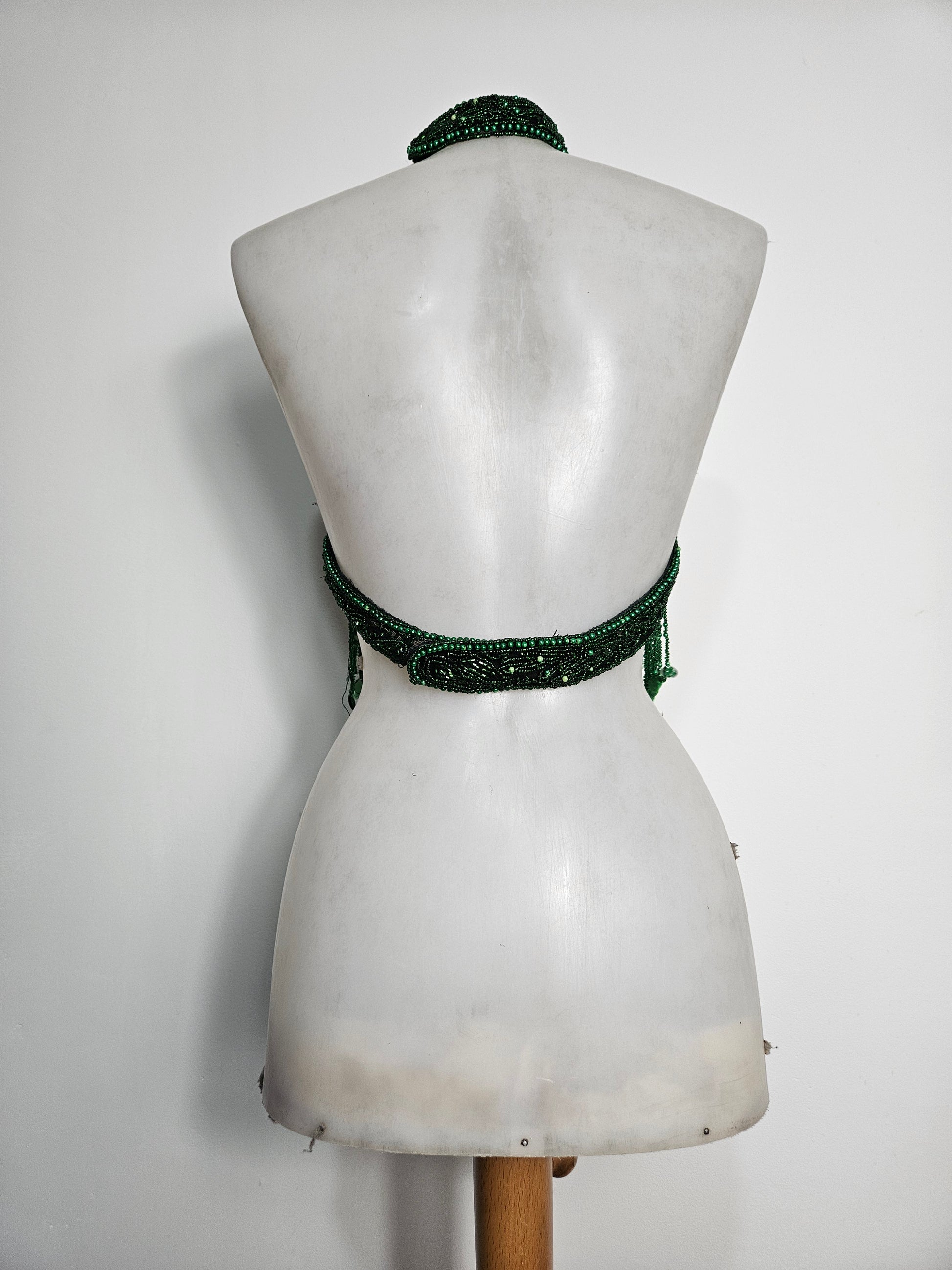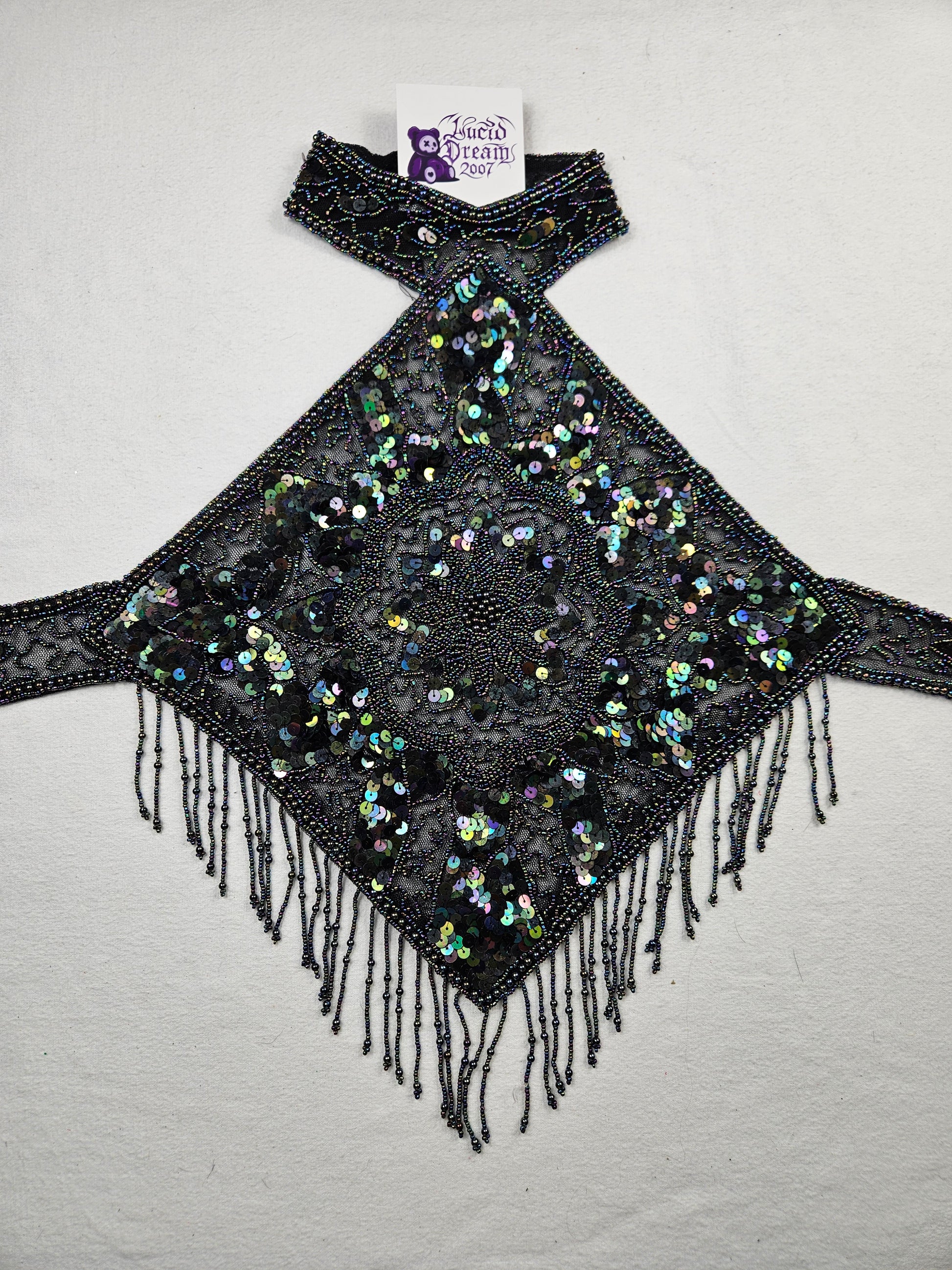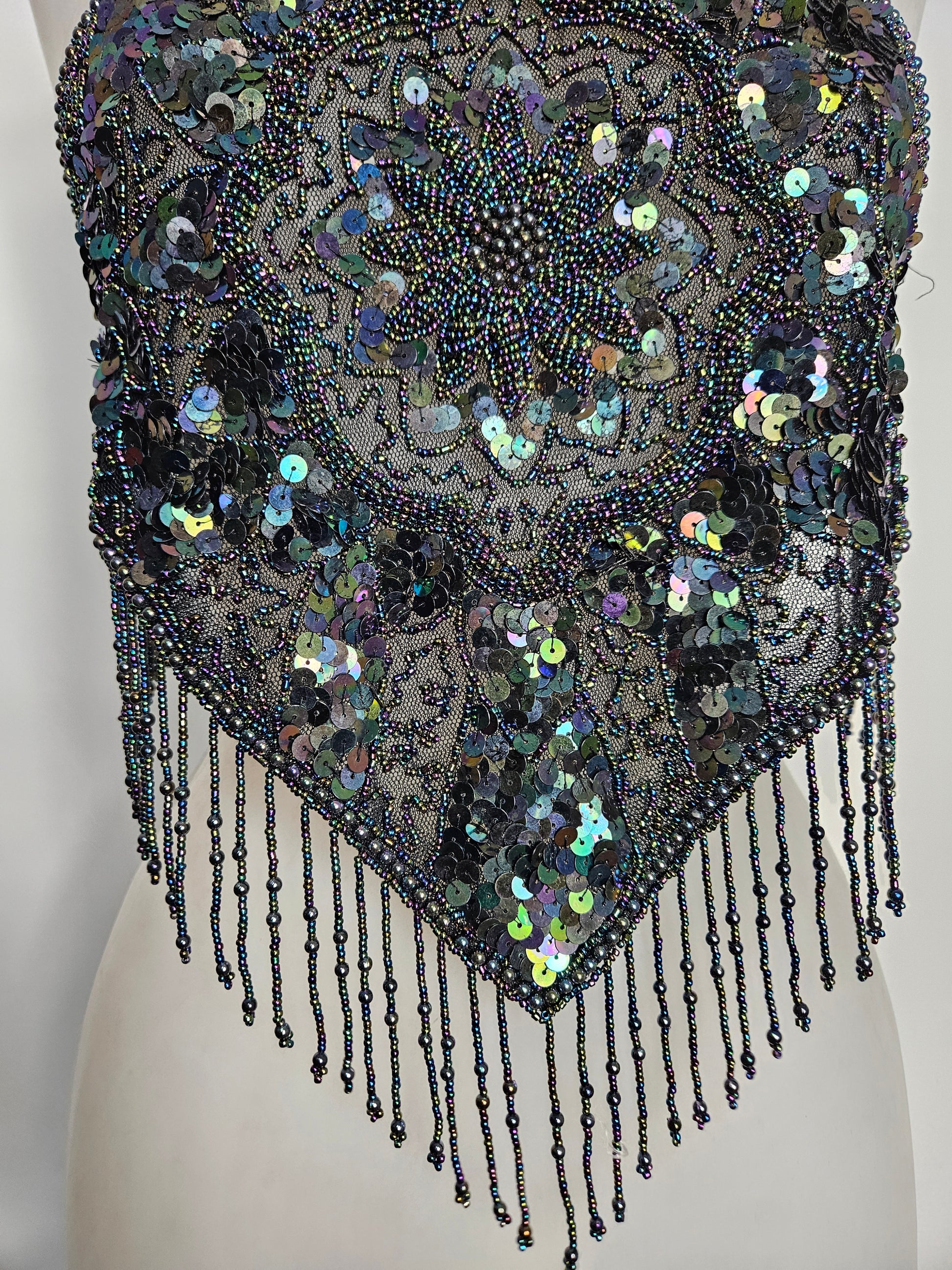 - La pièce est entièrement brodée de perles et de sequins formant des motifs géométriques et floraux.