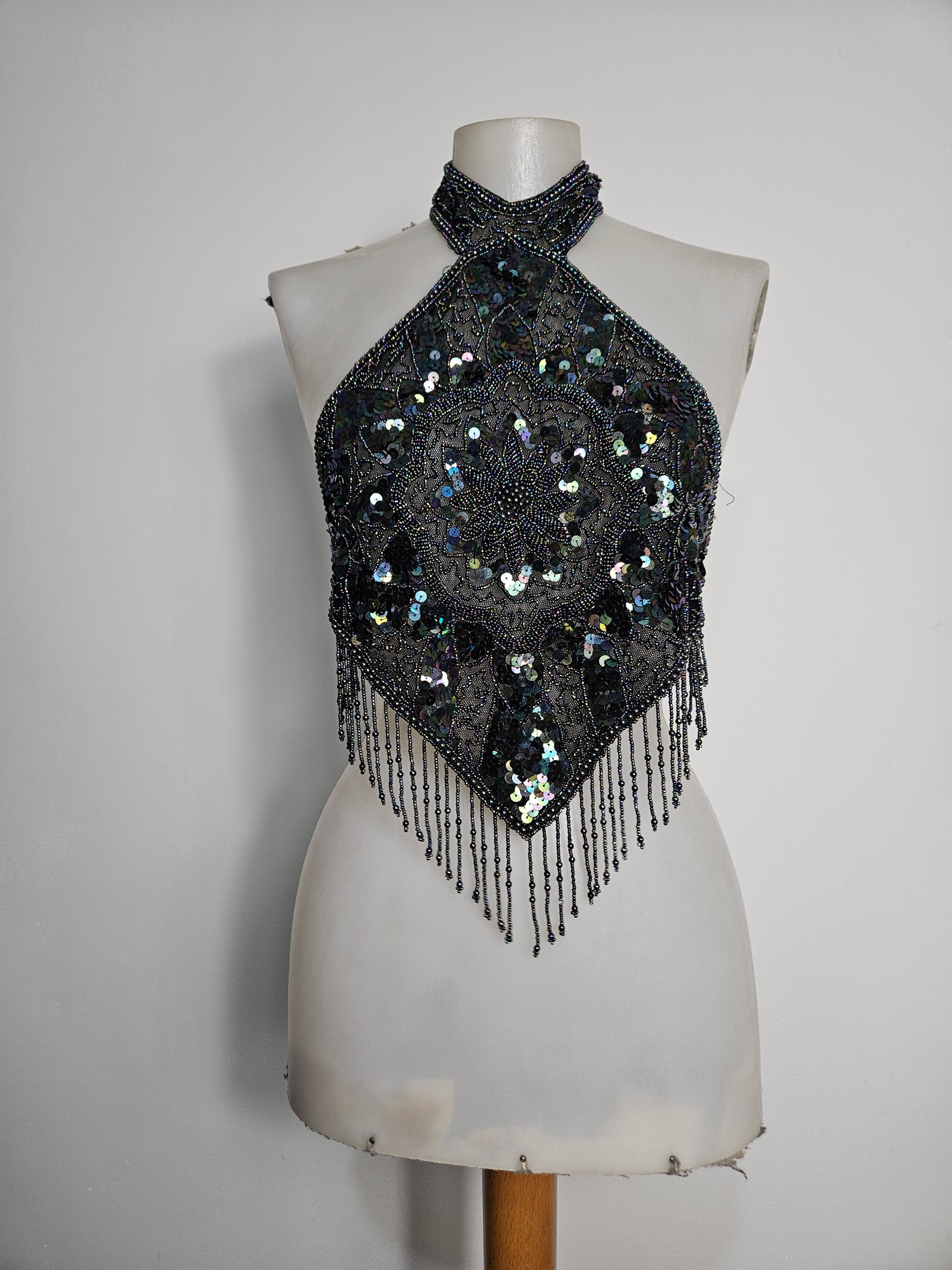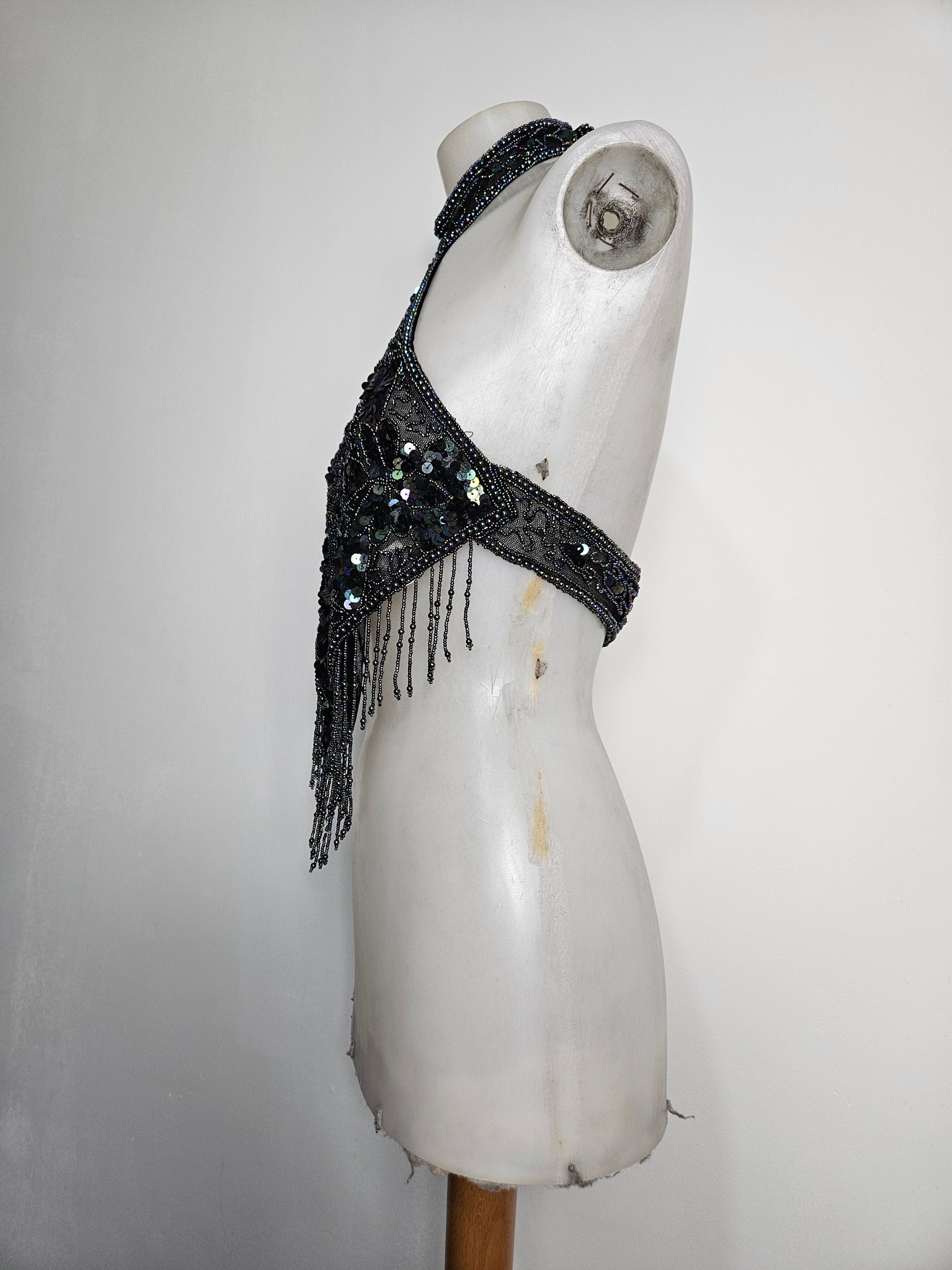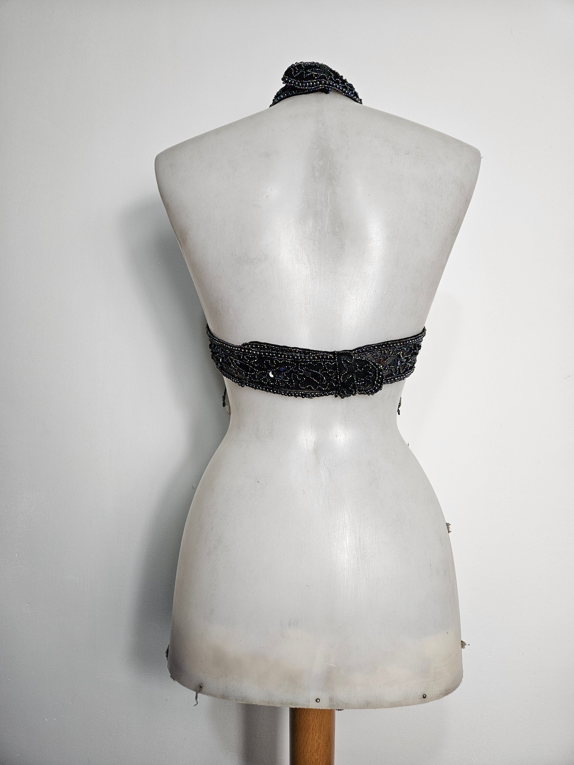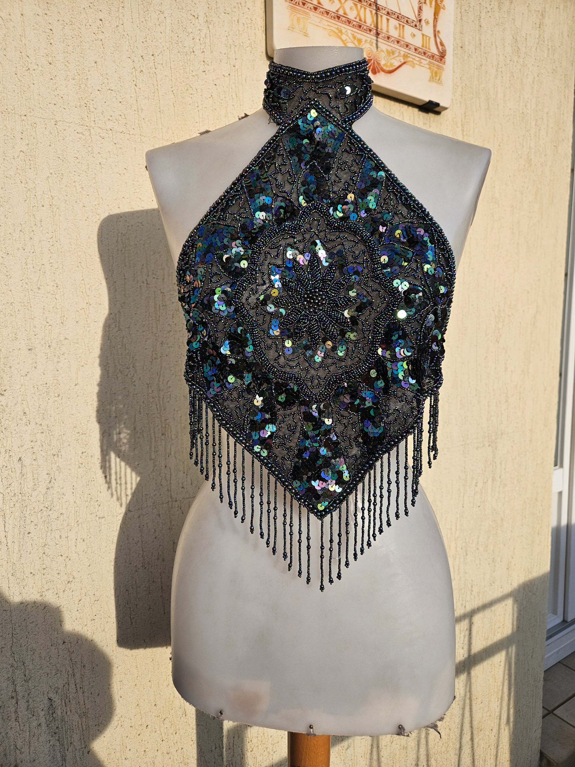 - Haut dos nu noir avec des seqins à reflets multicolores, porté en tour de cou.