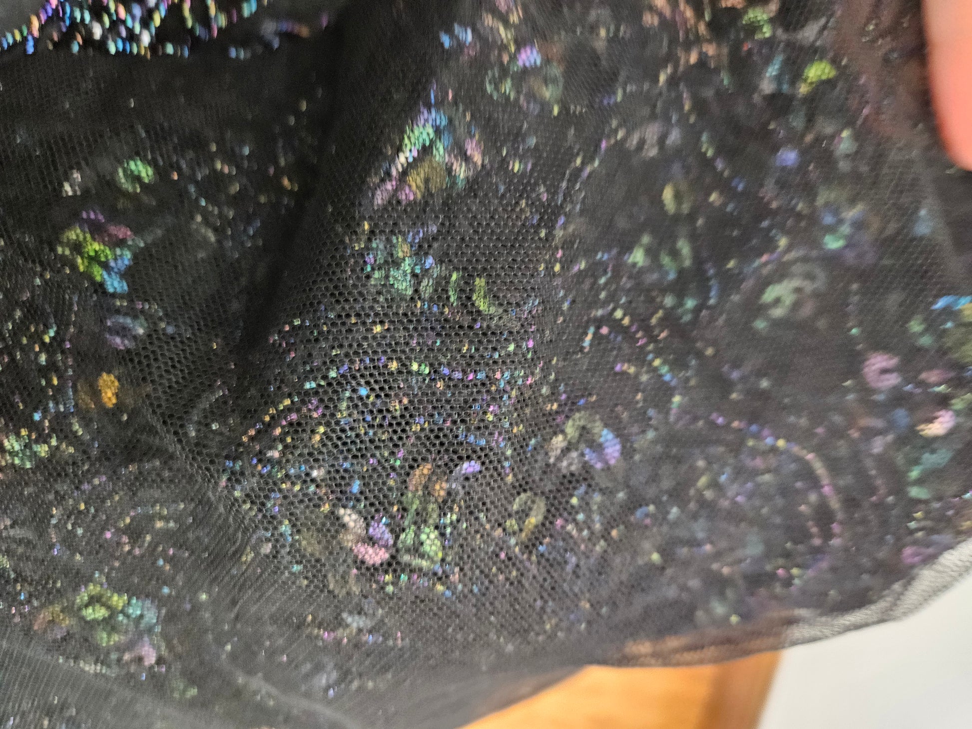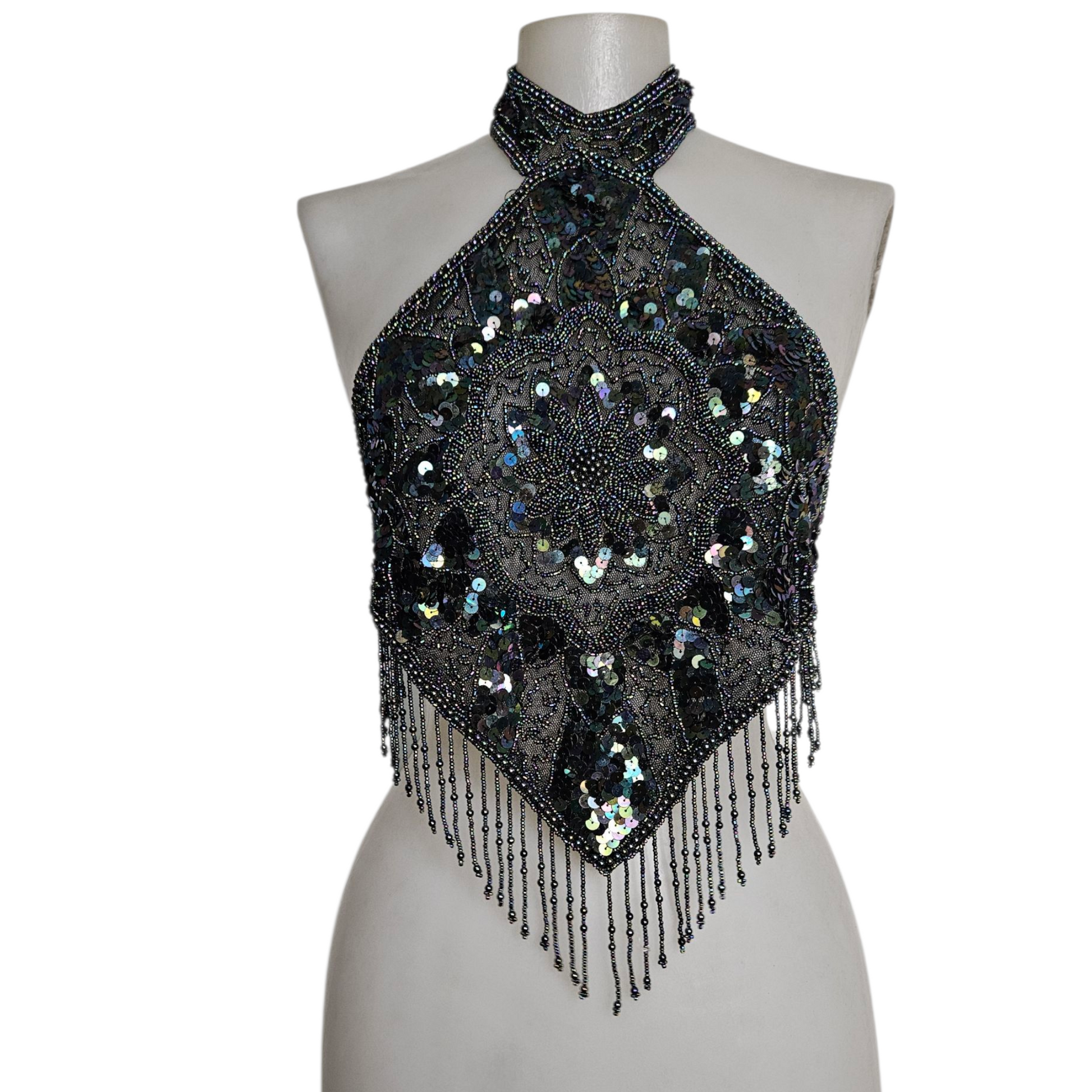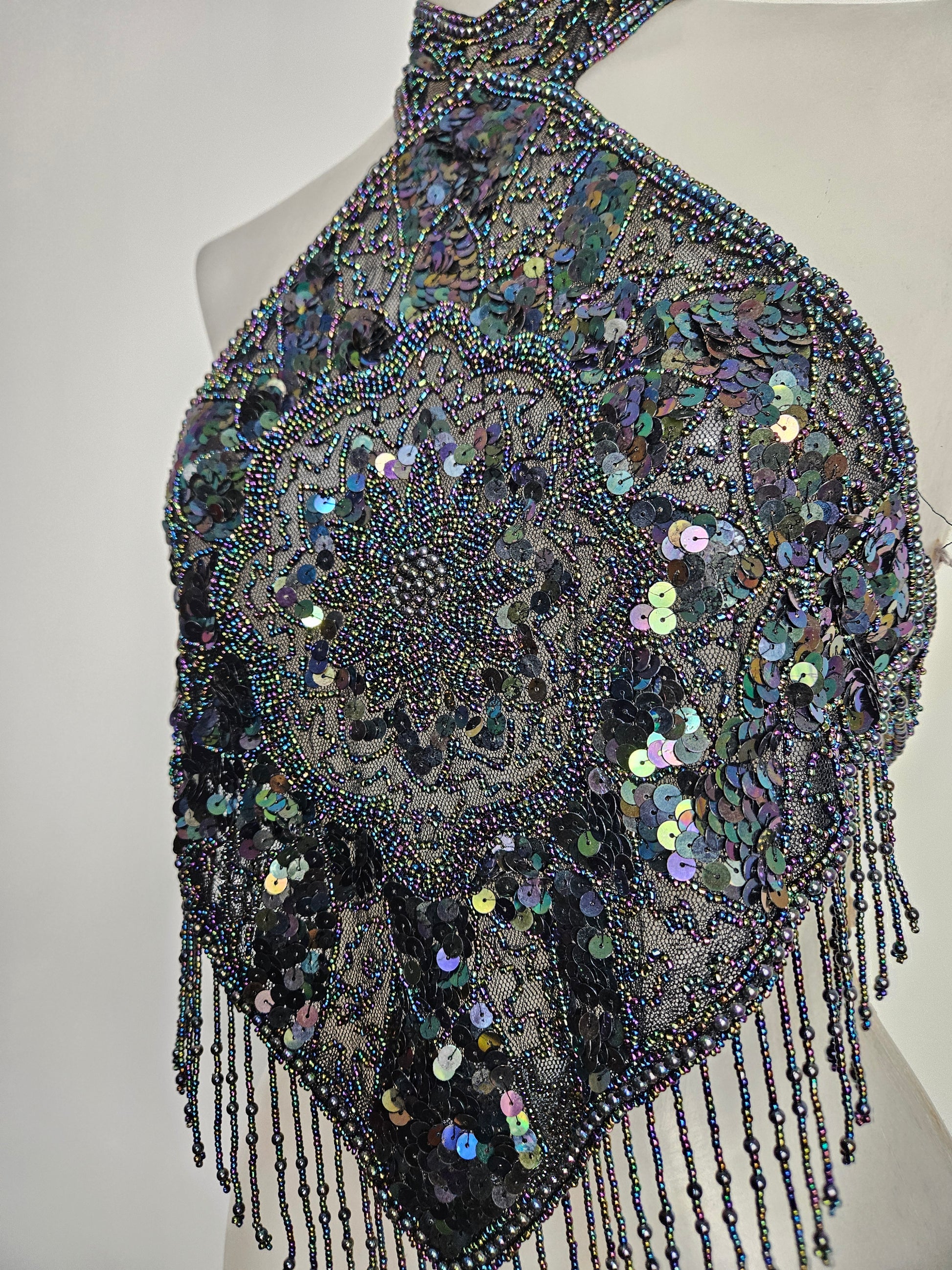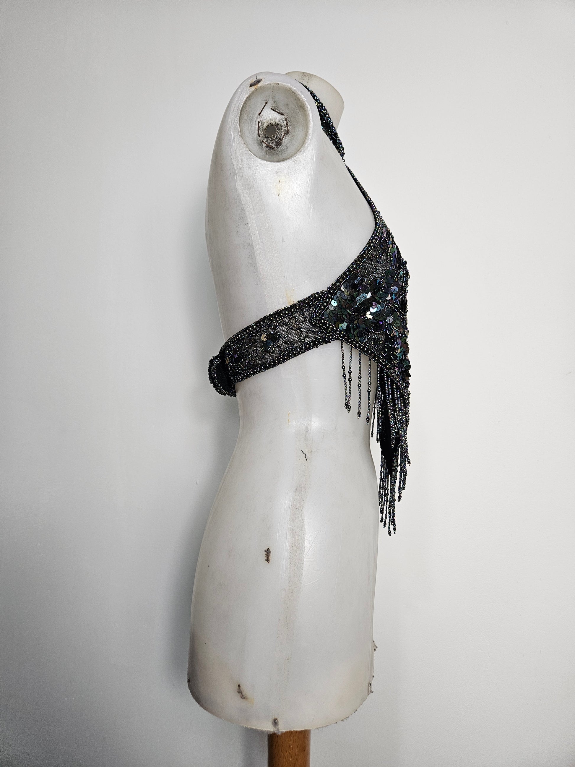- Haut dos nu noir avec des seqins à reflets multicolores, porté en tour de cou.