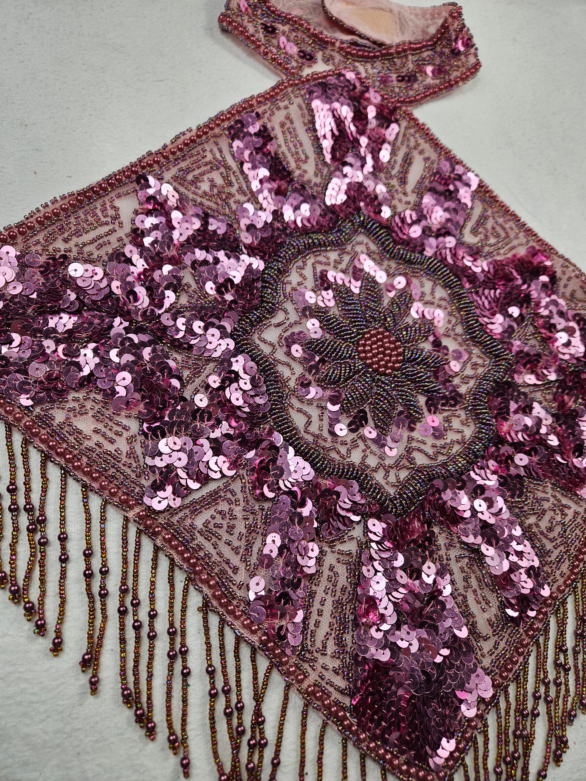 - La pièce est entièrement brodée de perles et de sequins formant des motifs géométriques et floraux.