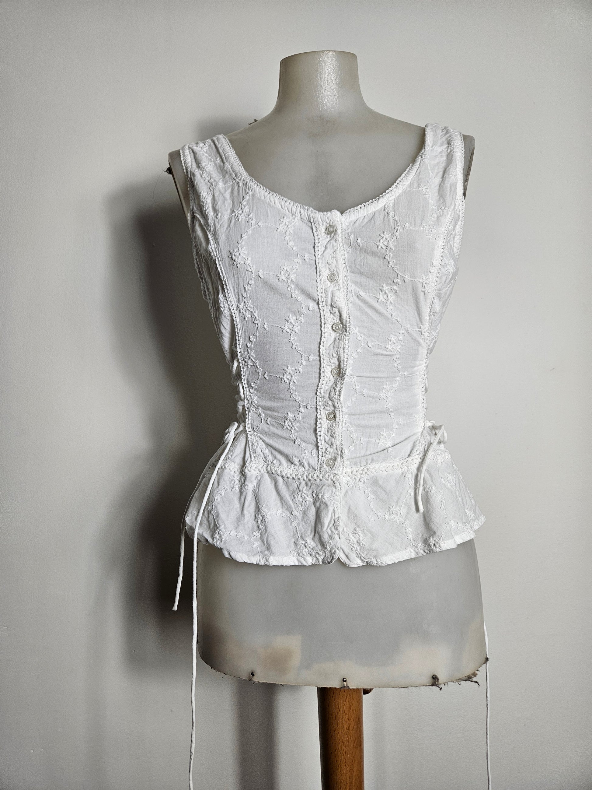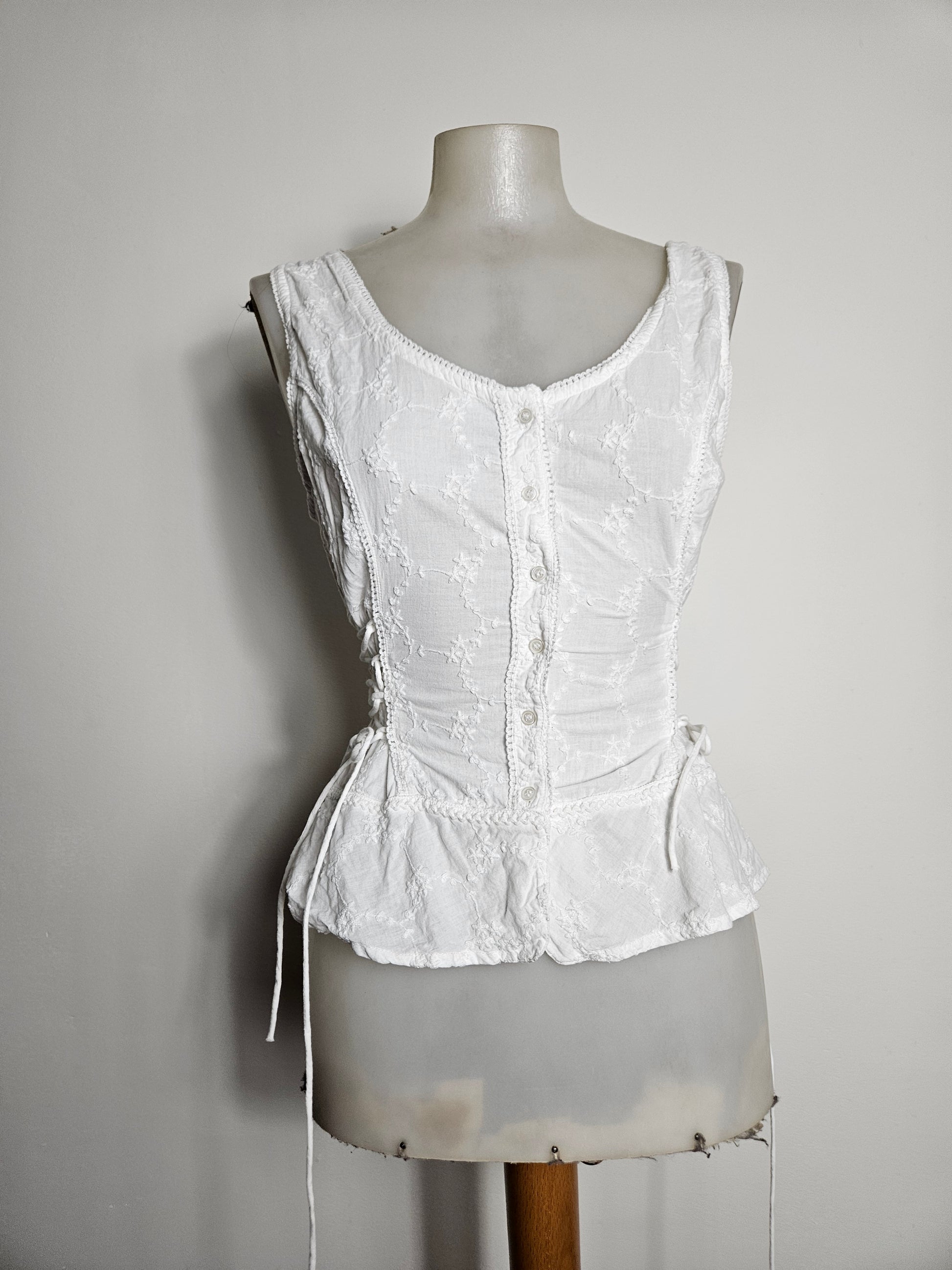 Haut sans manches de couleur blanche, à encolure arrondie. Modèle boutonné sur le devant. Tissu léger avec broderies florales ton sur ton réparties sur l’ensemble du vêtement. Coupe ajustée avec liens de serrage latéraux permettant d’ajuster la taille. Bas légèrement évasé avec effet péplum.