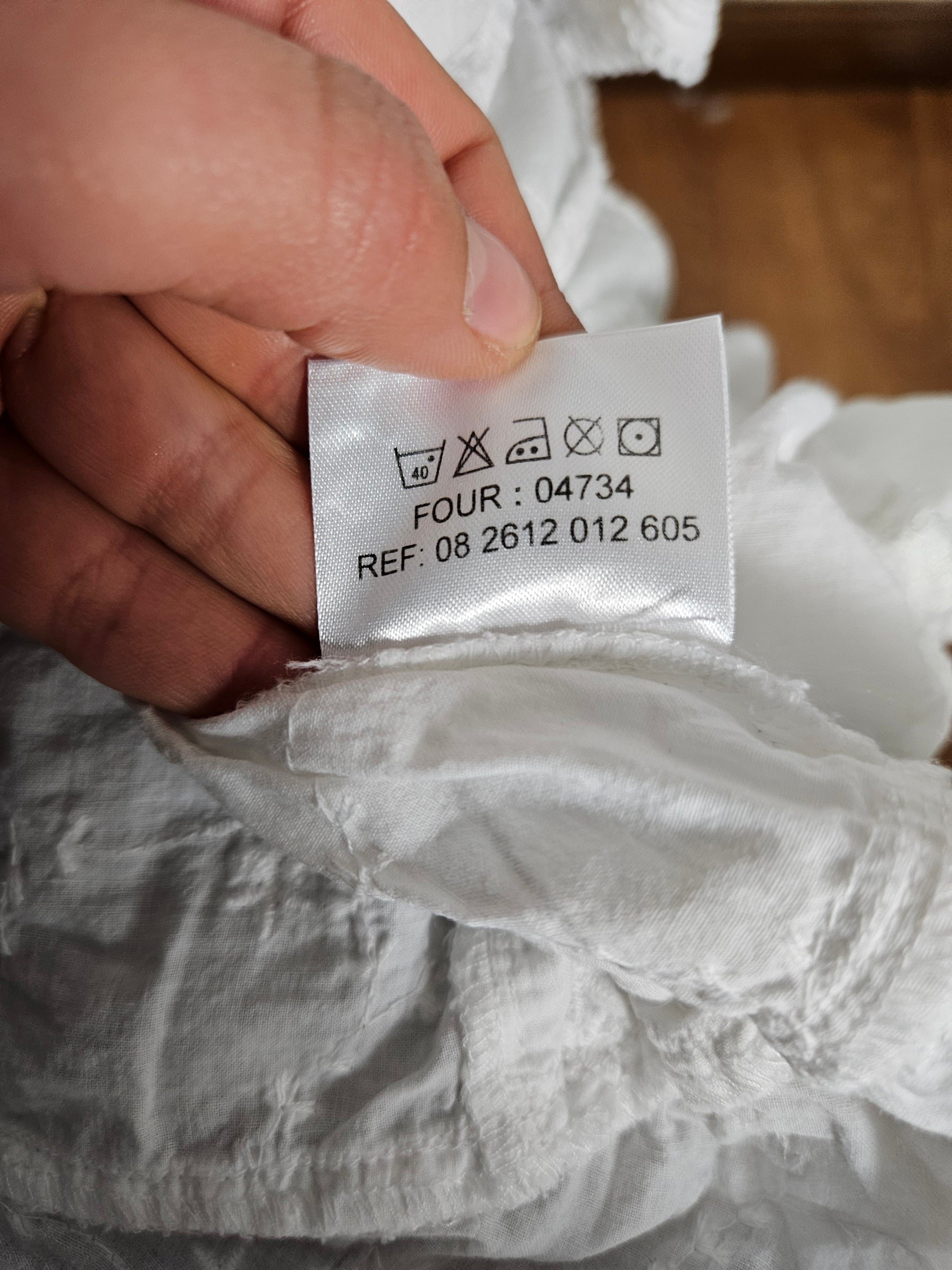 Entretien : Lavage en machine à 40 °C, Ne pas utiliser de javel, Repassage à température moyenne, Ne pas nettoyer à sec, Séchage en machine autorisé à basse température