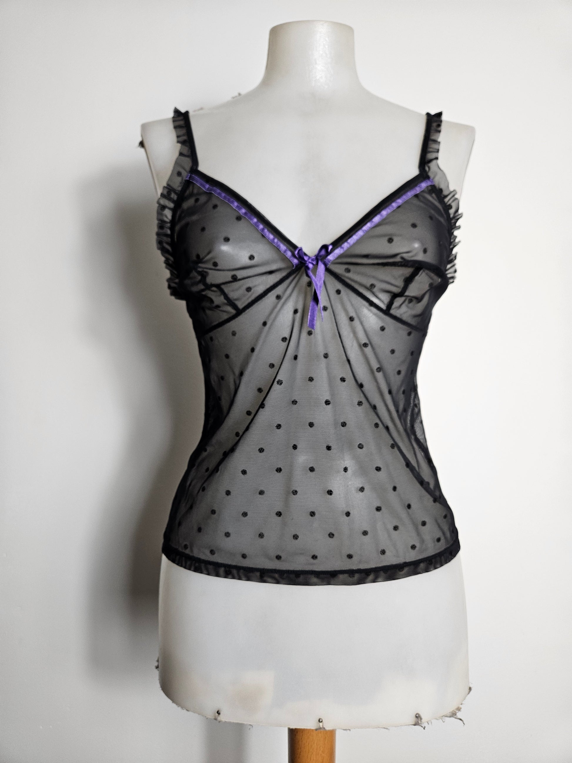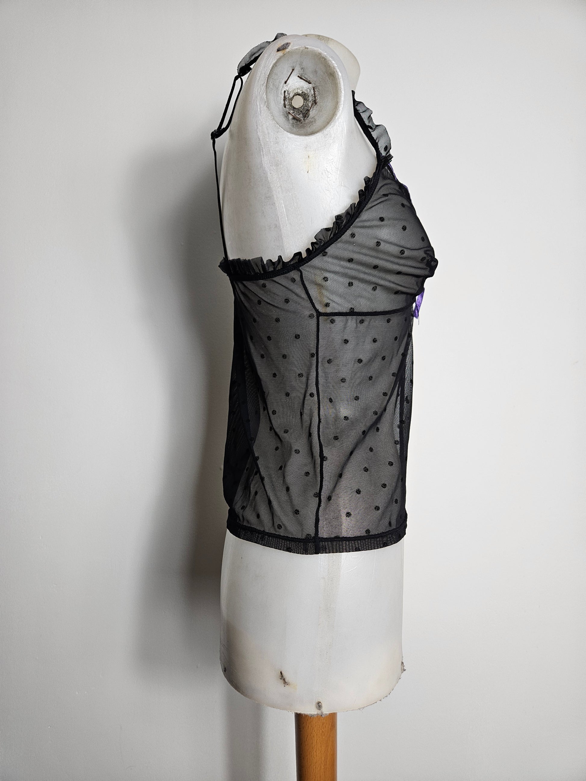 Haut esprit lingerie en mesh noir semi-transparent avec motif à pois floqués.