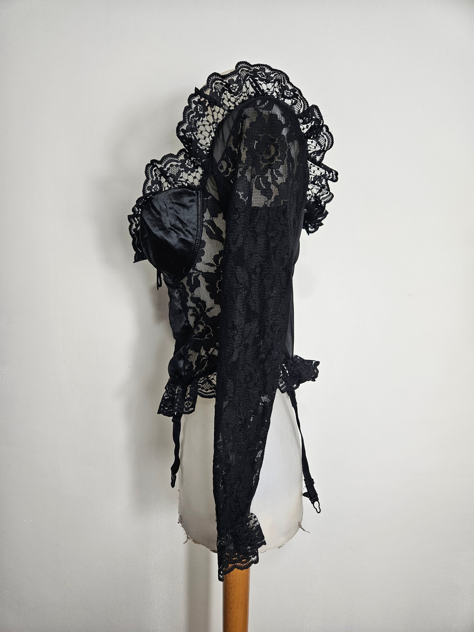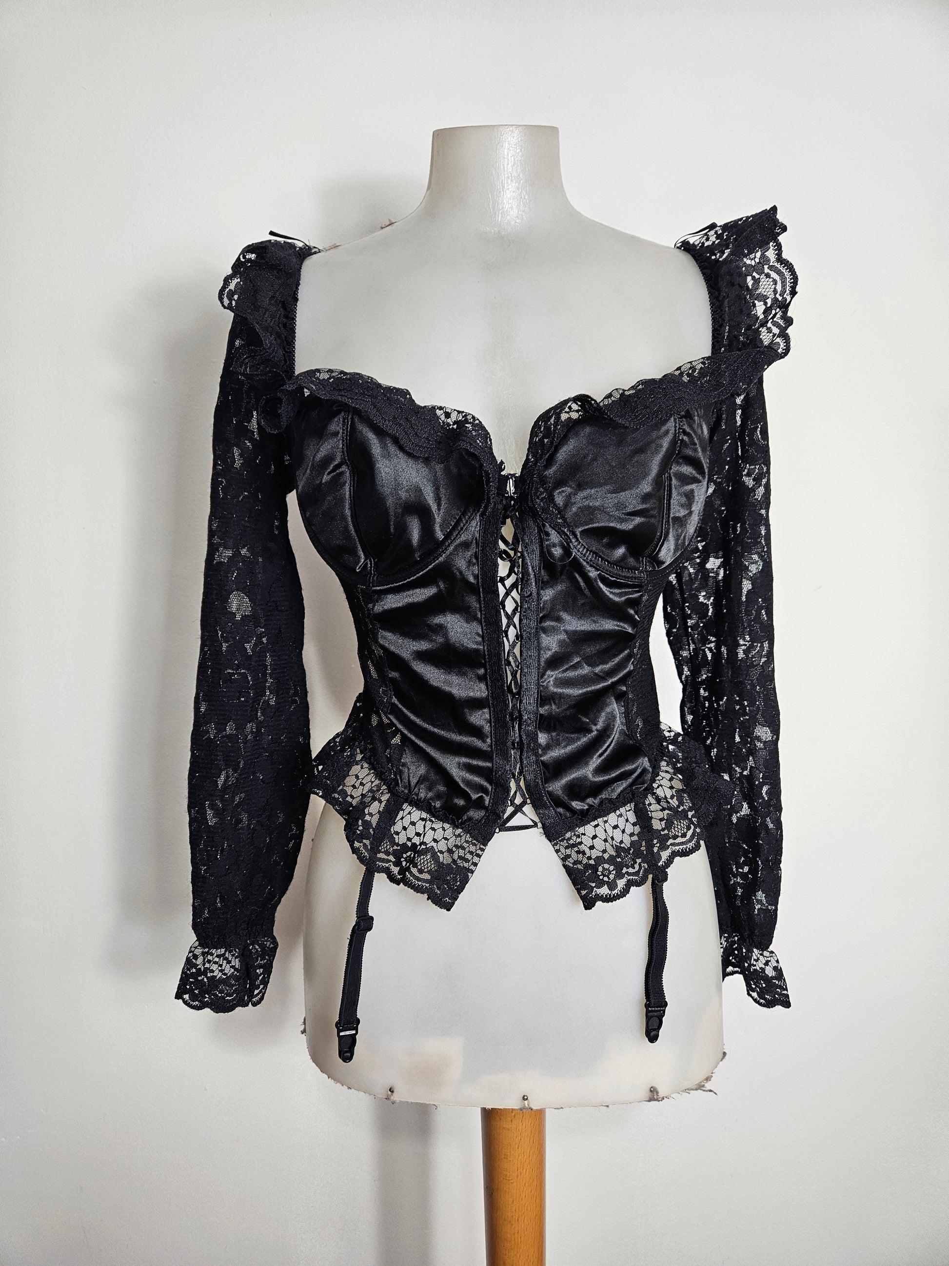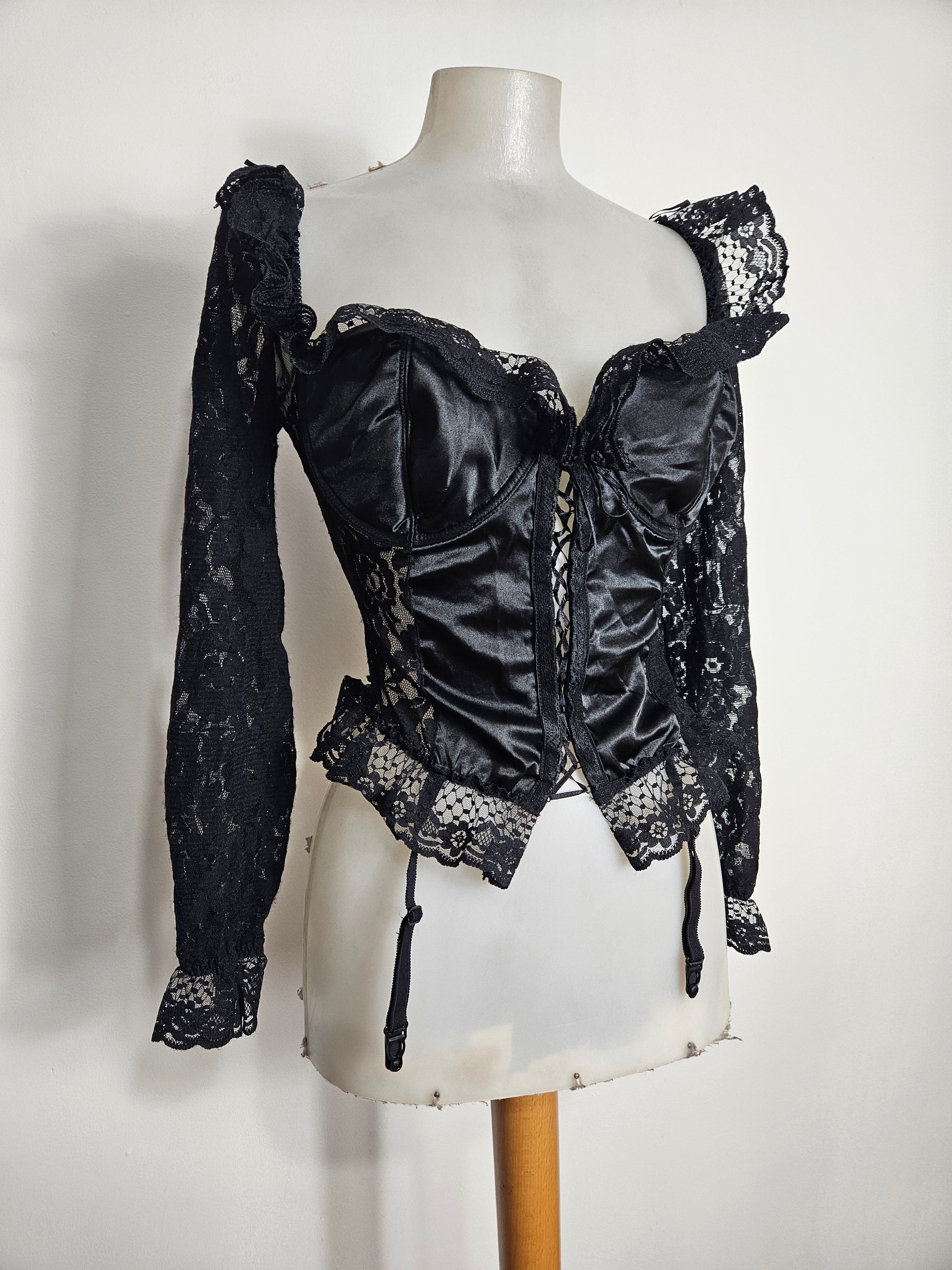 Top corset noir avec structure baleinée. Bonnets intégrés. Fermeture par laçage à l’avant. Manches longues en dentelle. Empiècements en dentelle au bas et formant des volants autour du décolleté. Décolleté en forme de coeur. Présence de jarretelles réglables amovibles. Tissu principal satiné, détails en dentelle. Dos en voile transparent