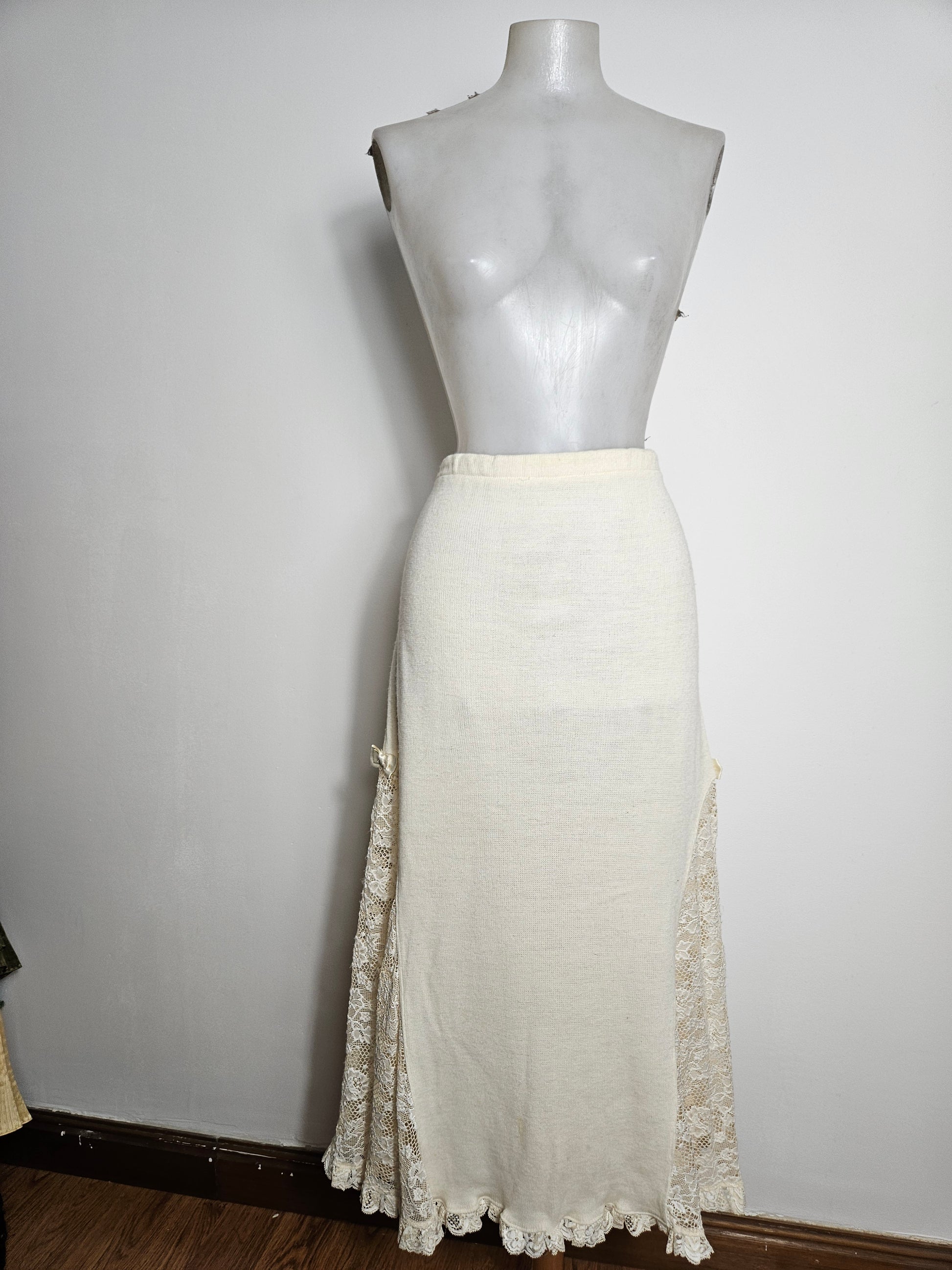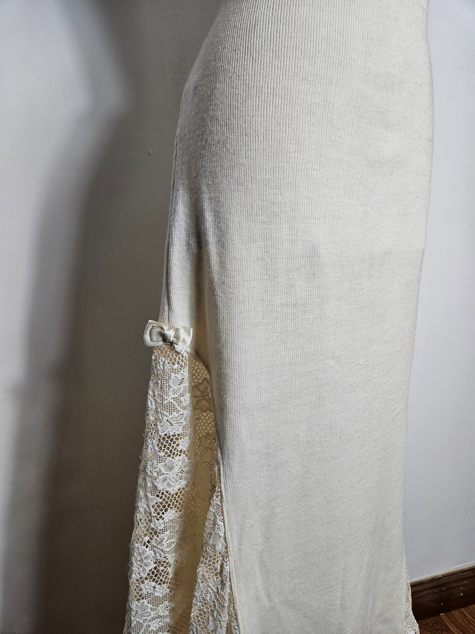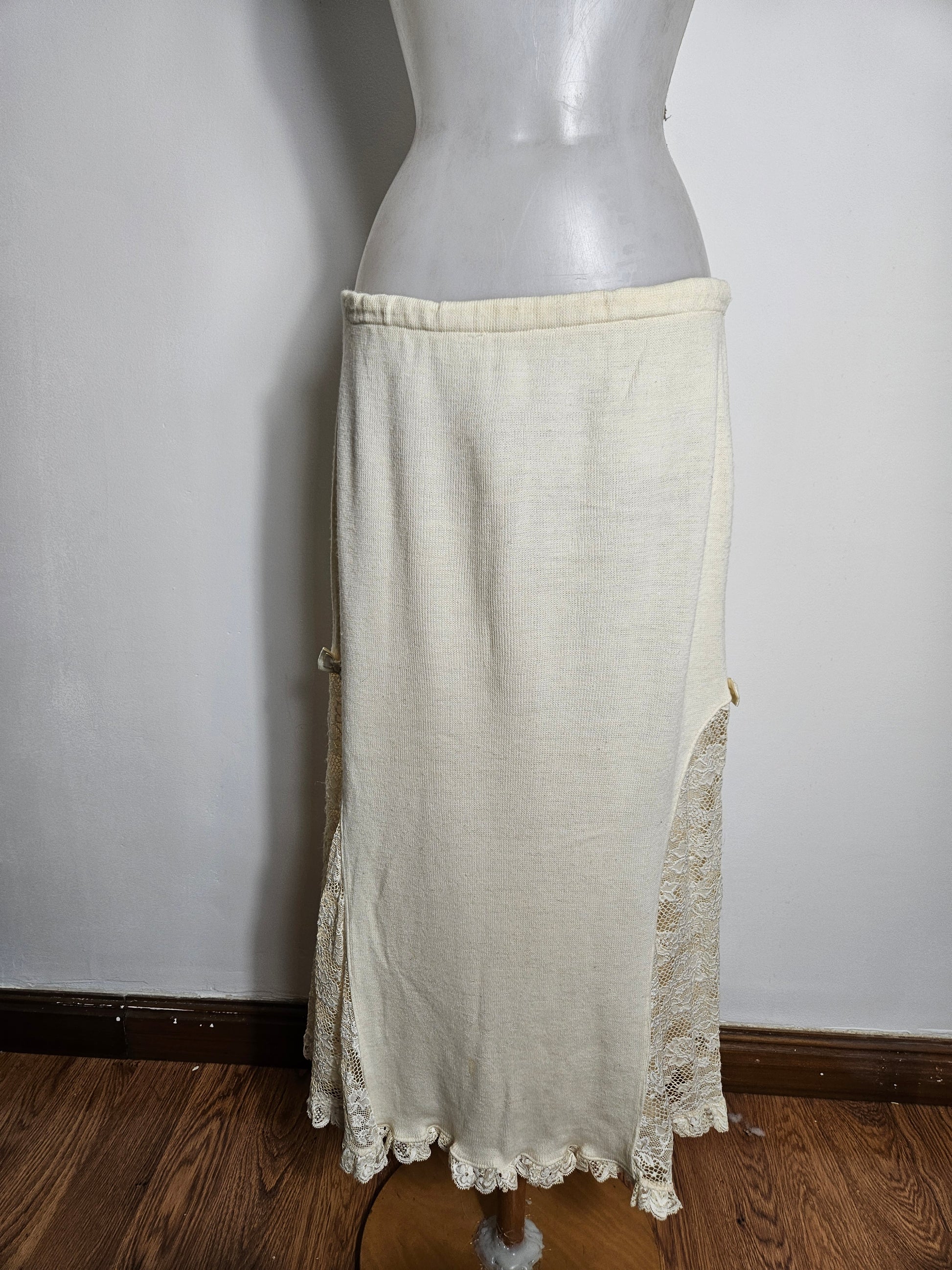 Jupe longue écrue/ton crème en maille fine. Modèle près du corps avec empiècements latéraux en dentelle florale contrastante. Finition dentelée au bas de la jupe. Détails de petits nœuds sur les côtés.