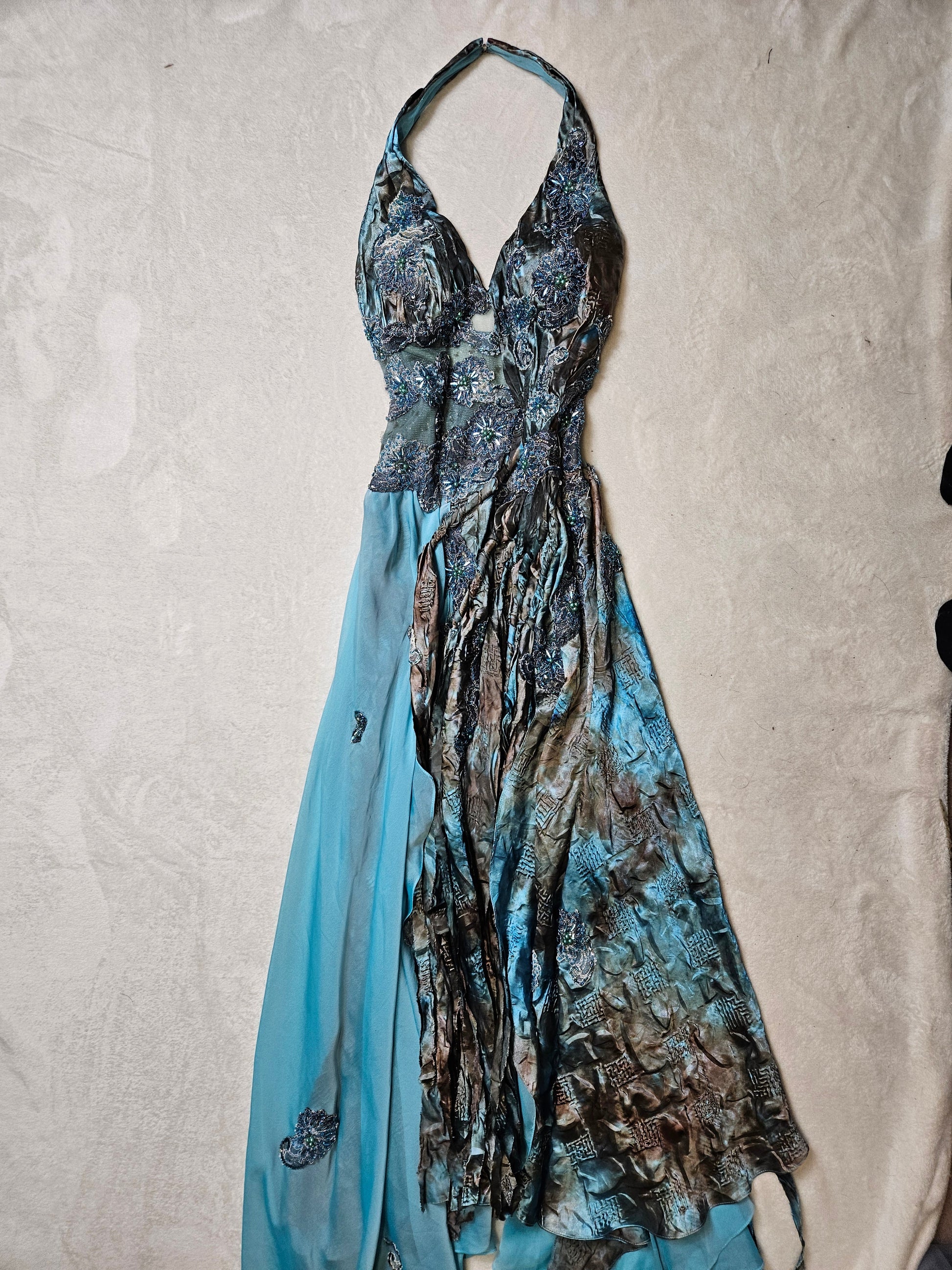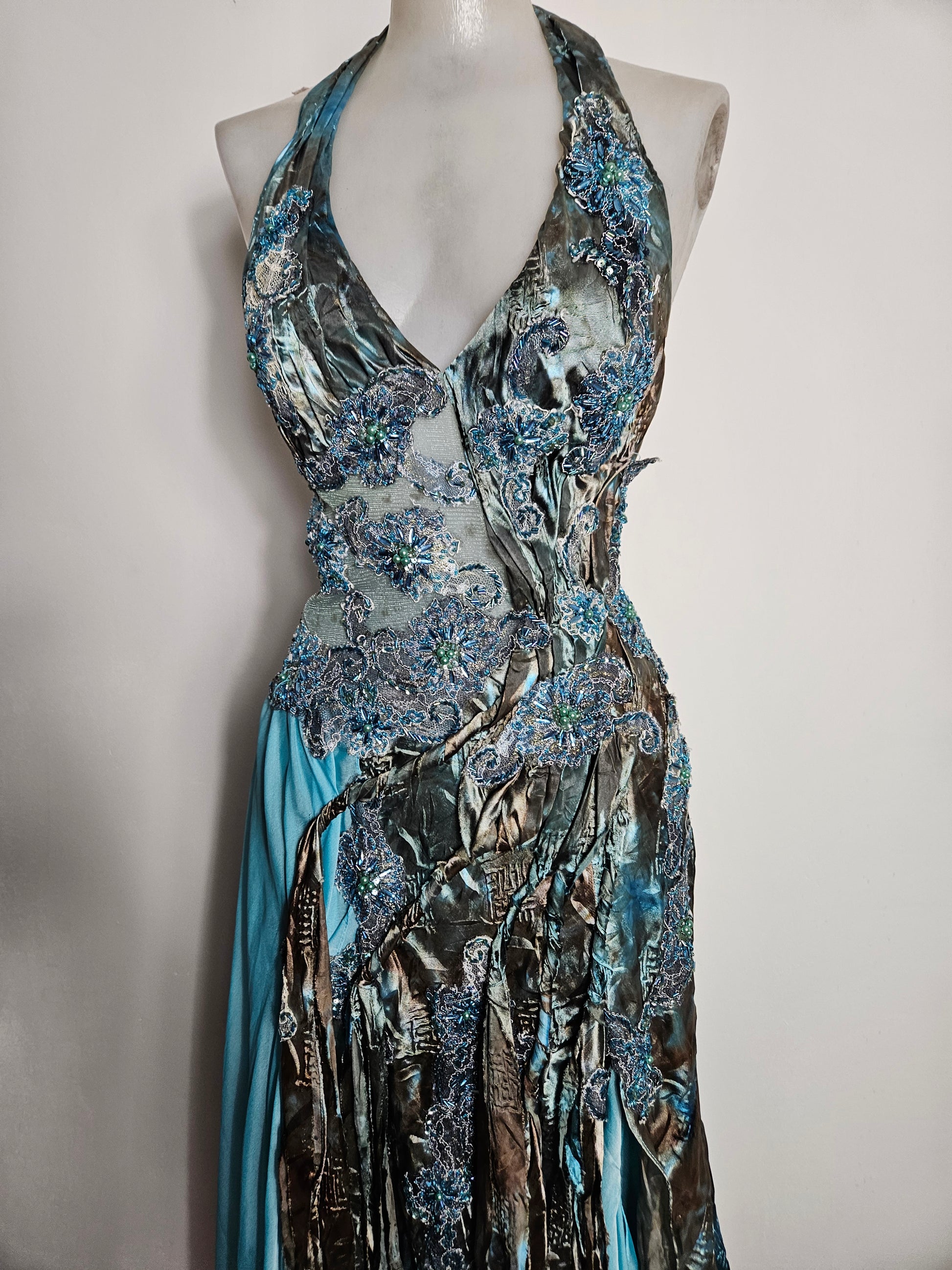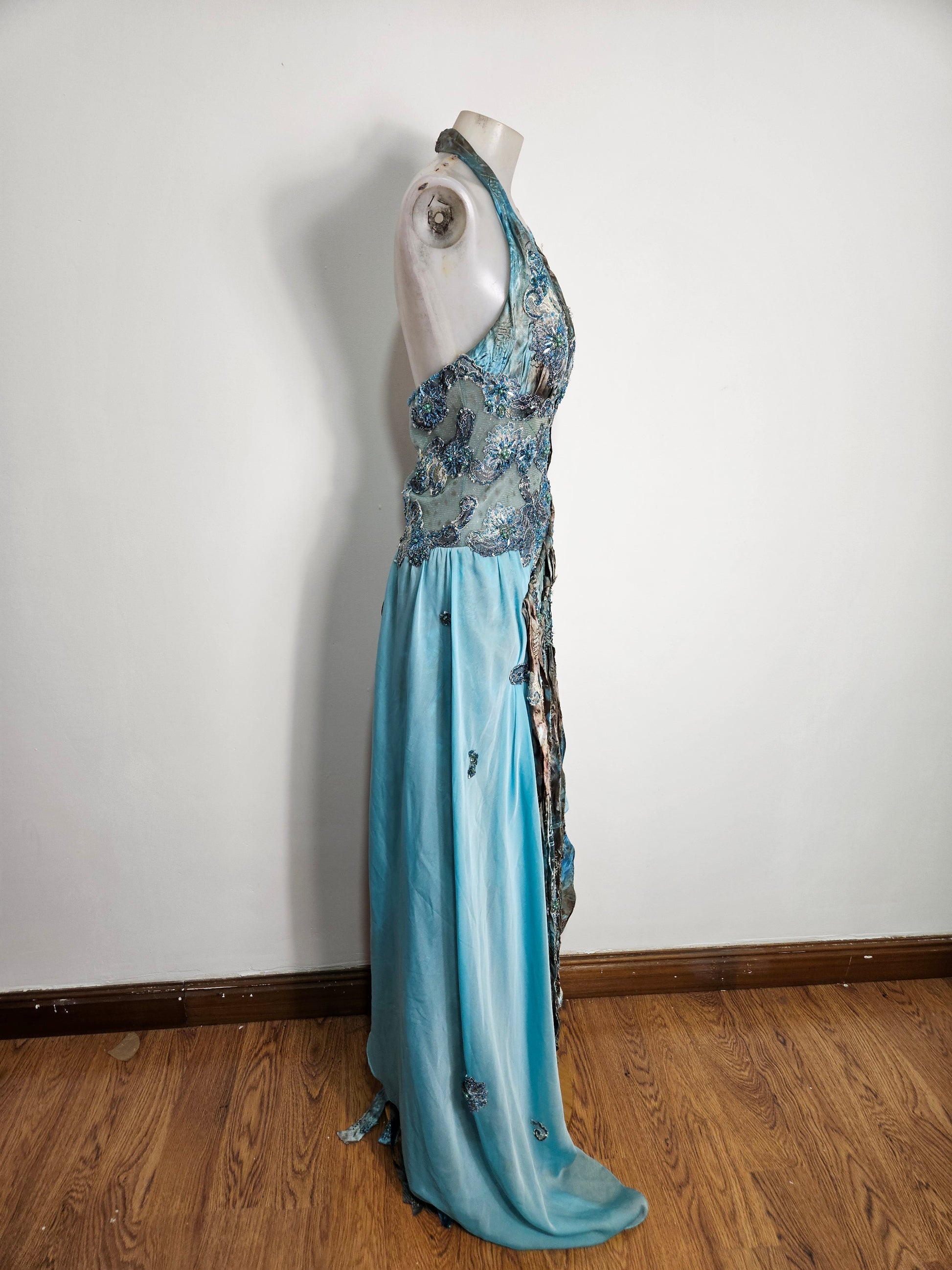Vestido largo azul bordado con espalda abierta