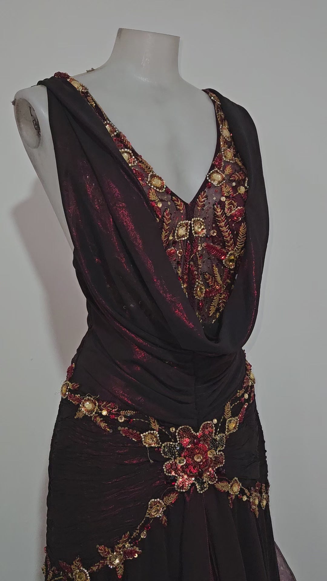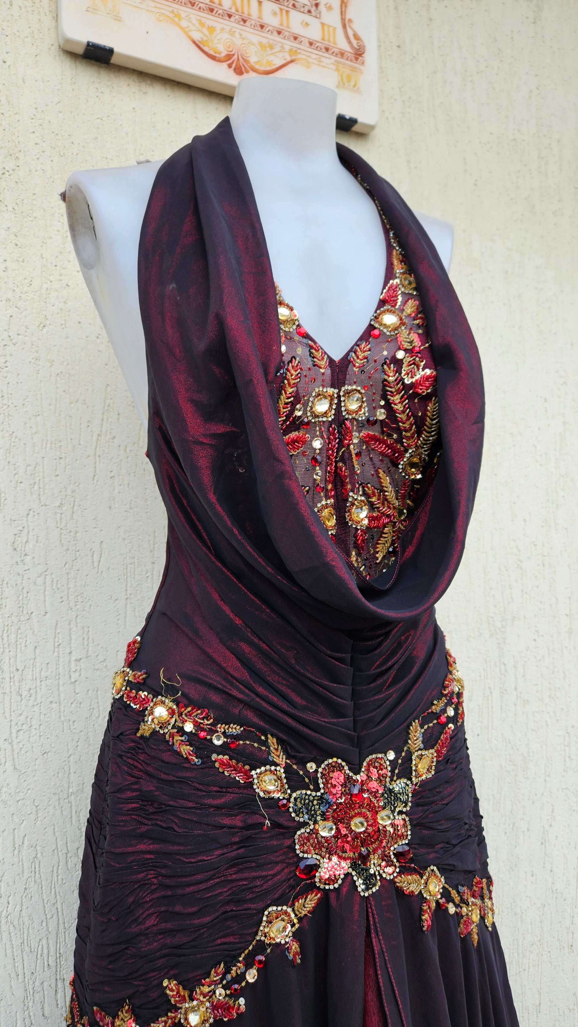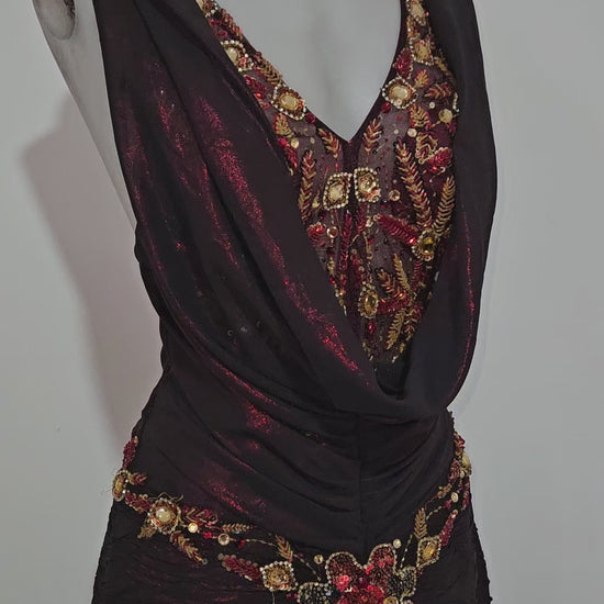 Robe longue vintage de soirée, couleur bordeaux et noir, en matière fluide et légèrement transparente. Modèle dos nu avec bretelles style halter (tour de cou) et drapé sur le buste. Taille marquée avec fronces et ornements brodés/perlés (strass et détails dorés) sur le devant, la ceinture et les bretelles. Jupe longue avec superposition effet voile et tombé ample.