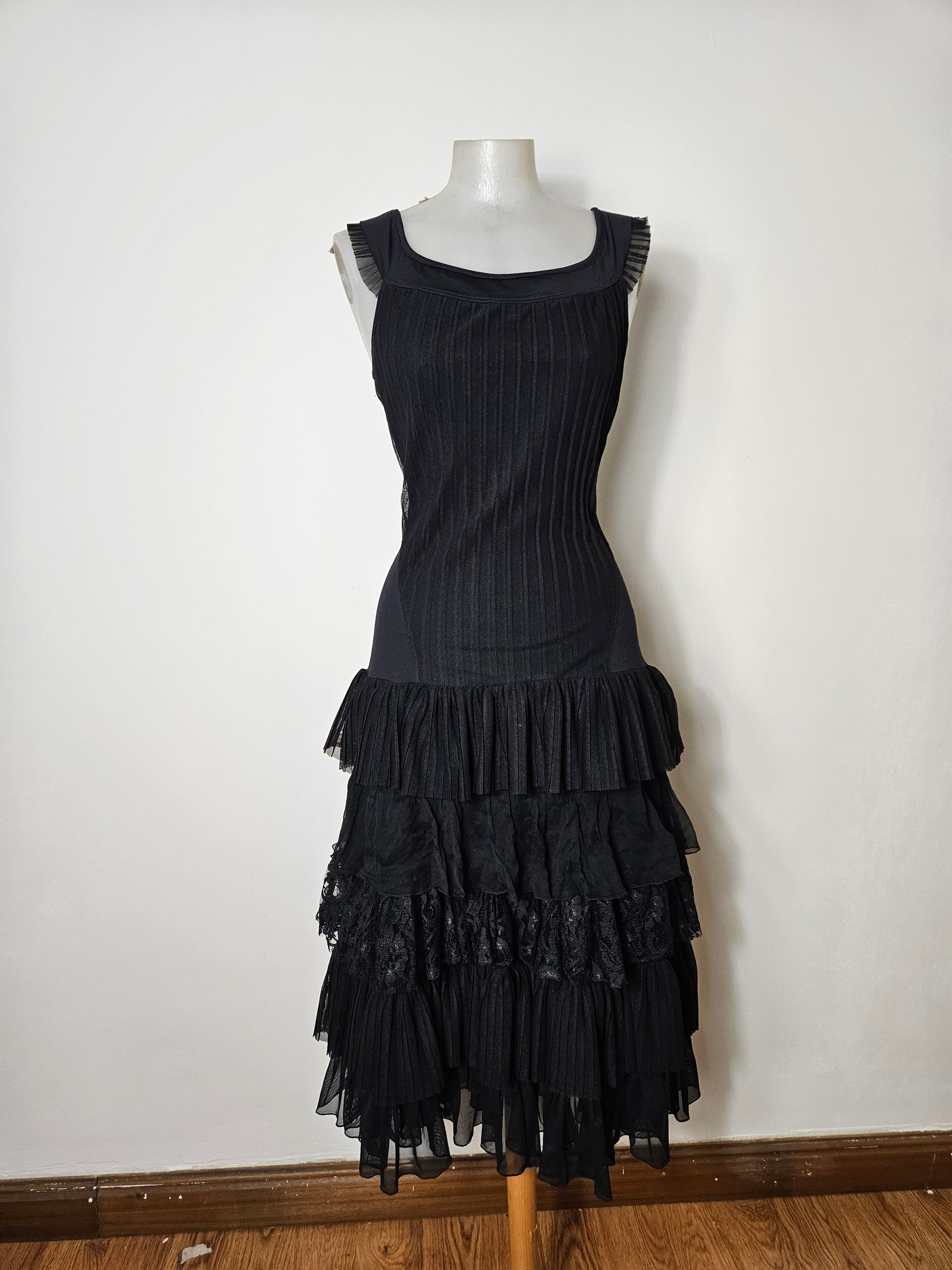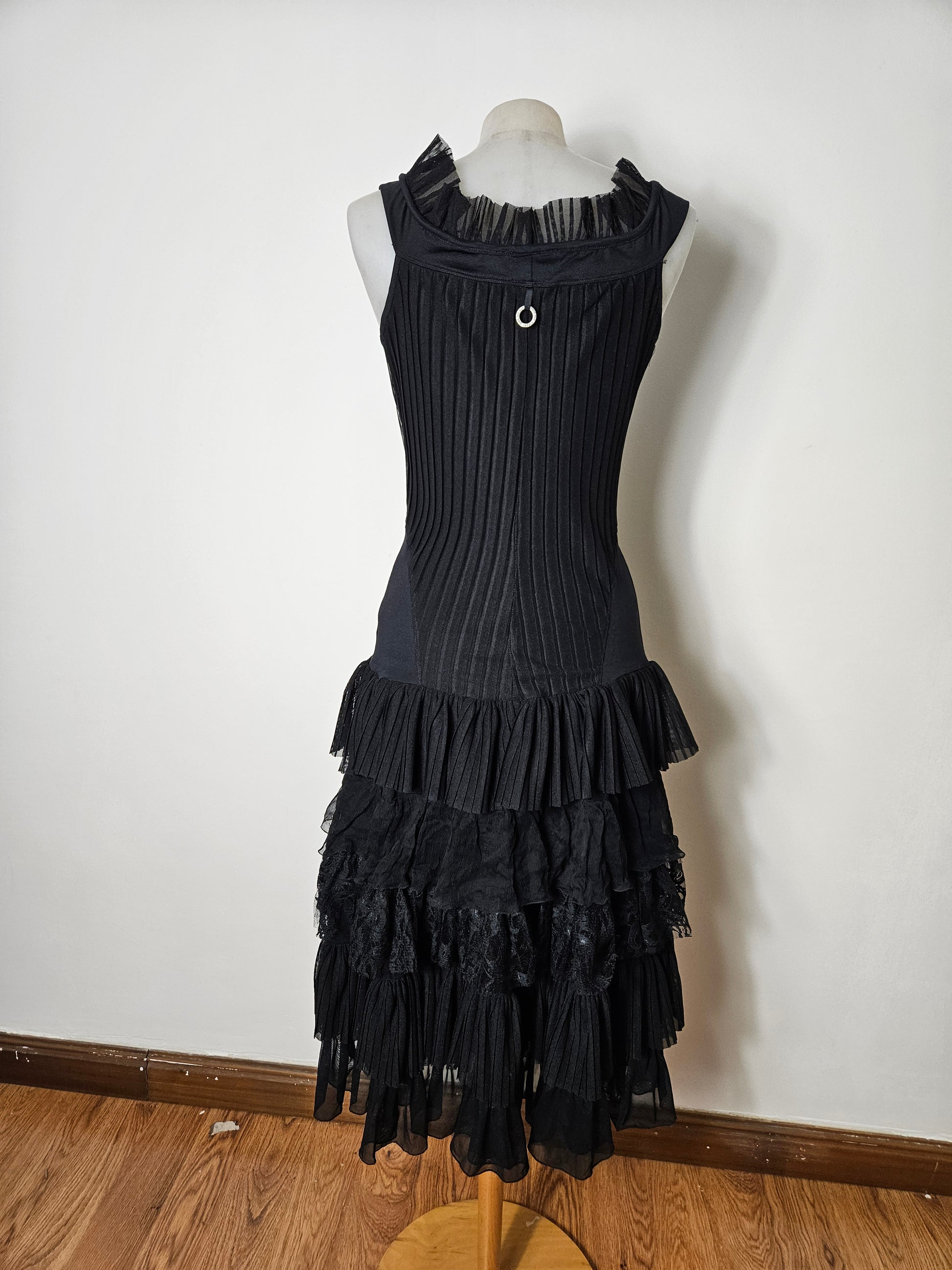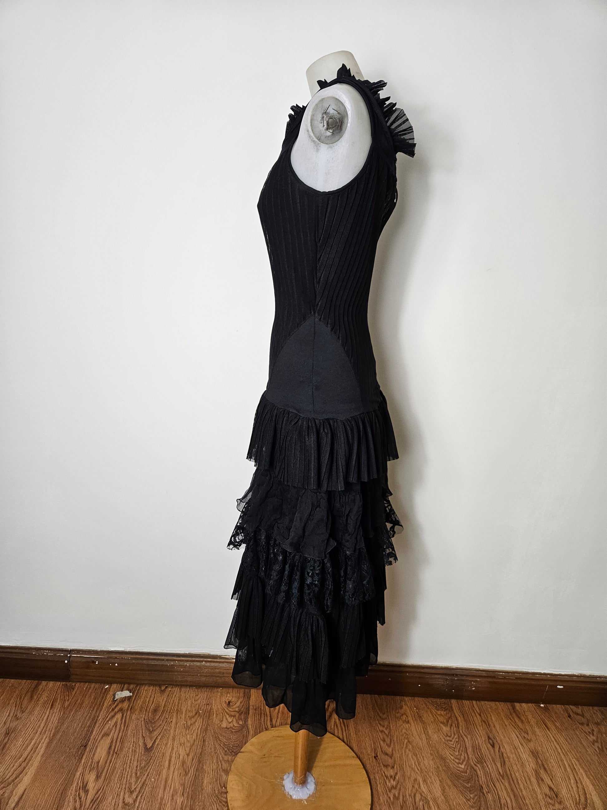 Robe noire sans manches, coupe ajustée sur le buste avec jupe à volants superposés. Encolure arrondie, détails de volants en tulle et dentelle sur les épaules et le bas de la robe. Longueur au-dessus du genou. Matière fluide et légèrement transparente sur les volants. De la marque Save the Queen