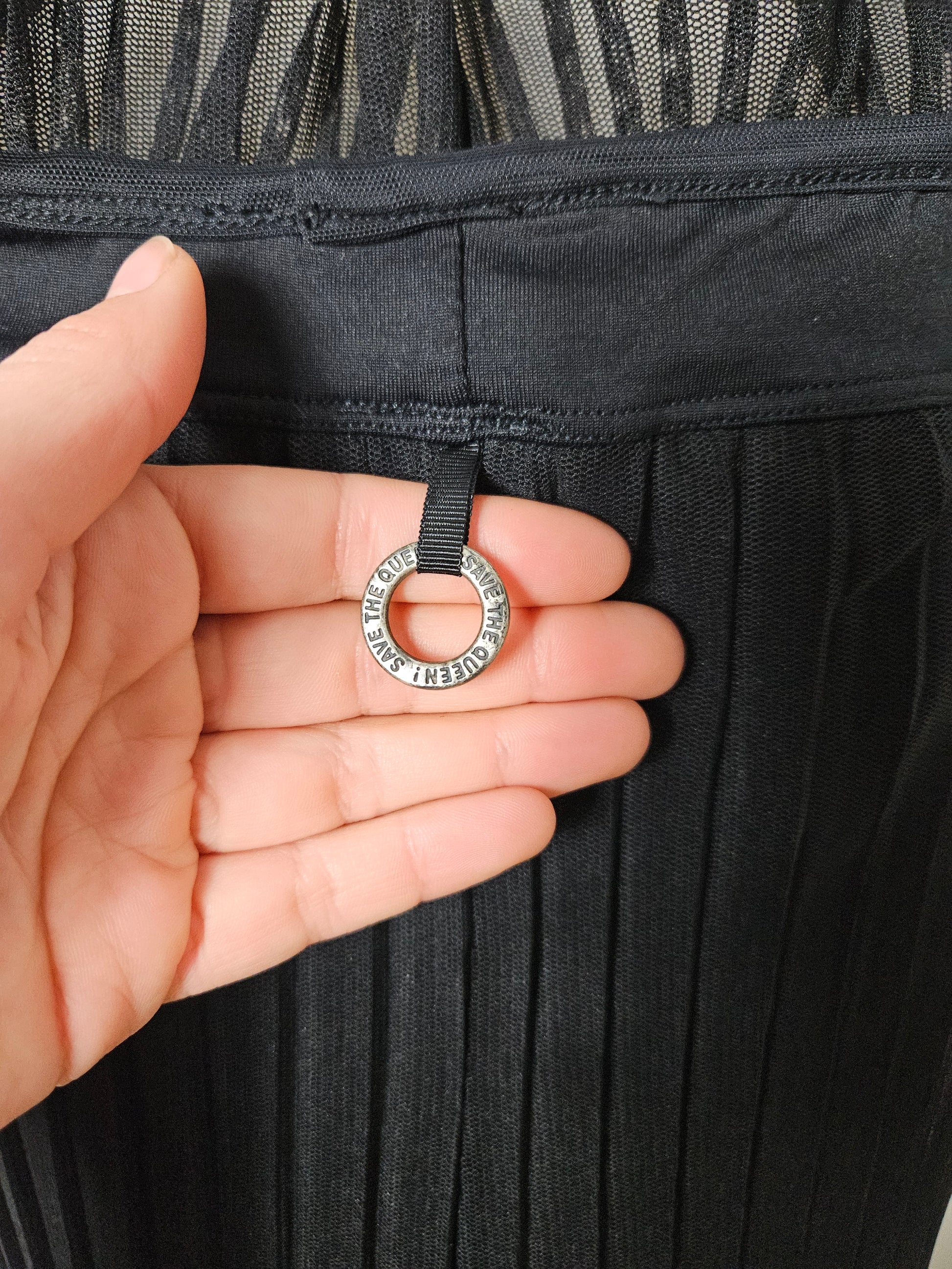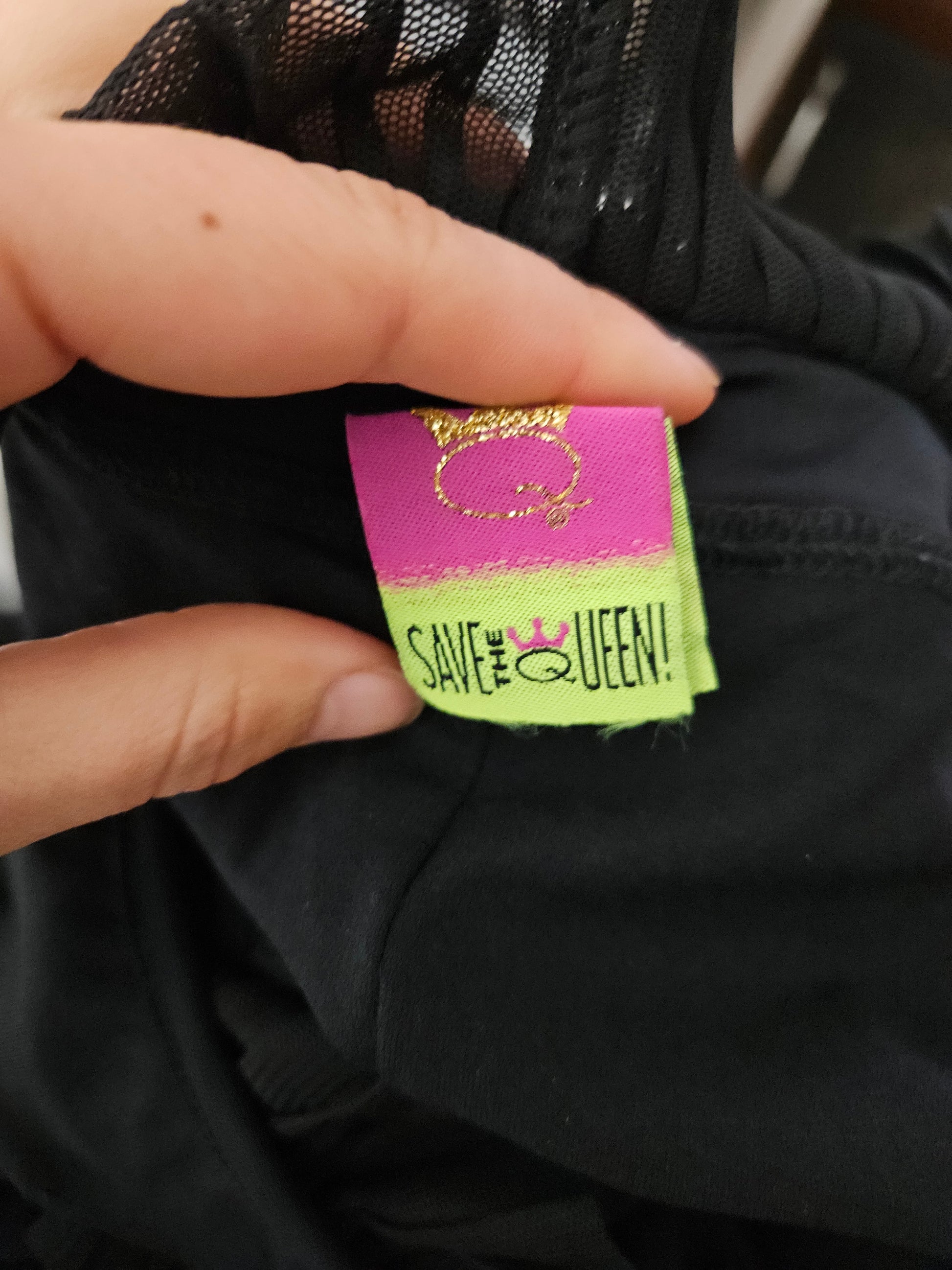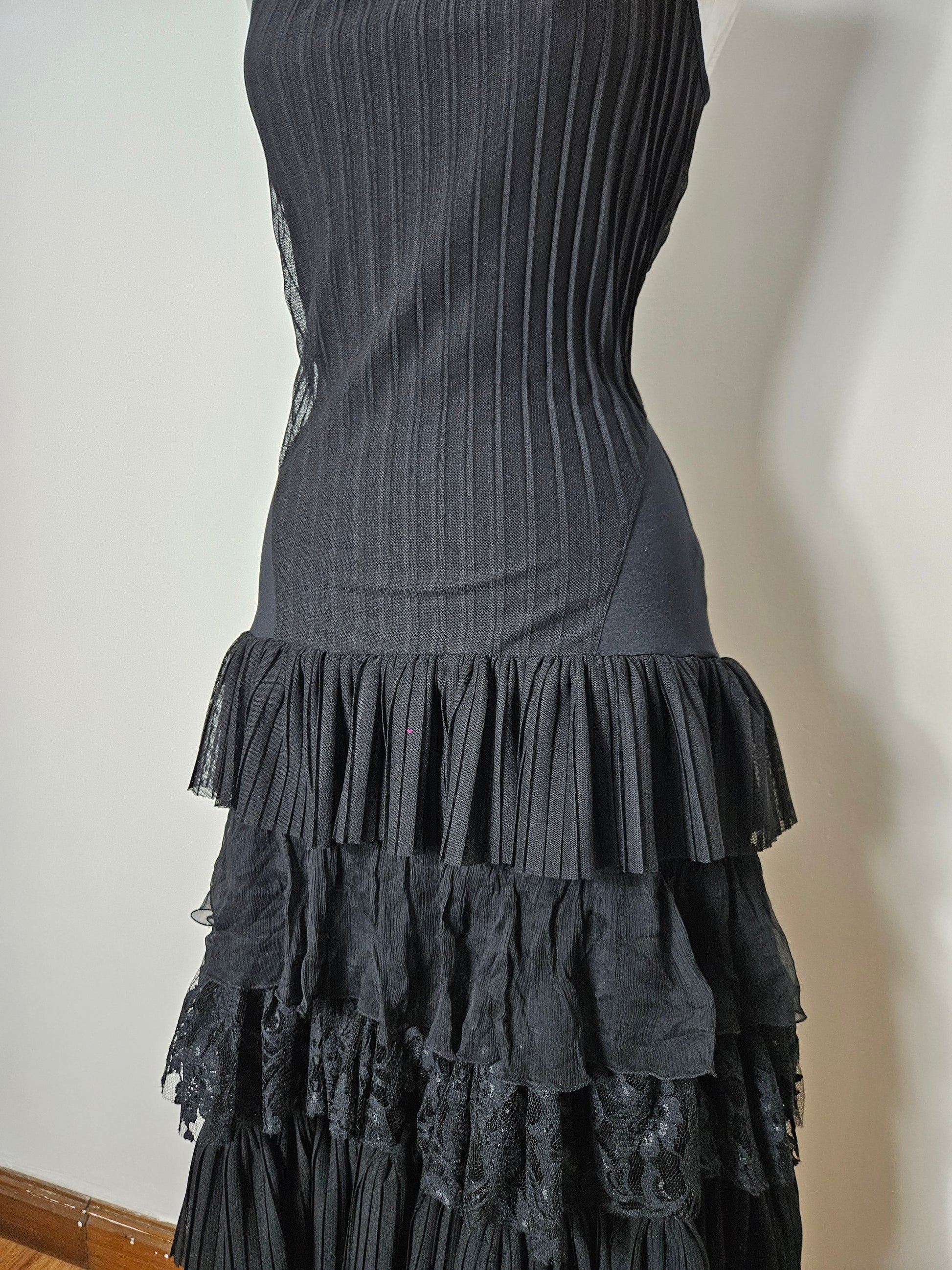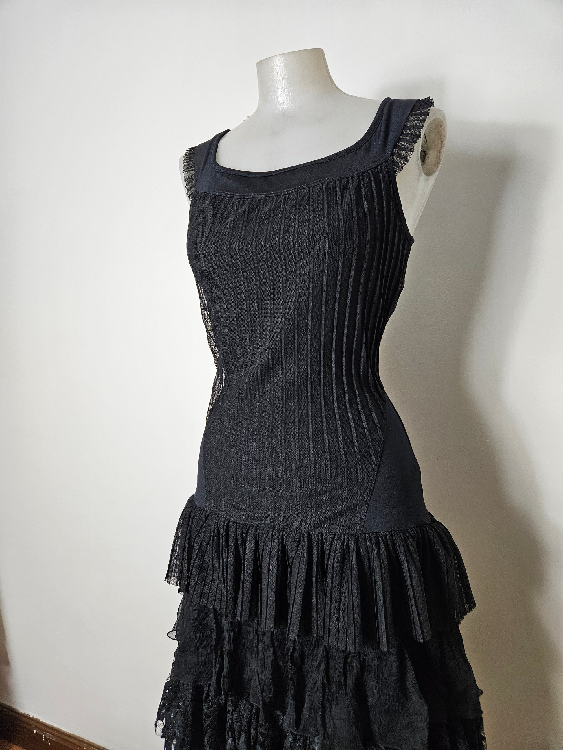 Robe noire sans manches, coupe ajustée sur le buste avec jupe à volants superposés. Encolure arrondie, détails de volants en tulle et dentelle sur les épaules et le bas de la robe. Longueur au-dessus du genou. Matière fluide et légèrement transparente sur les volants. De la marque Save the Queen
