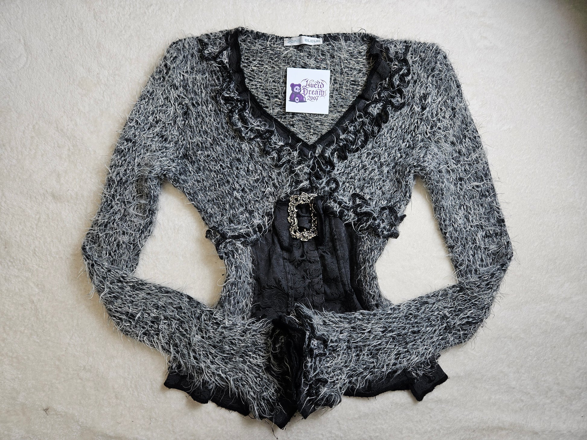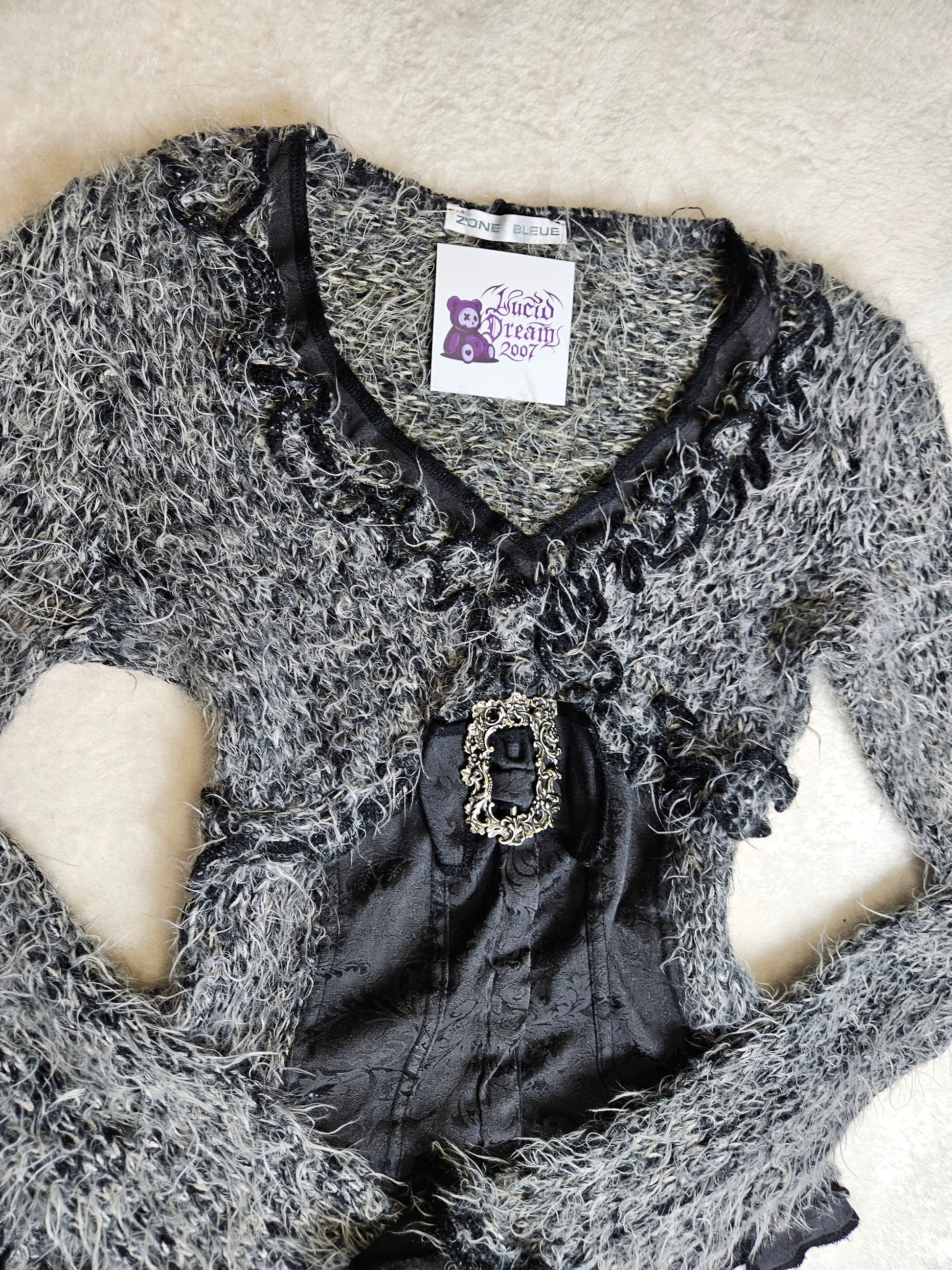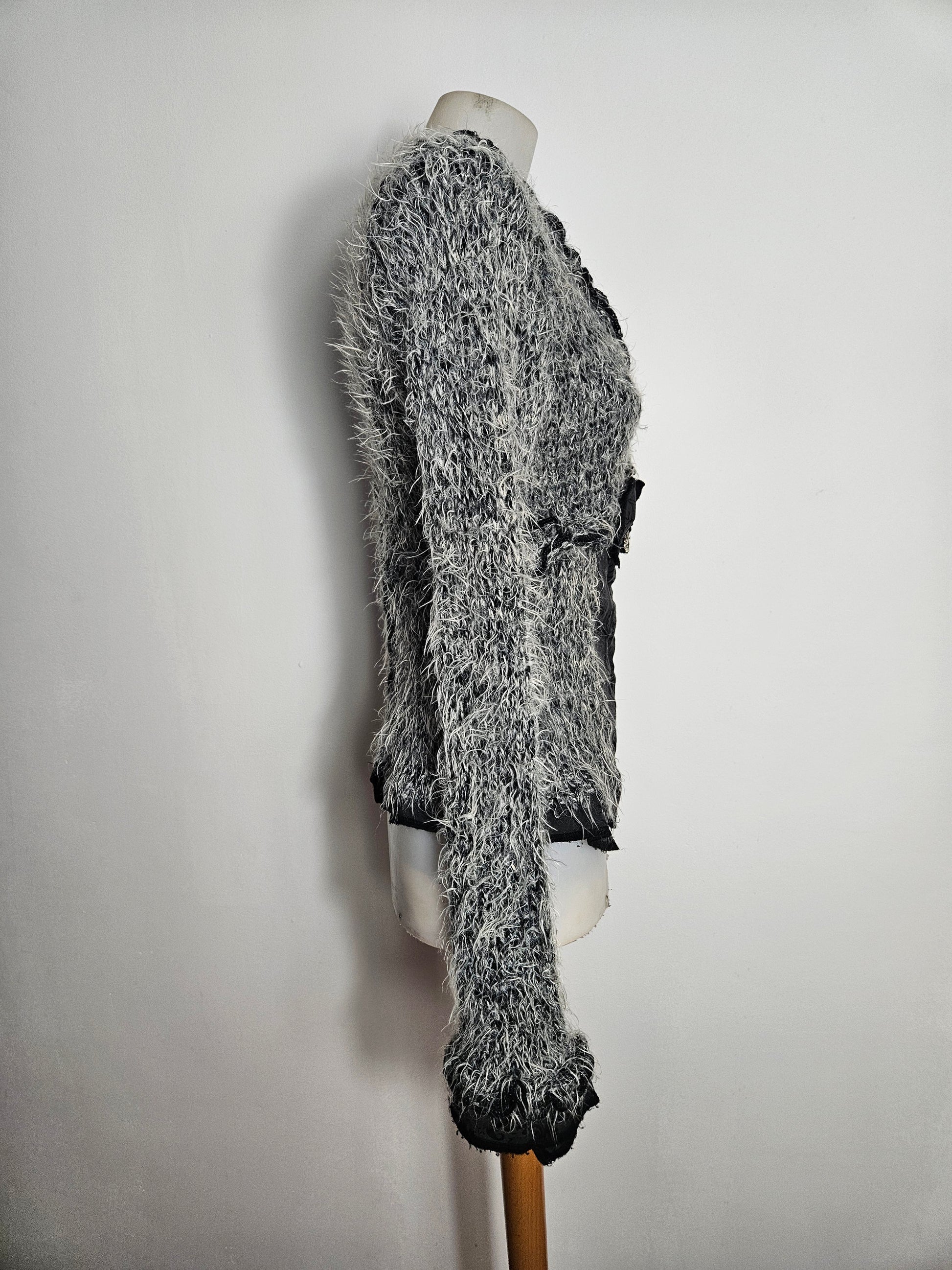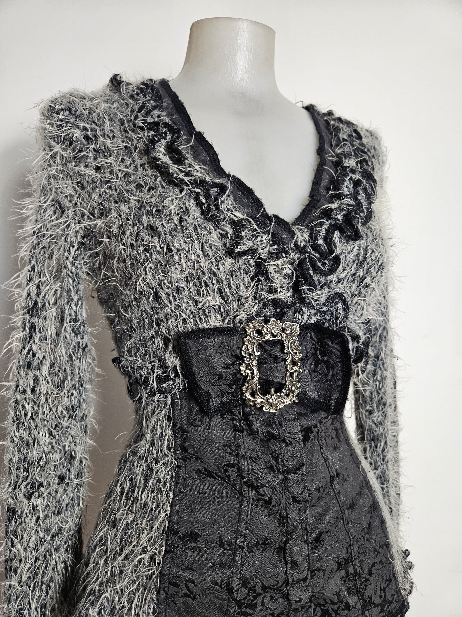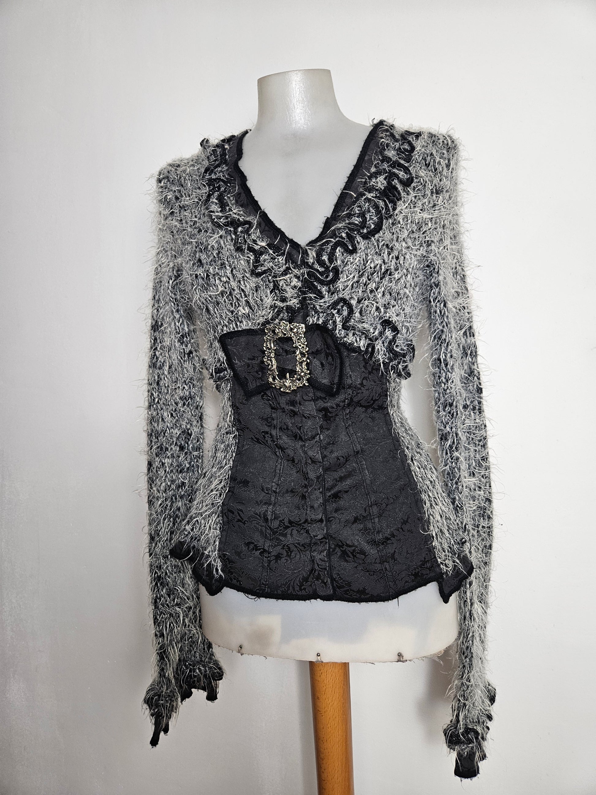 Haut type cardigan corseté à manches longues. Matière principale à l’aspect duveteux et texturé. Encolure en V avec finitions volantées. Partie centrale structurée effet corset avec panneaux en tissu damassé. Fermeture par agrafes sur le devant. Détail décoratif métallique à la taille. Coupe ajustée. La maille n'est pas doublée. De la marque Zone Bleue