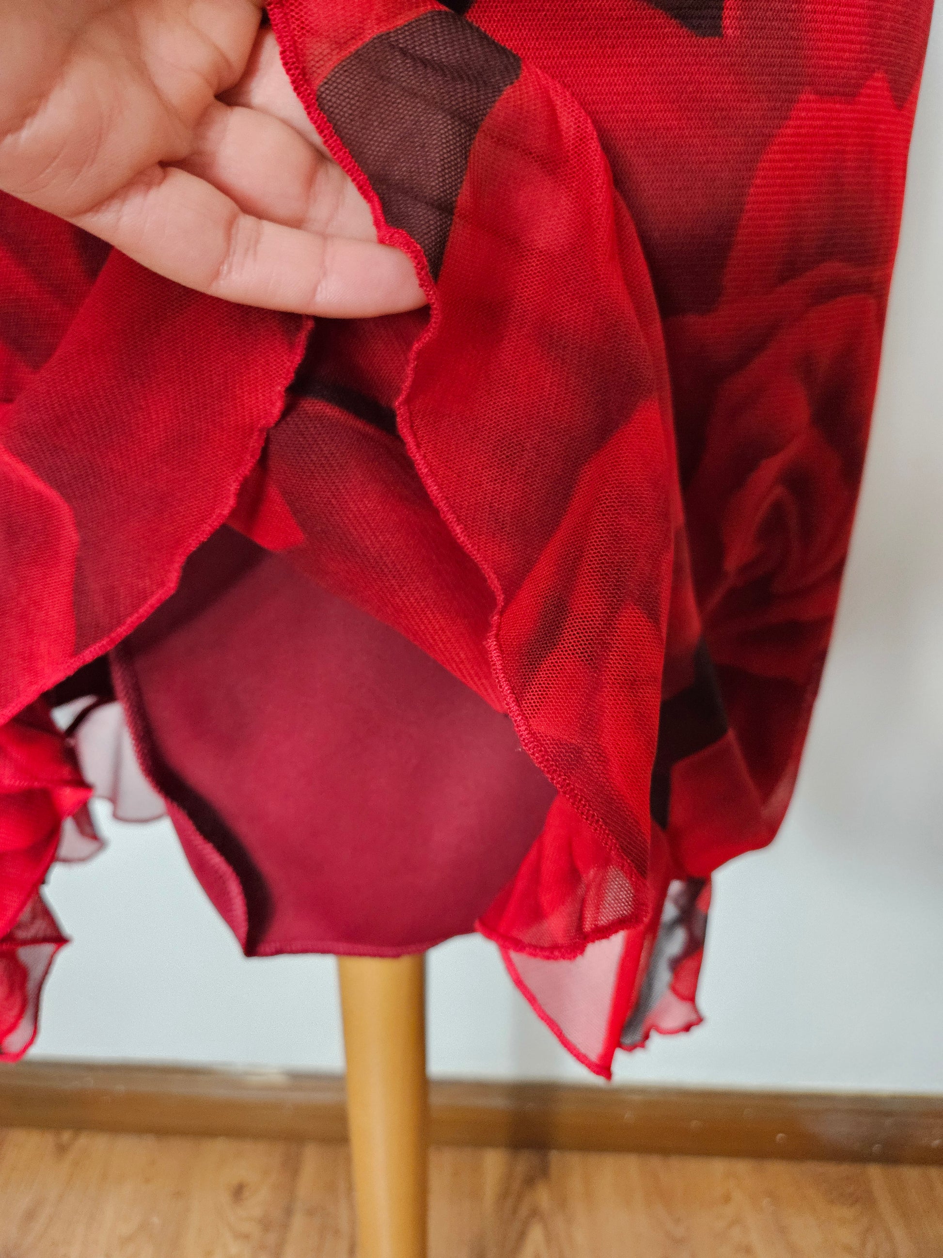 Robe rouge à fines bretelles, coupe ajustée et longueur midi. Modèle imprimé de grands motifs floraux sur l’ensemble. Ourlet légèrement évasé avec finition volantée en bas. Tissu léger en voile avec doublure opaque.