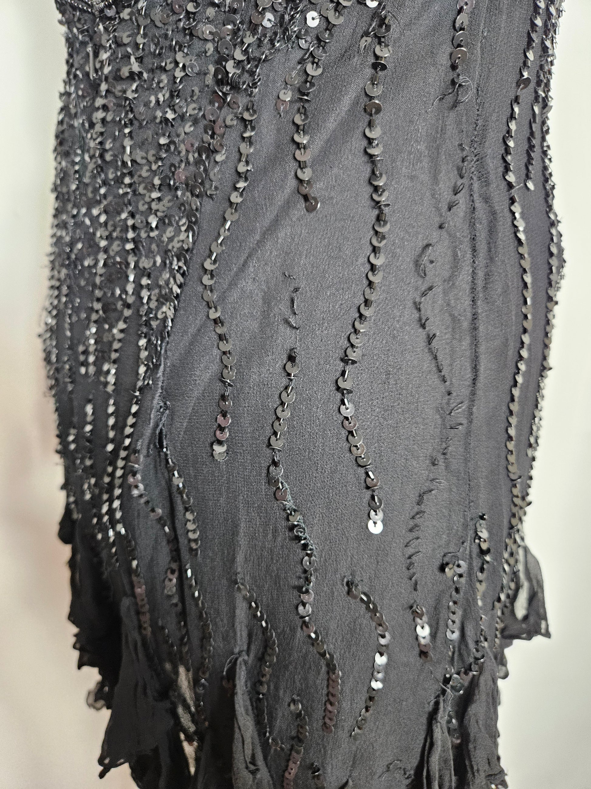 - Robe vintage noire asymétrique à sequins, avec encolure halter et dos largement dégagé.