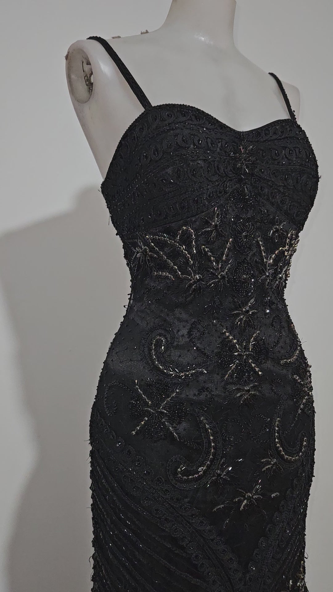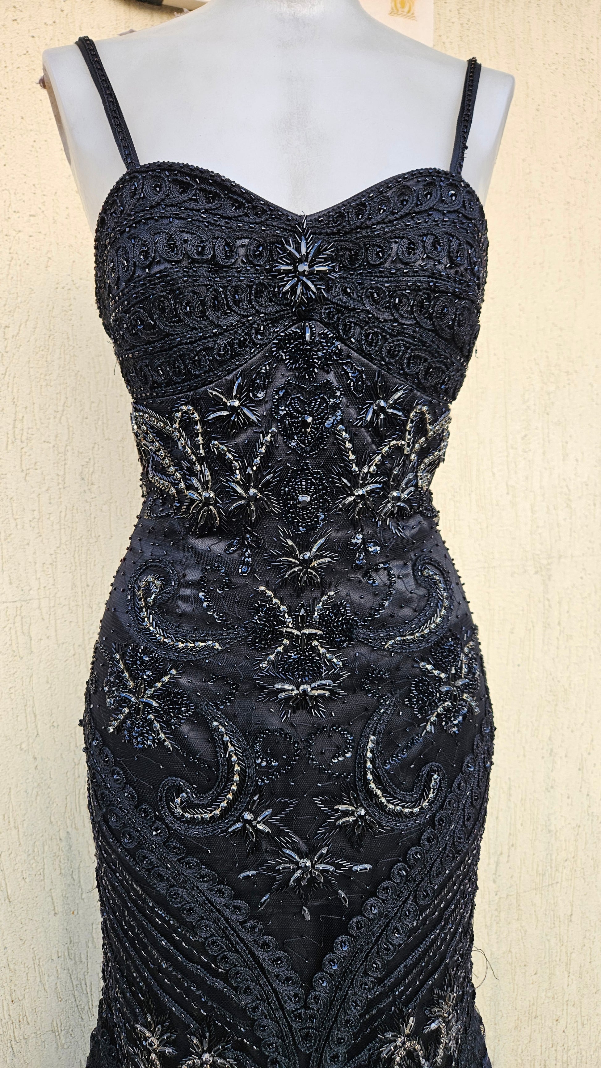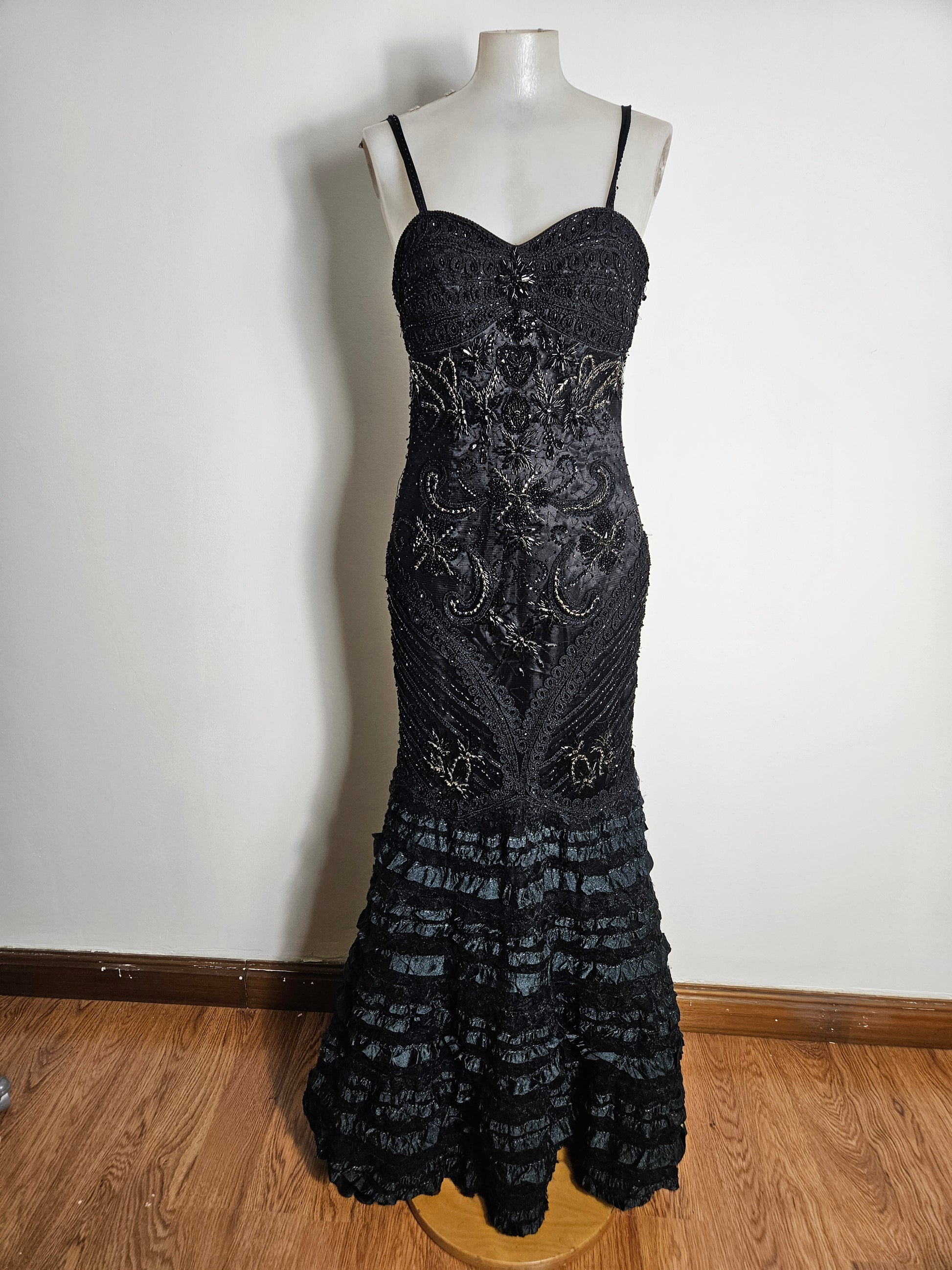 Robe longue à fines bretelles, avec décolleté cœur. Modèle près du corps sur le haut et les hanches. Tissu noir décoré de broderies et perles formant des motifs floraux et arabesques. Bas de robe évasé avec superposition de volants et bandes texturées en noir et gris foncé. Ourlet légèrement asymétrique. Fermeture par zip sur le côté gauche.