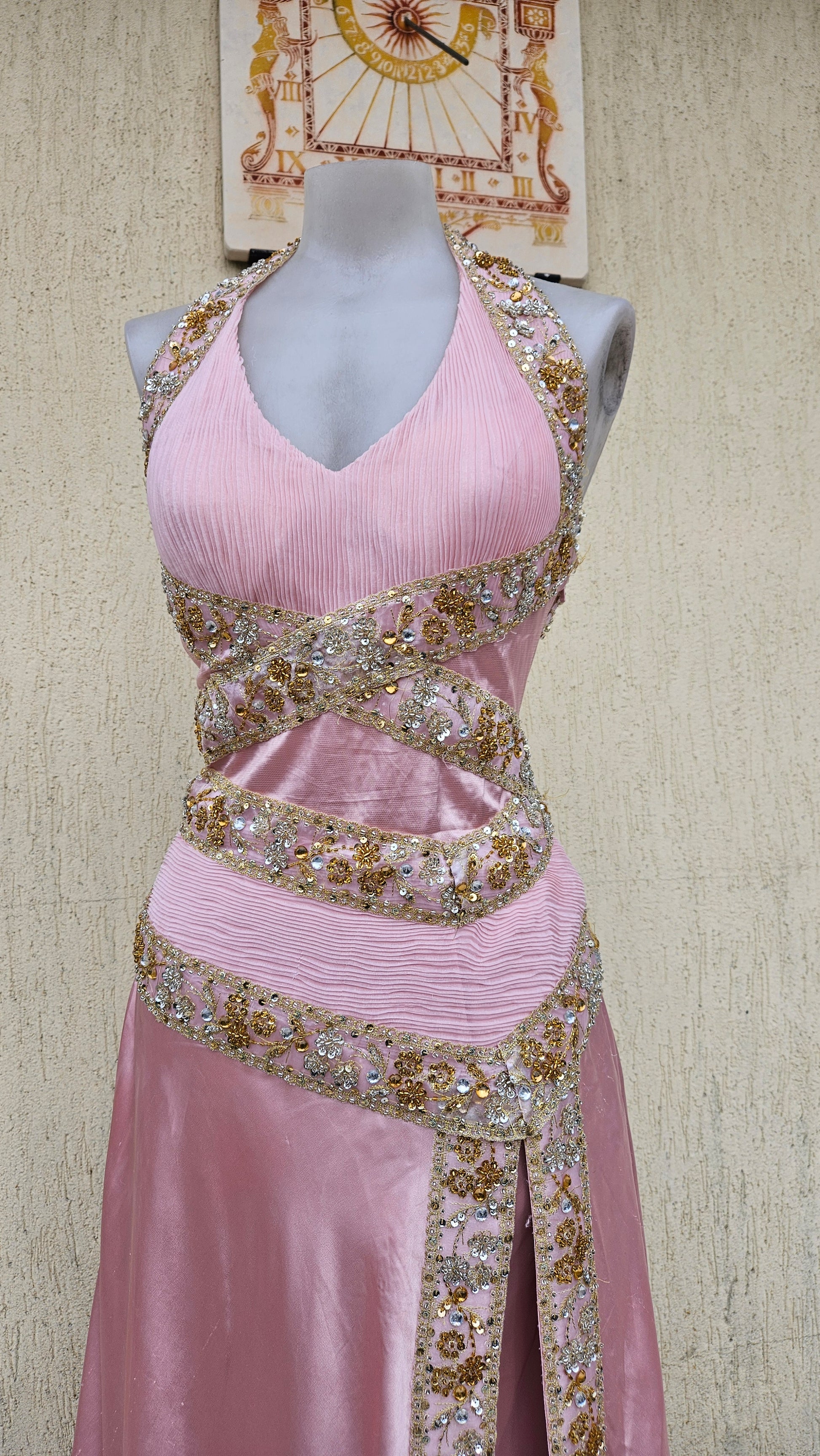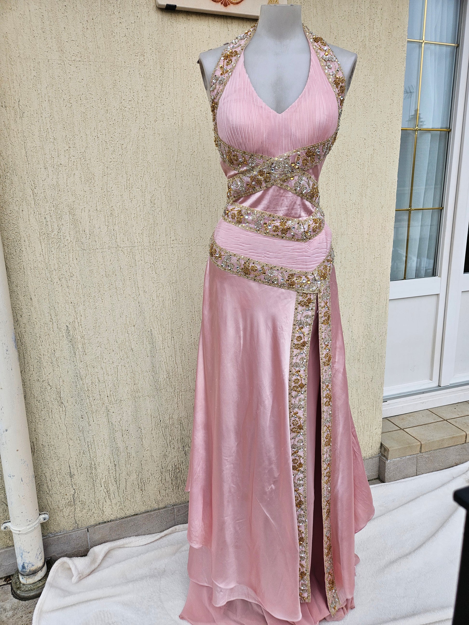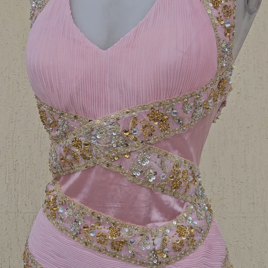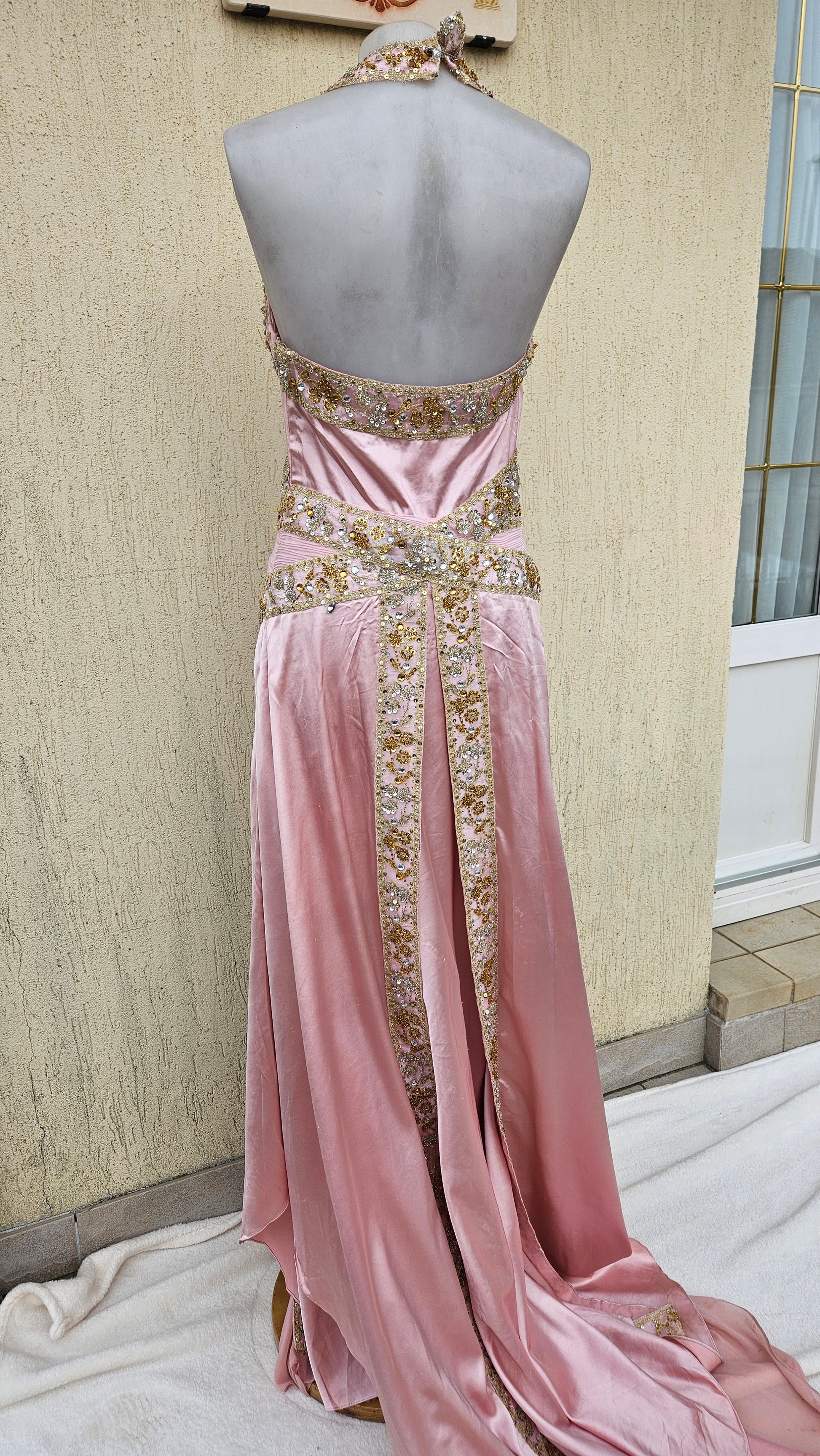 Robe longue de soirée de couleur rose poudré. Modèle dos nu avec encolure en V sur le devant et lien tour de cou. La robe présente des découpes à la taille et une jupe fluide avec fente sur le devant. Ornements brodés et perlés de couleur dorée disposés sur les bretelles, la taille et le long de la fente. Fermeture par liens au niveau du cou. Longueur maxi avec tombé souple et traine.