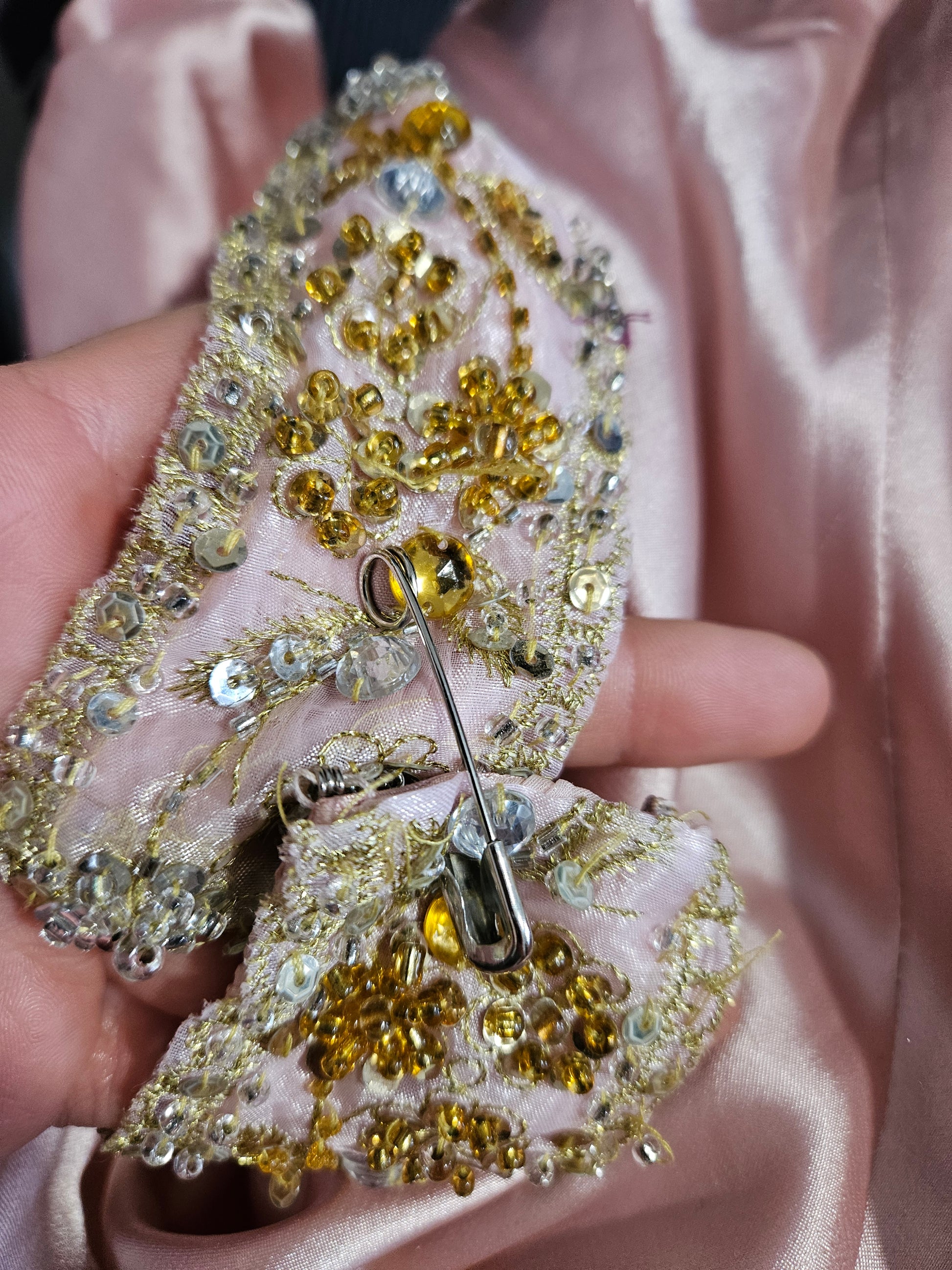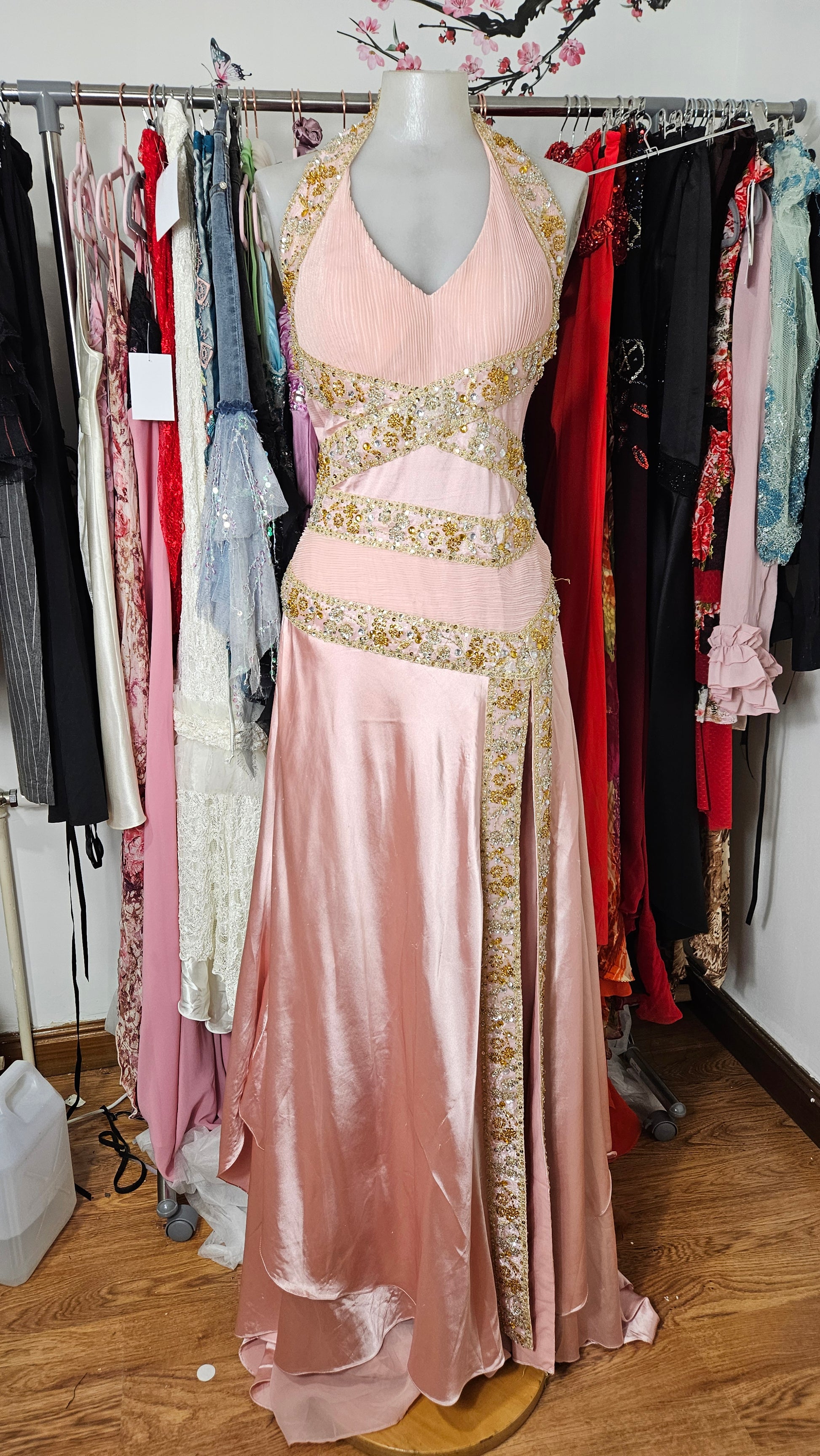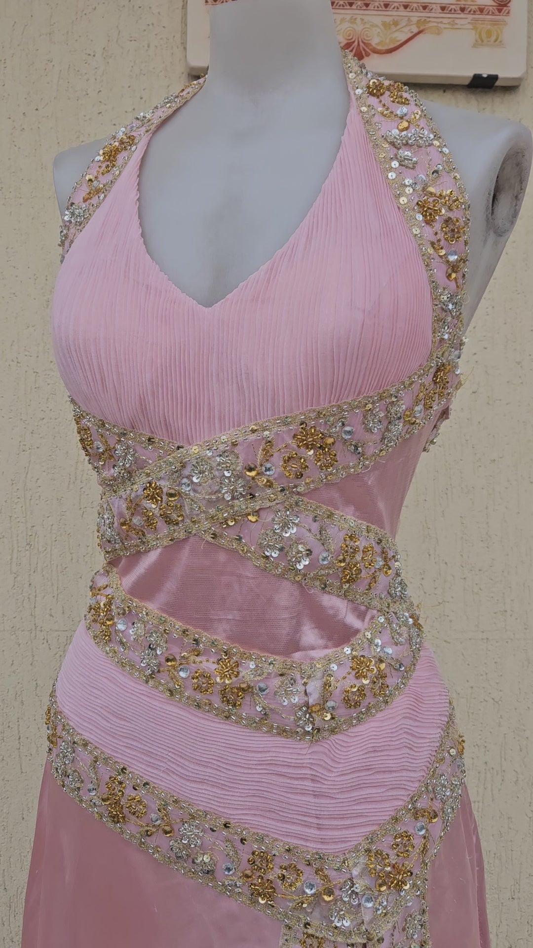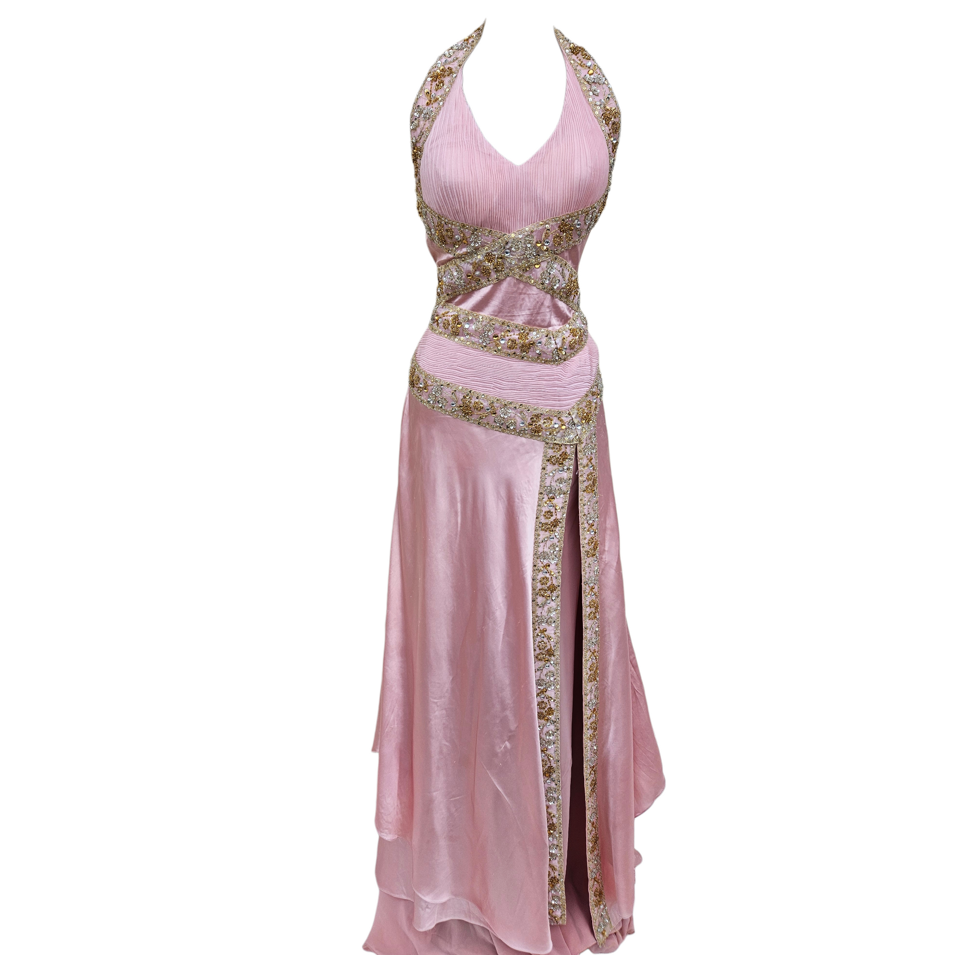 Robe longue de soirée de couleur rose poudré. Modèle dos nu avec encolure en V sur le devant et lien tour de cou. La robe présente des découpes à la taille et une jupe fluide avec fente sur le devant. Ornements brodés et perlés de couleur dorée disposés sur les bretelles, la taille et le long de la fente. Fermeture par liens au niveau du cou. Longueur maxi avec tombé souple et traine.